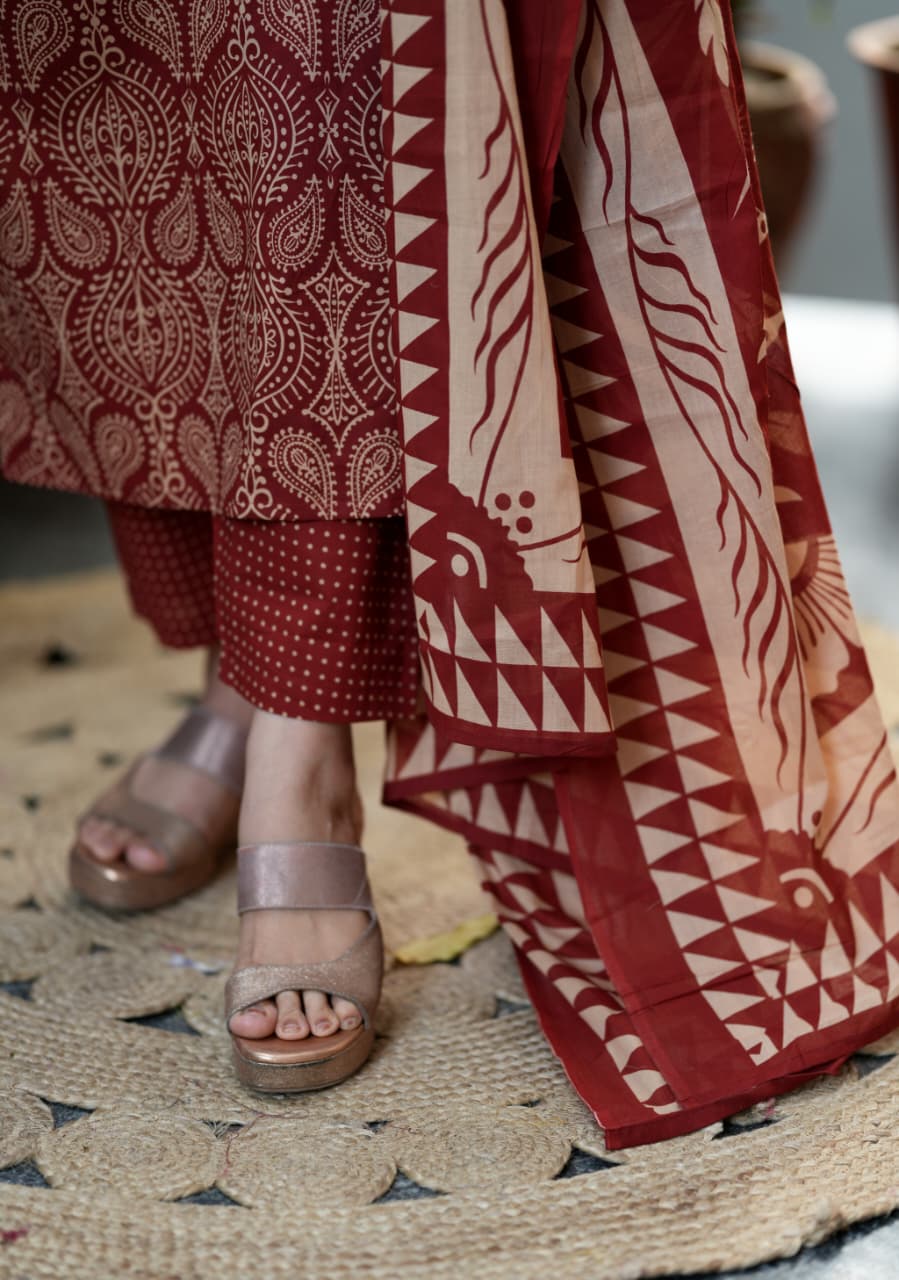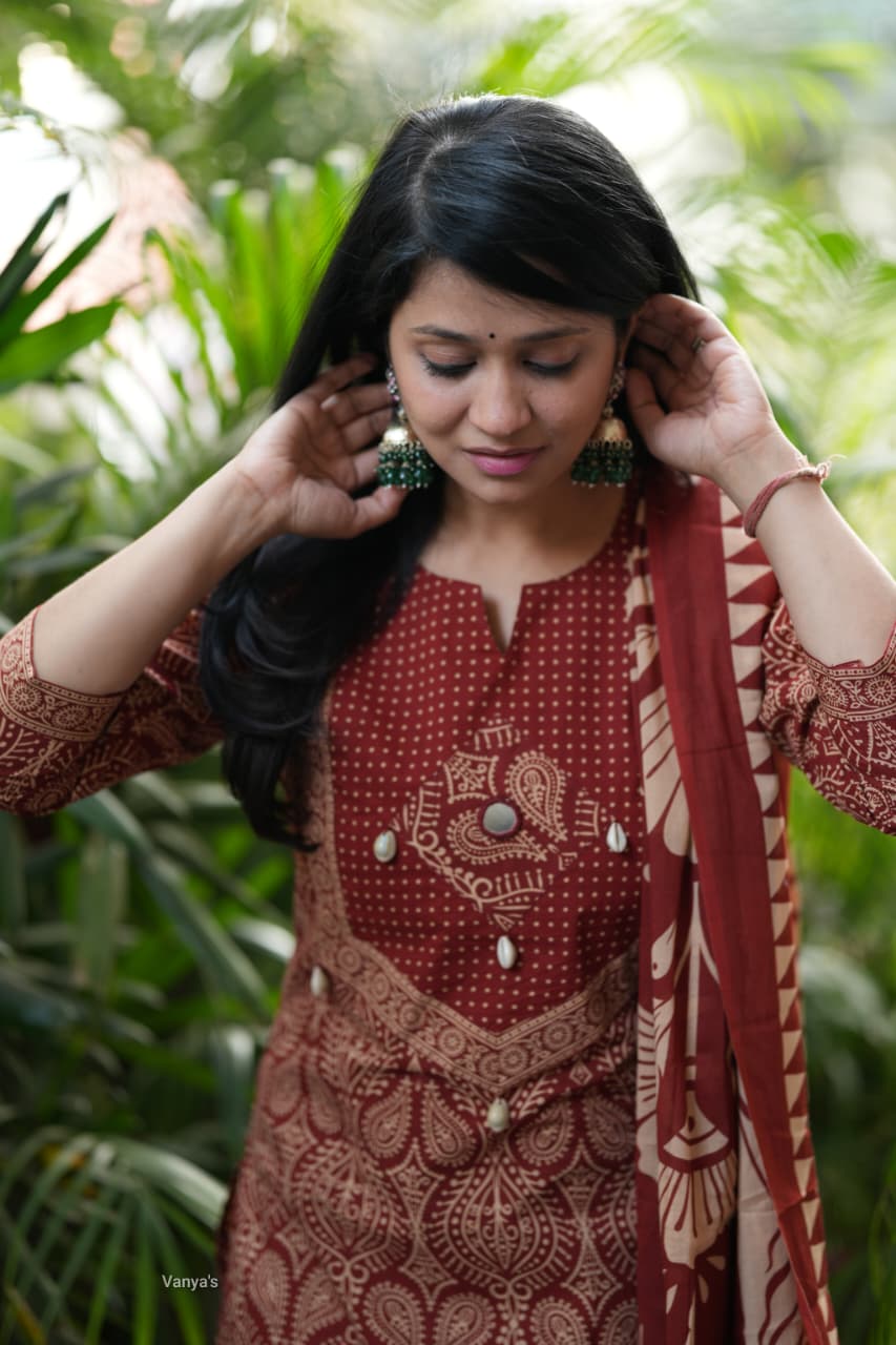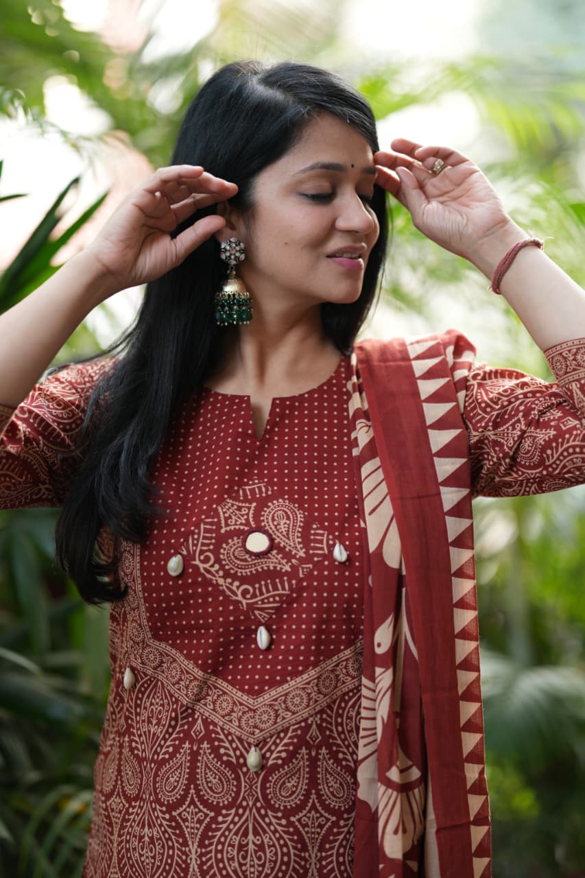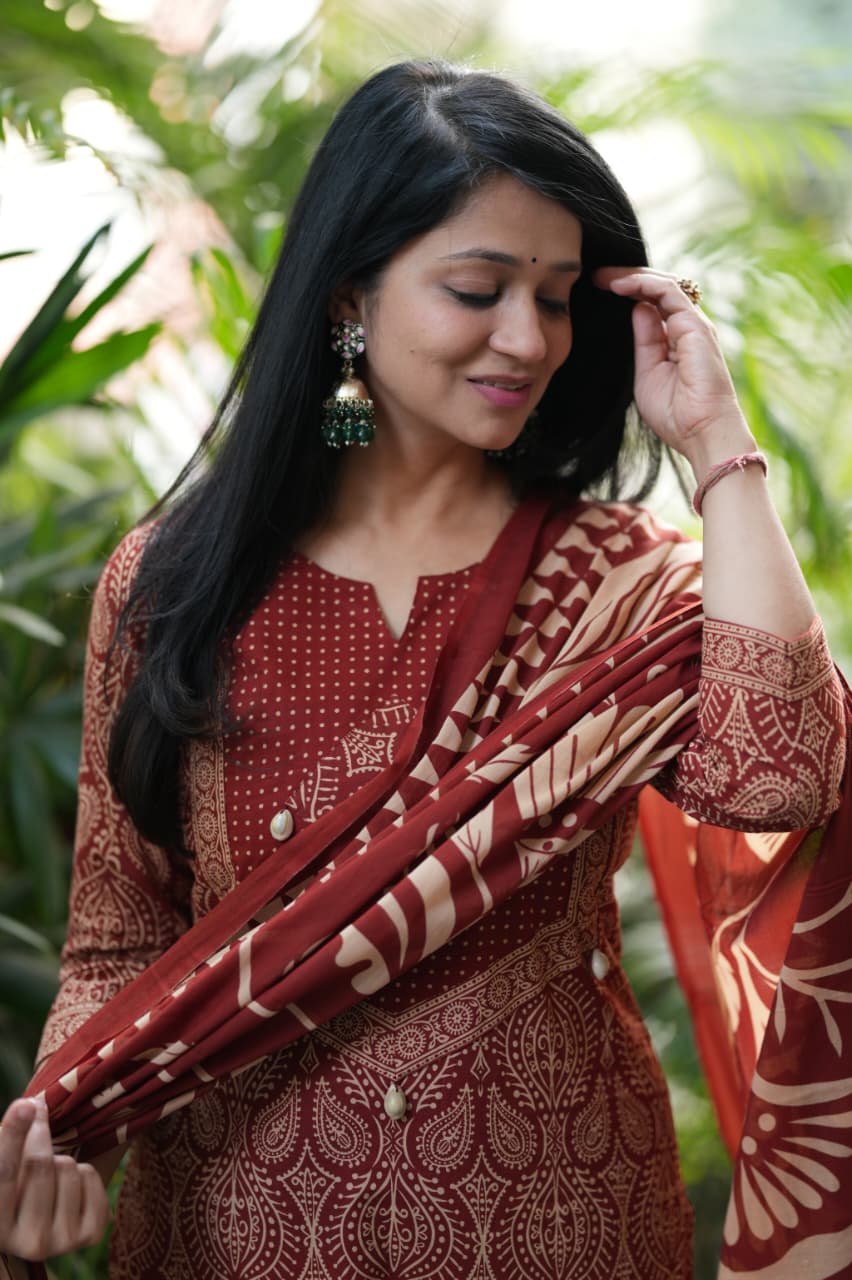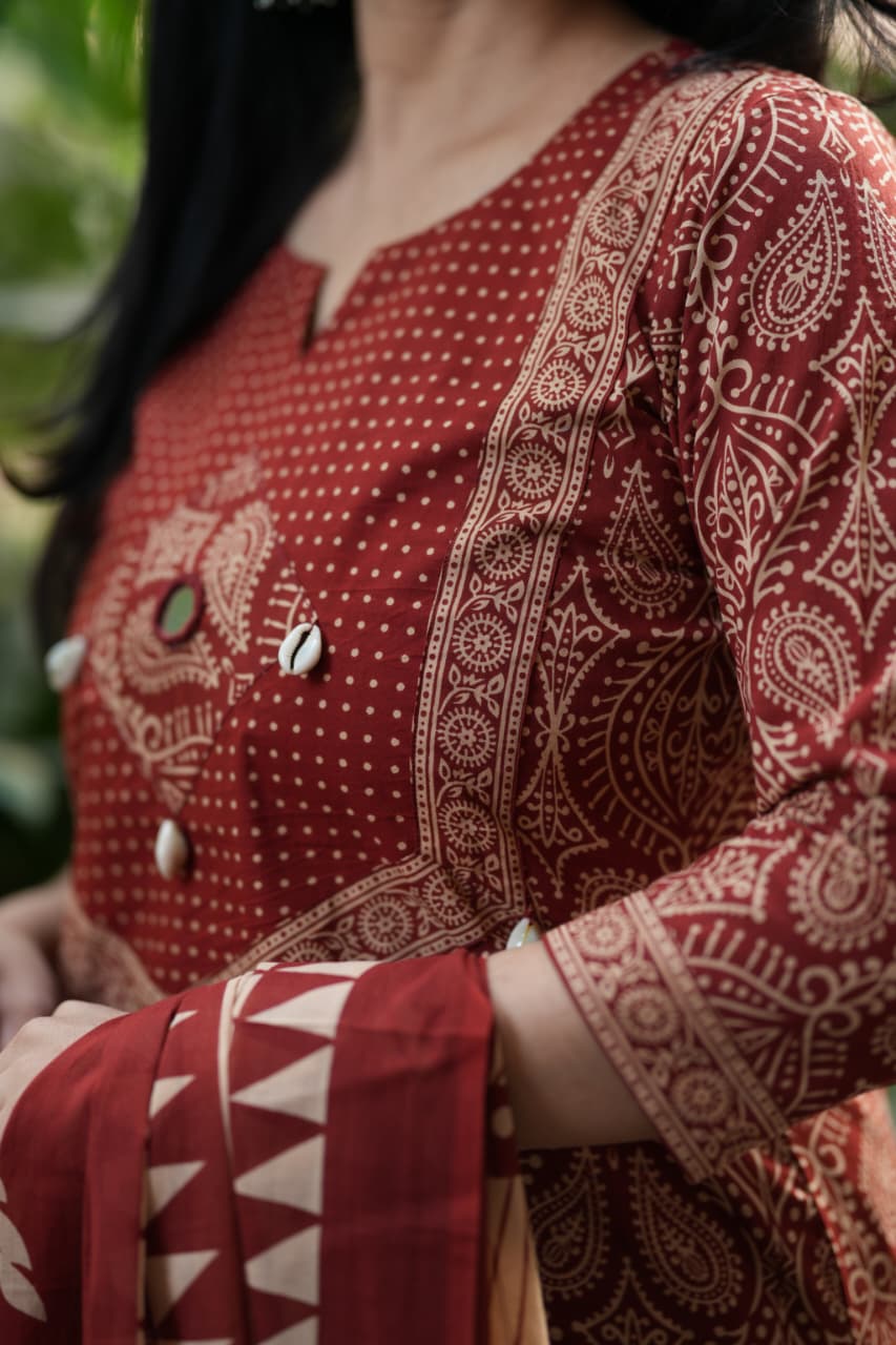 Adorn your appearance with this stunning ajrak cotton printed three piece suit , this kurta elegant as it looks!