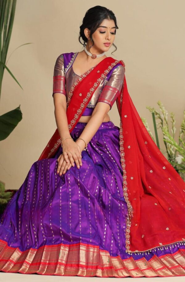 Celebrate this festive season in style with the stunning Gita Pethani Lehenga Set in Purple. Adorned with intricate handwork on the yoke and 3/4th sleeves, this vibrant lehenga is accentuated by a broad pattu border along its edge. Completing the ensemble is a 3-meter georgette dupatta, beautifully embellished with peacock Butti work.