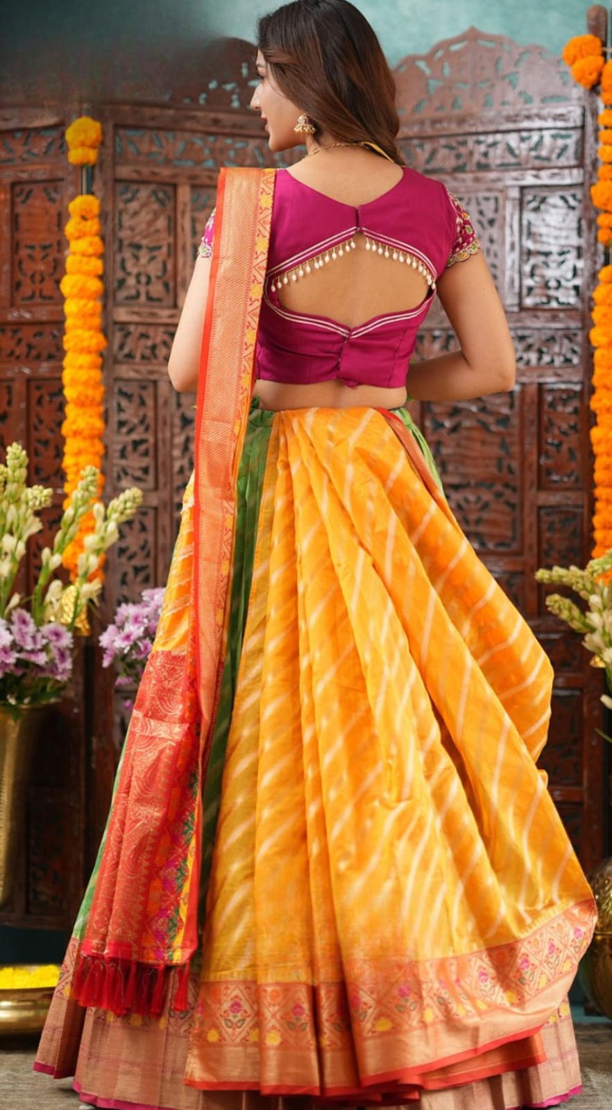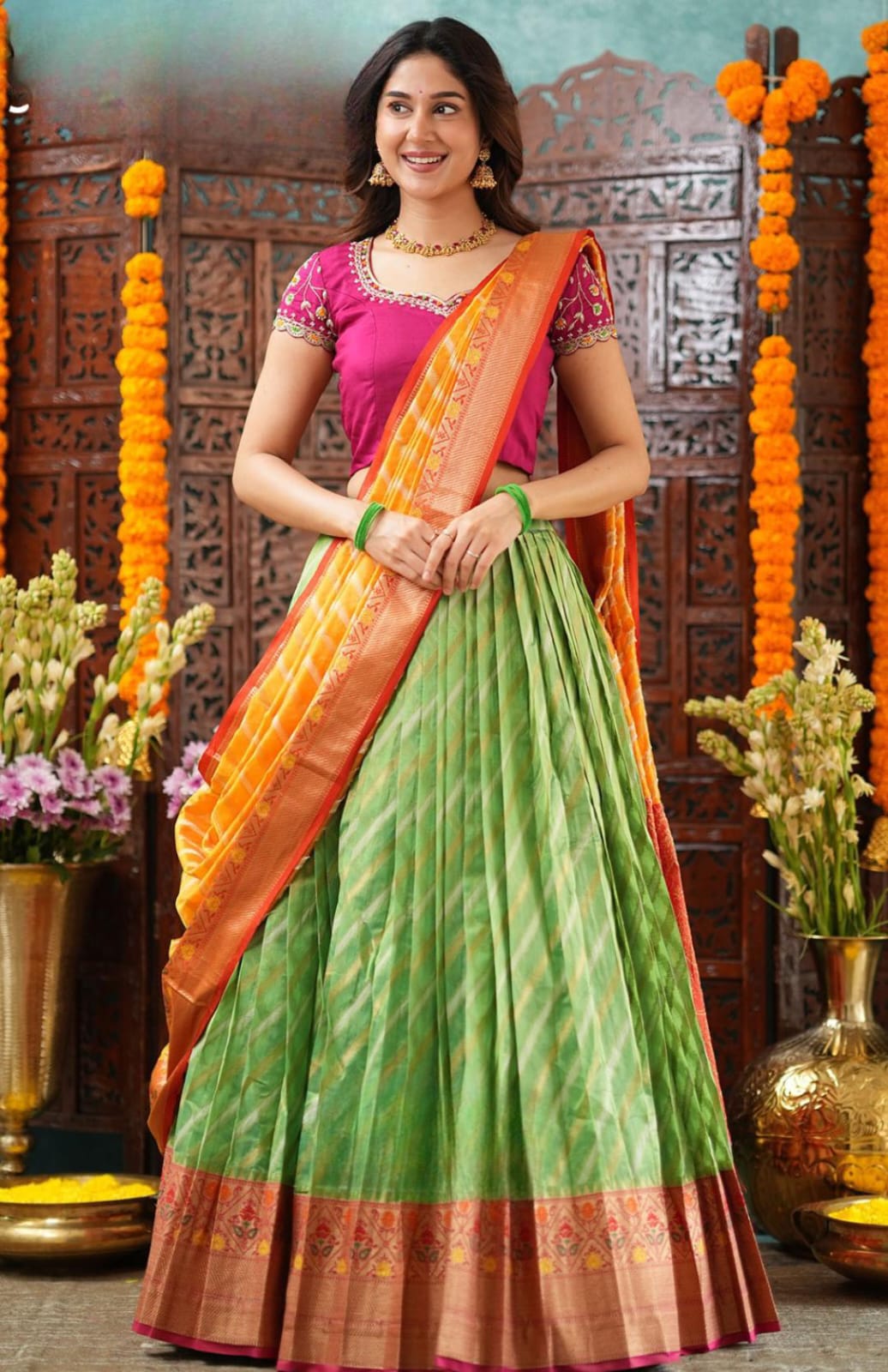 ✨ Look 2: Transform the same saree into a dupatta, paired with the lehenga and blouse for a regal festive look.