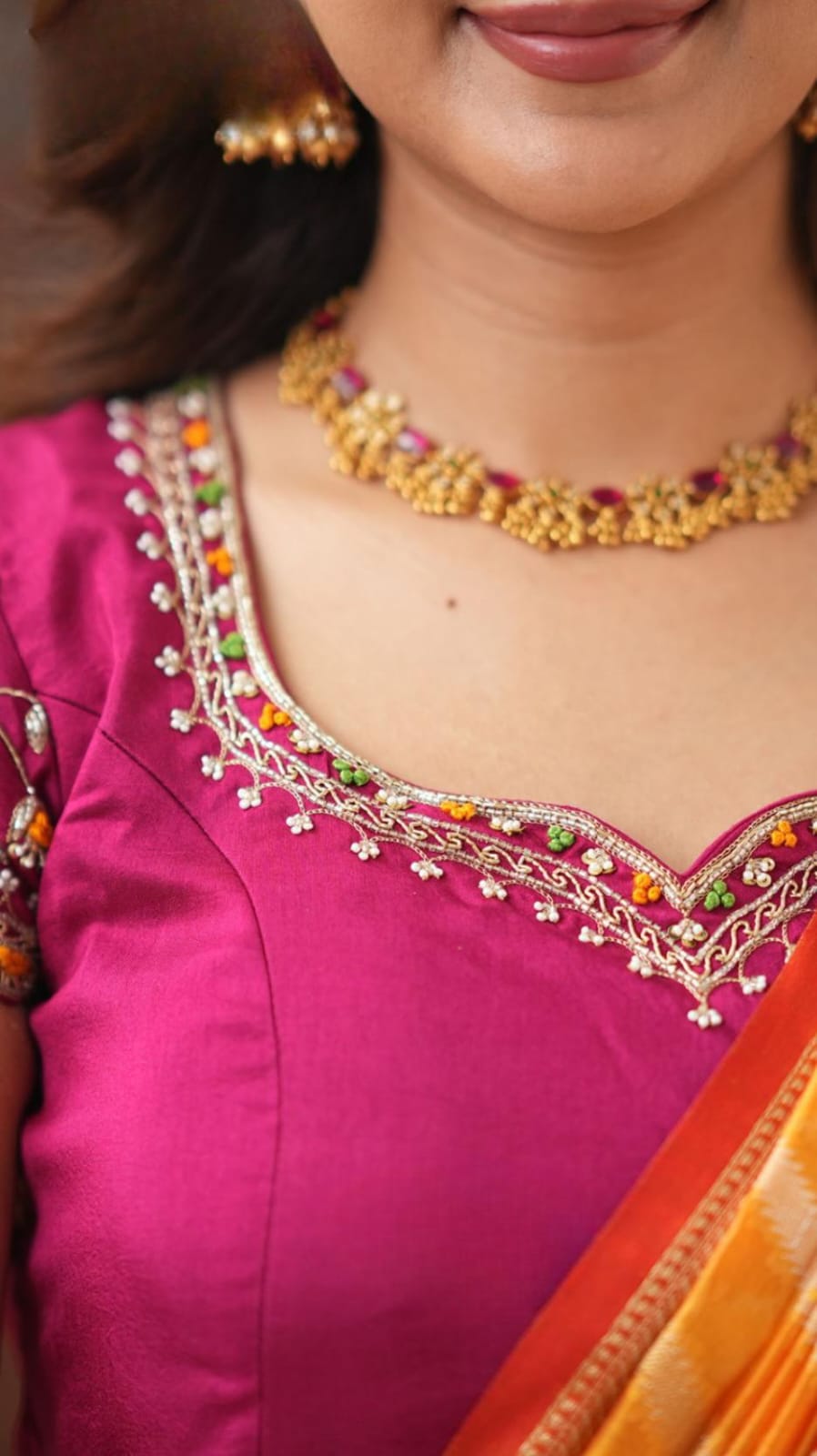 ✨ Look 1: Drape the 5.5-meter saree with the intricately embroidered blouse for a timeless traditional appearance.