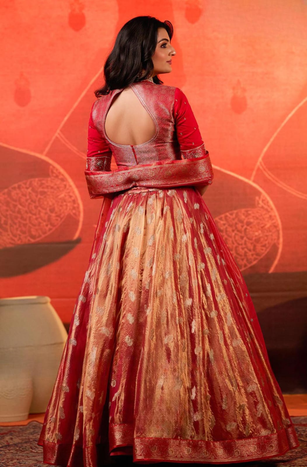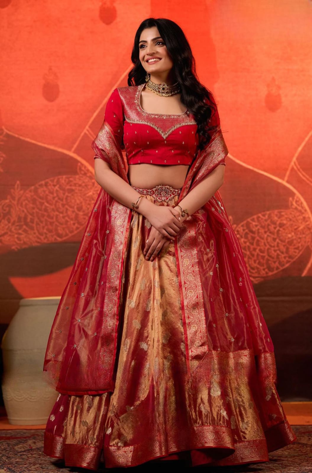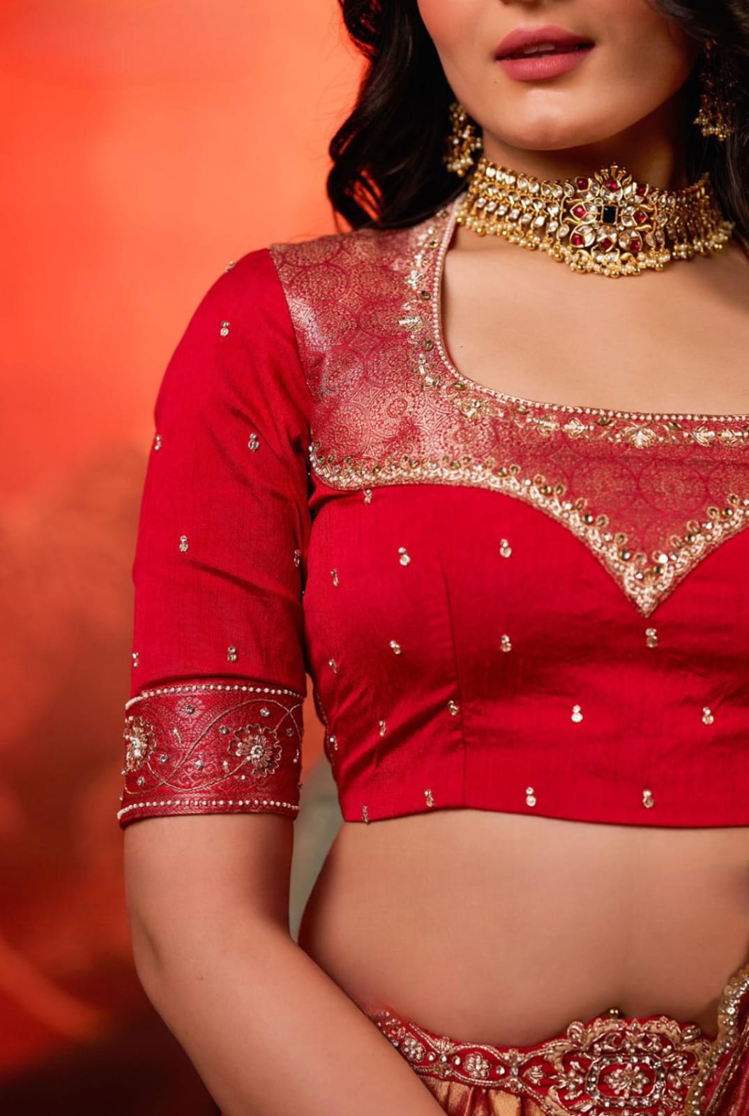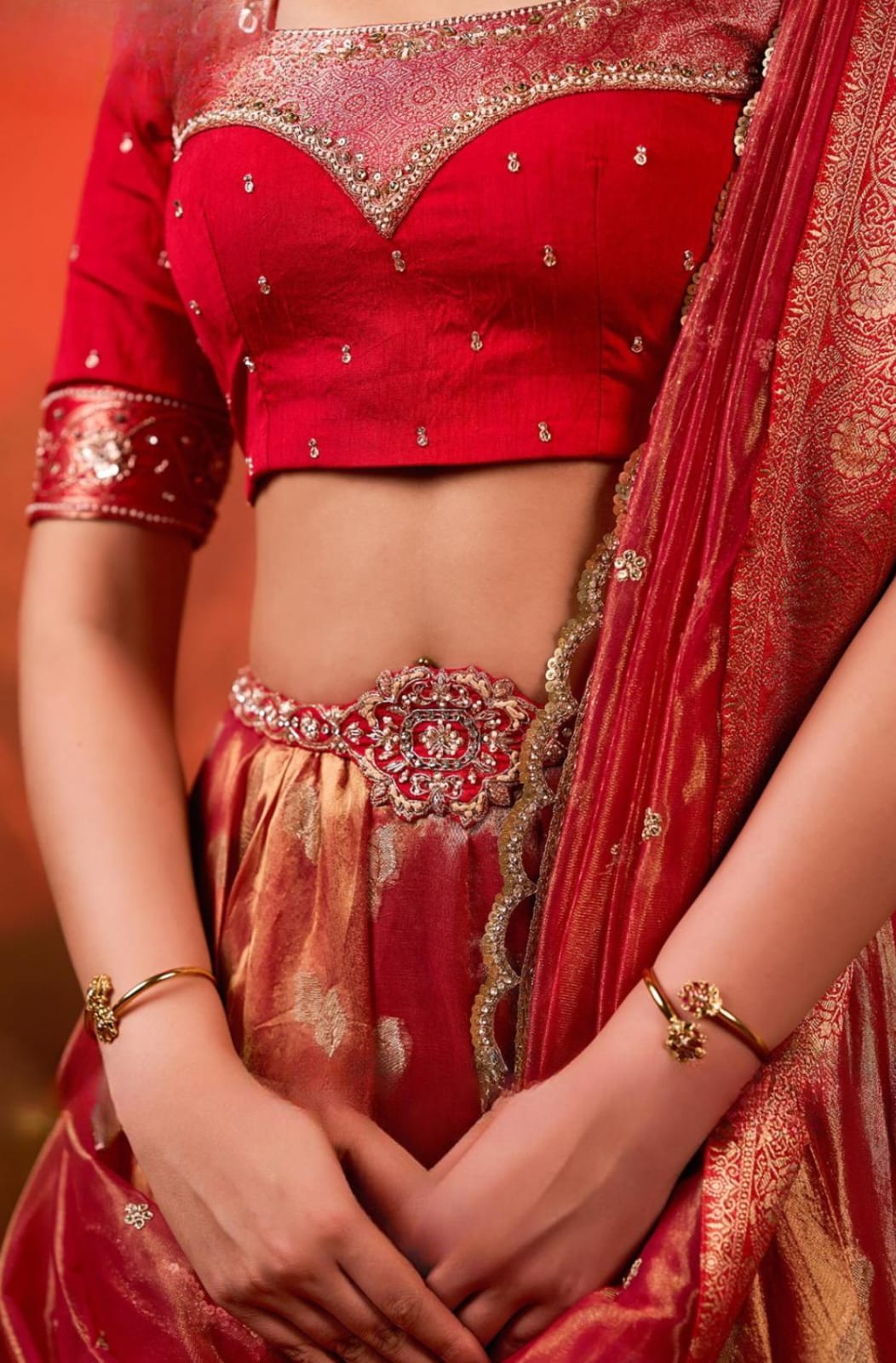 A masterpiece that tells a beauty, this Amulya red Tissue Zari lehenga set is designed for the modern-day goddess. This lehenga set blouse comes with a sweetheart neckline, embroidered with delicate detailing, a pleated skirt glowing in gold and deep red tones, and a decorative handwork waist belt for an added graceful look with a high neck. A dupatta has a scalloped embroidery for tradition yet a cultural vibe to celebrate more with this lehenga set. A perfect for bridal and grand ceremonial occasions because every you deserves to glow in gold and red.
