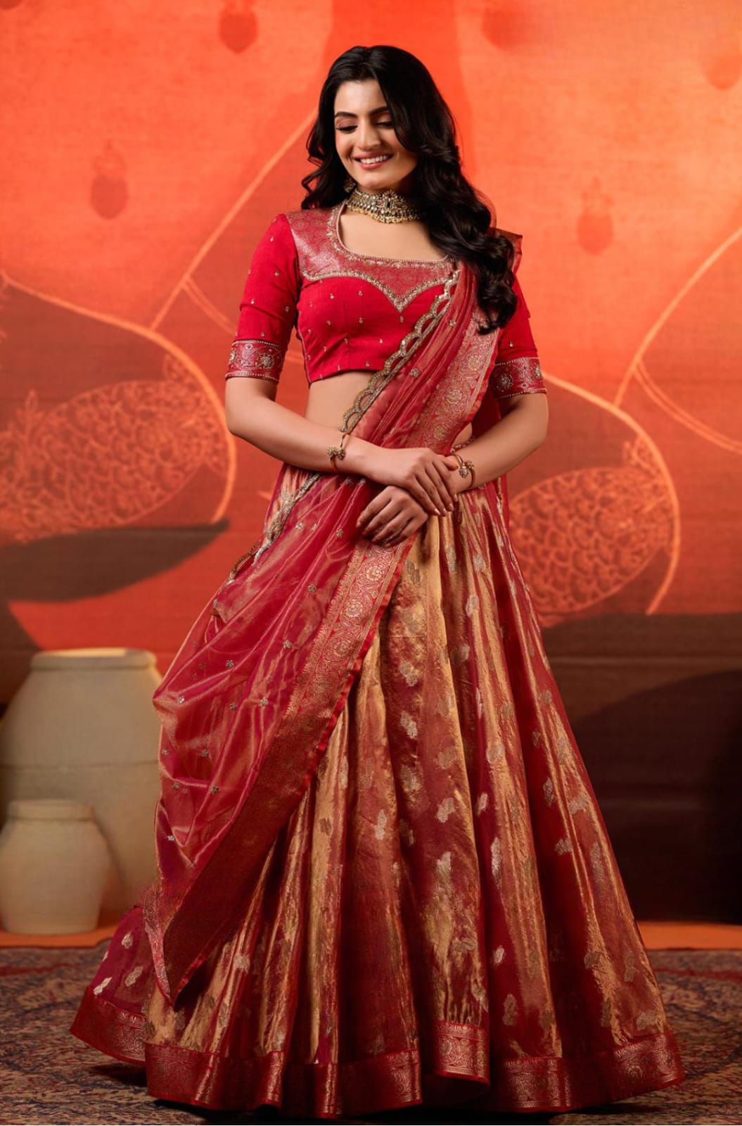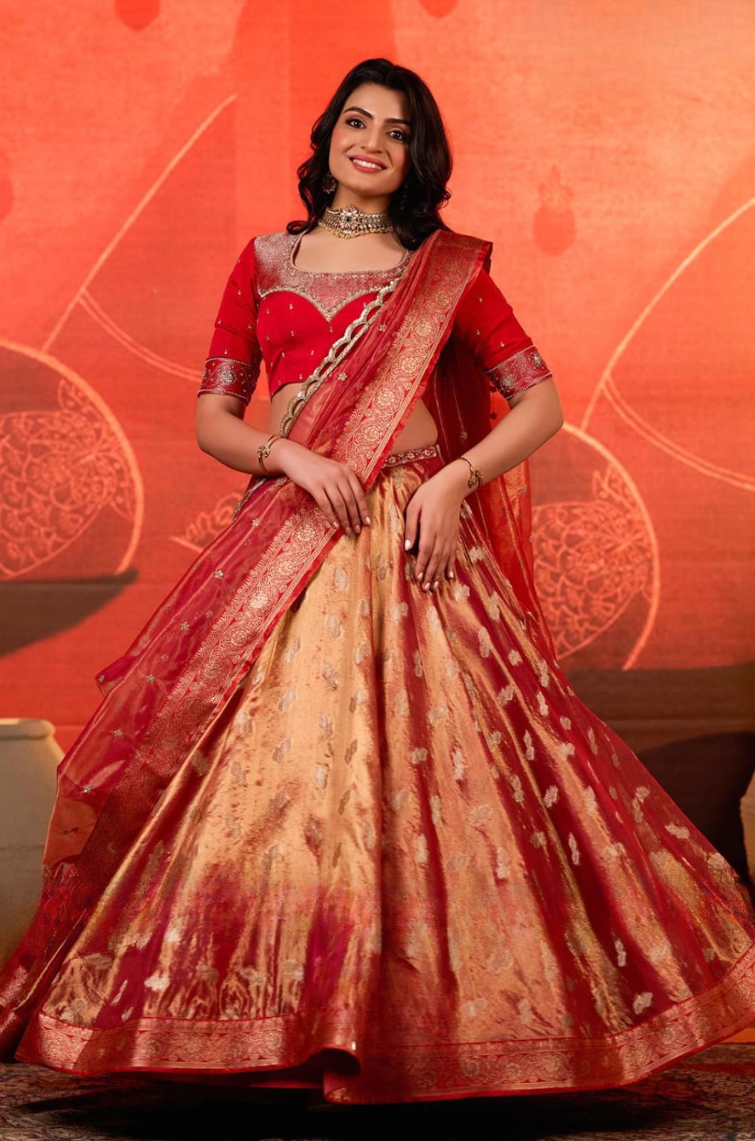 Product Name: Amulya Tissue Zari Lehenga Set in Red