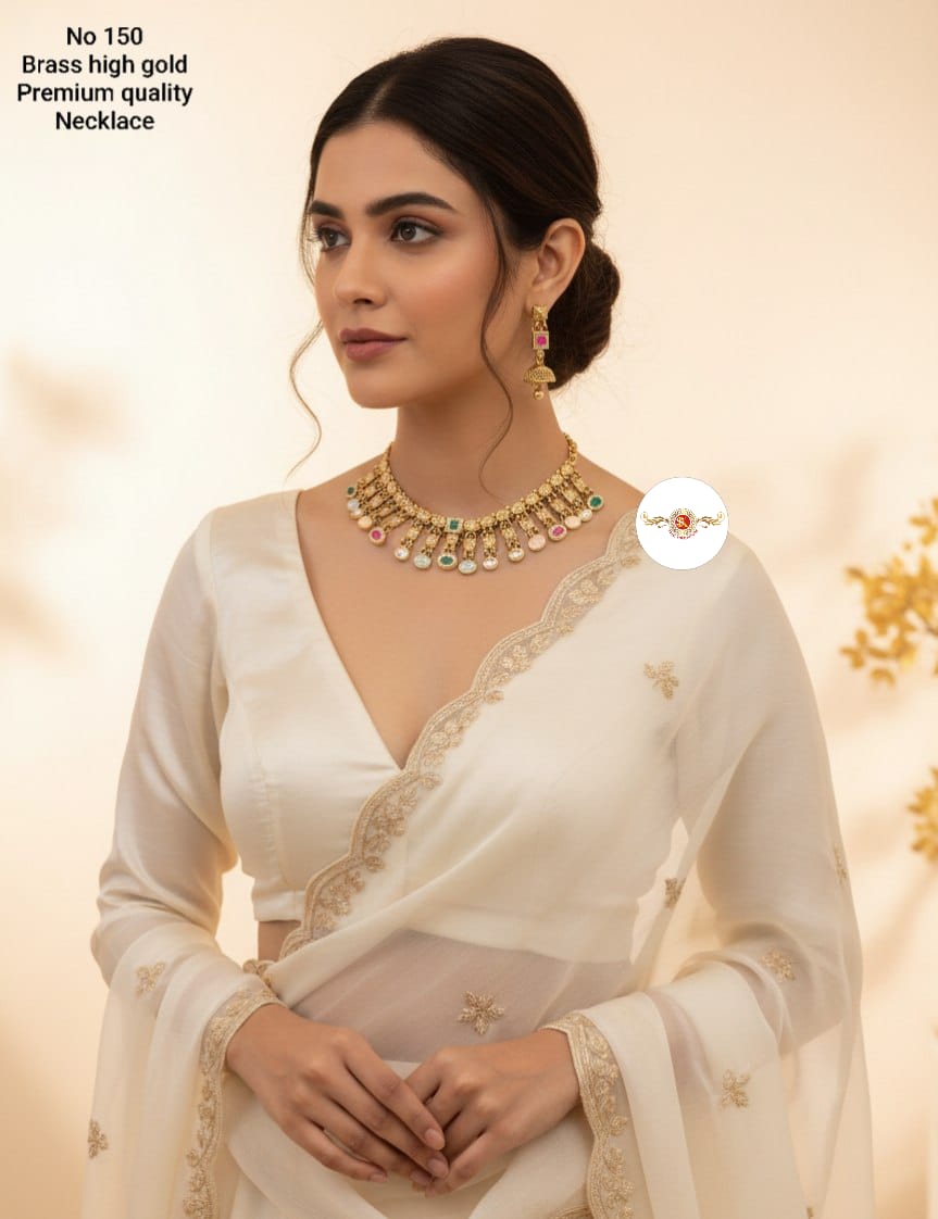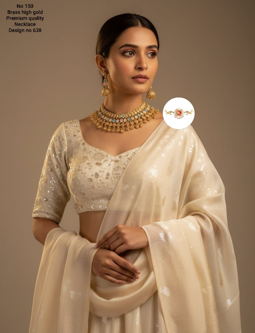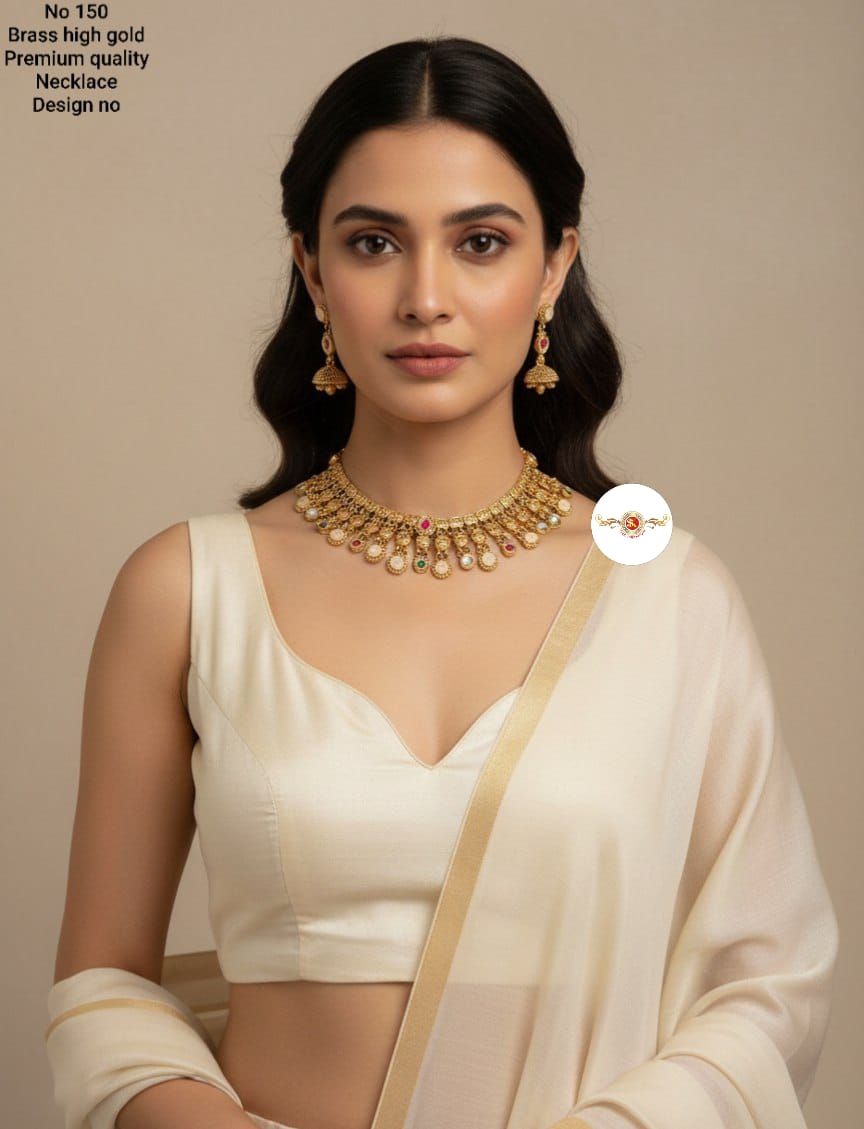 Always dry-clean pure silk saris to preserve the fabric’s sheen and colour. Avoid Washing at Home: Never machine wash; water and detergents can damage silk fibres. Store in a Cool, Dry Place: Keep saris away from direct sunlight and moisture. Wrap each sari in a soft cotton or muslin cloth before storing to allow it to breathe. Refold the sari every 3–4 months to prevent permanent creases and tearing along folds. Instead, use neem leaves or silica gel packets to prevent insects and moisture. Use a low-heat setting, or steam-iron the reverse side with a thin cloth on top. Jewellery Care Tips