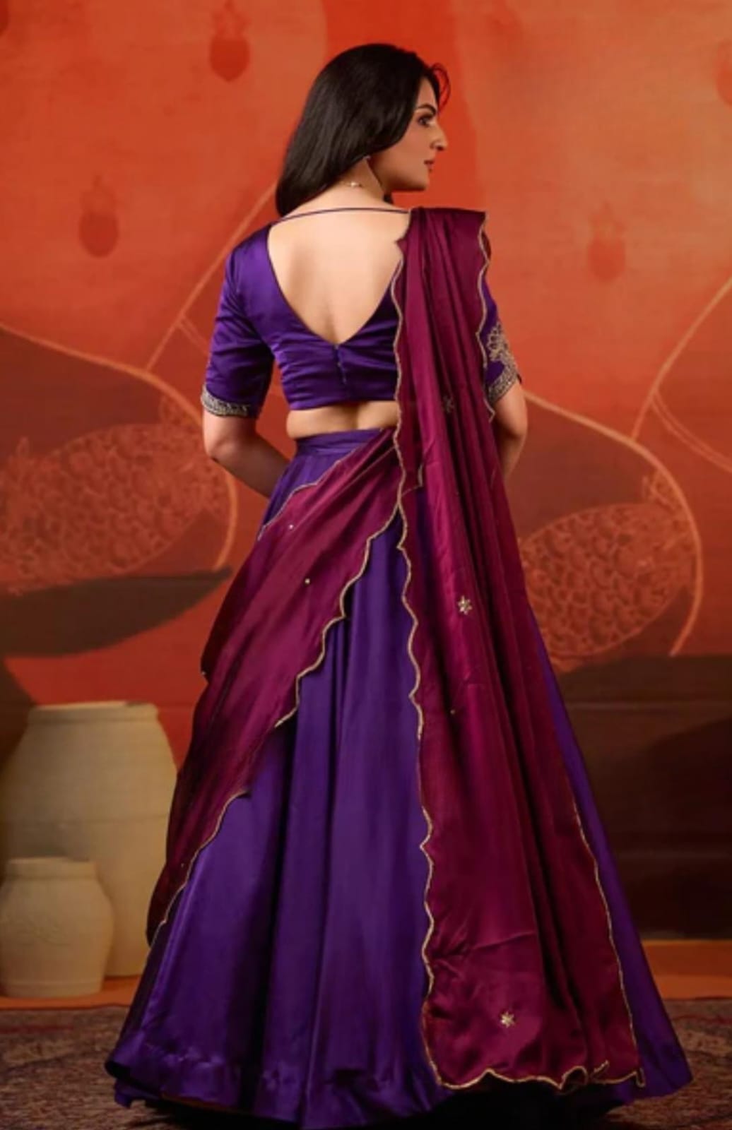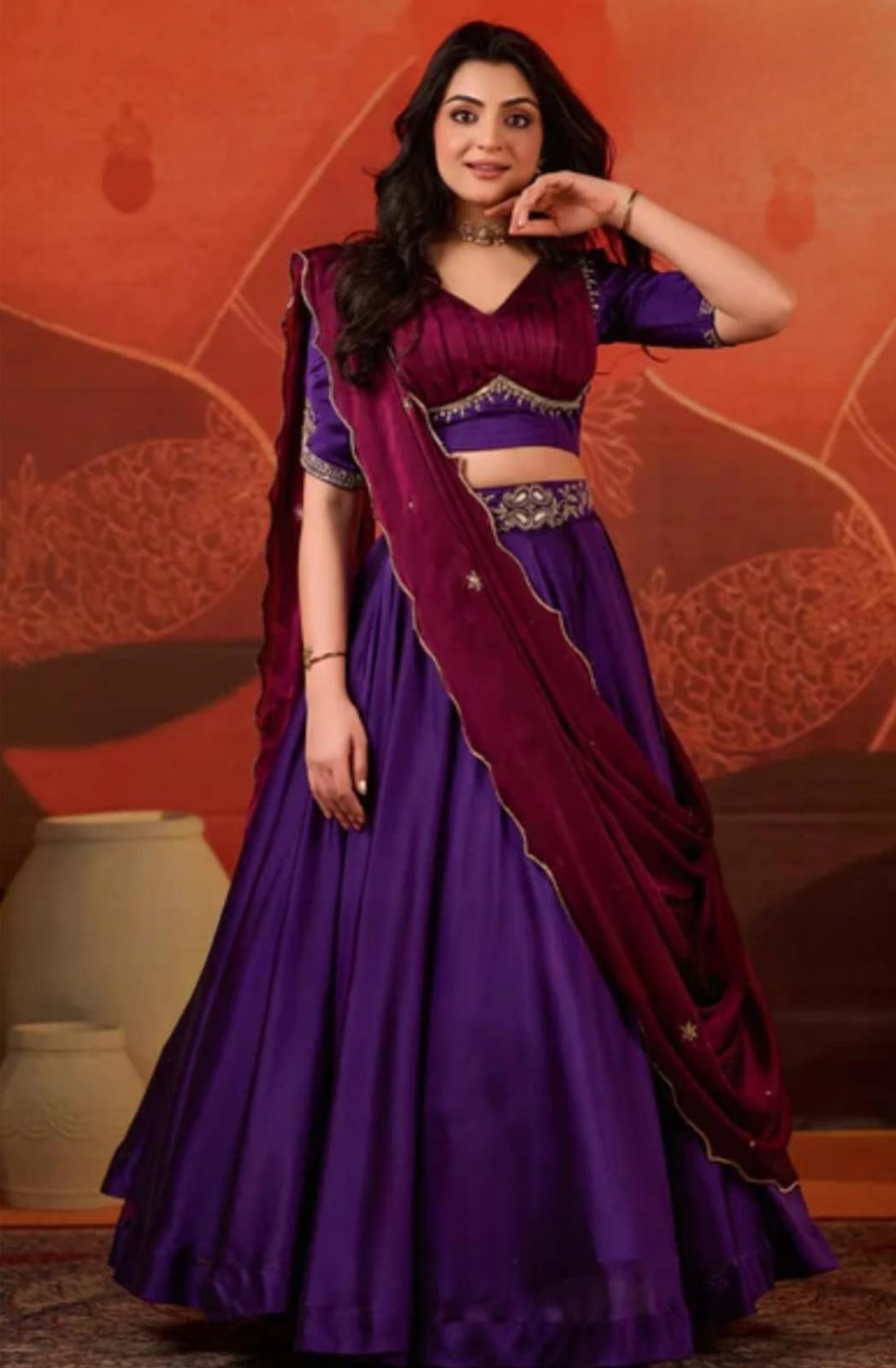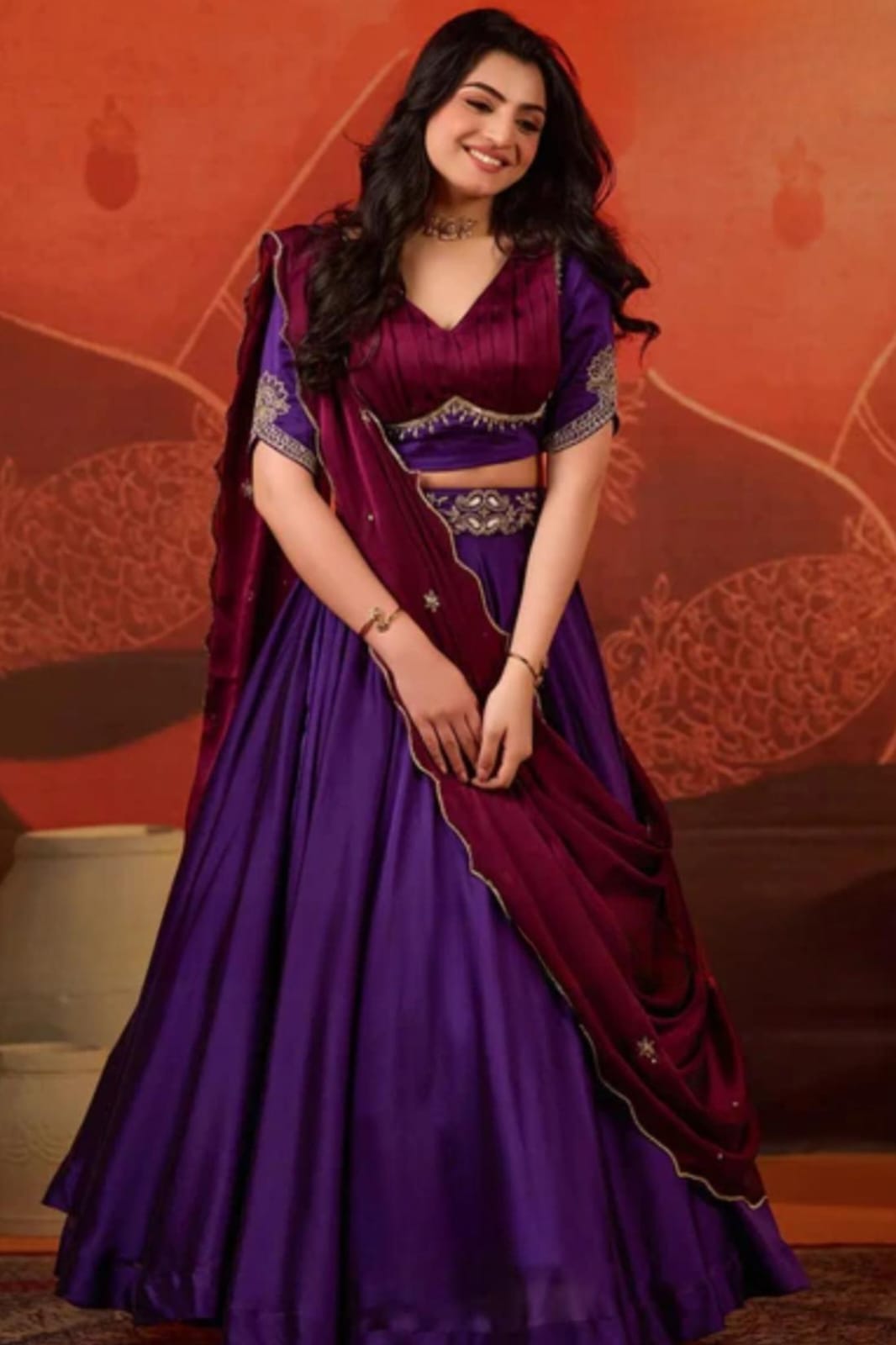 Why not wear this Ariana lehenga set for weddings, special occasions or even in festival events! Introducing a gorgeous and bright wine and purple colour, made from soft and comfortable georgette fabric. For a rich and elegant look, the 12 metre flared skirt is simple with handwork on the belt, making it appear more luxurious. In this lehenga set, the Madhubala neck comes with pleated pattern, handwork blouse has a perfect colour combination of purple and wine. The dupatta of wine colour has a beautiful scalloped pattern. Go with traditional jewellery for this lehenga set for an ethnic yet cultural vibe.