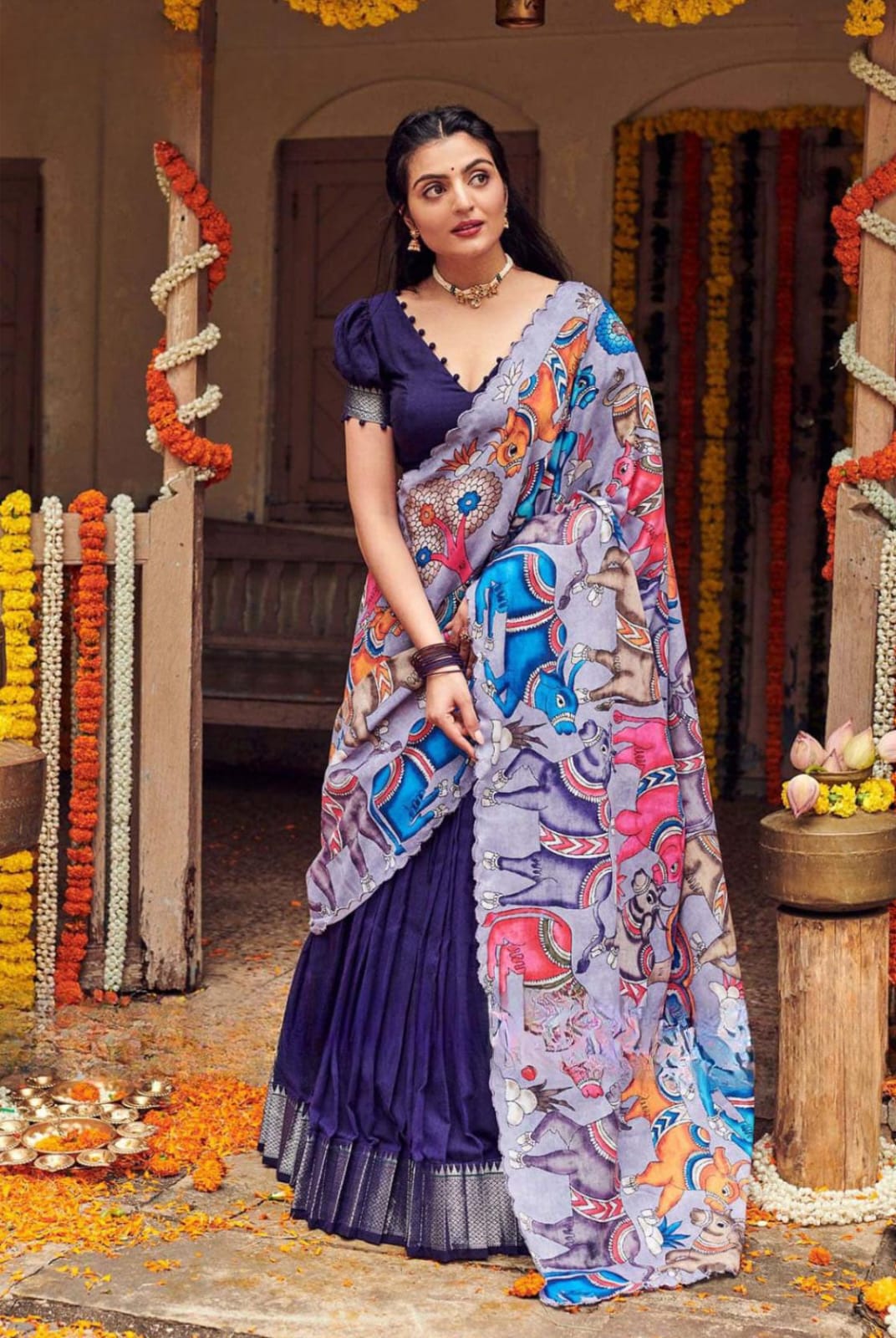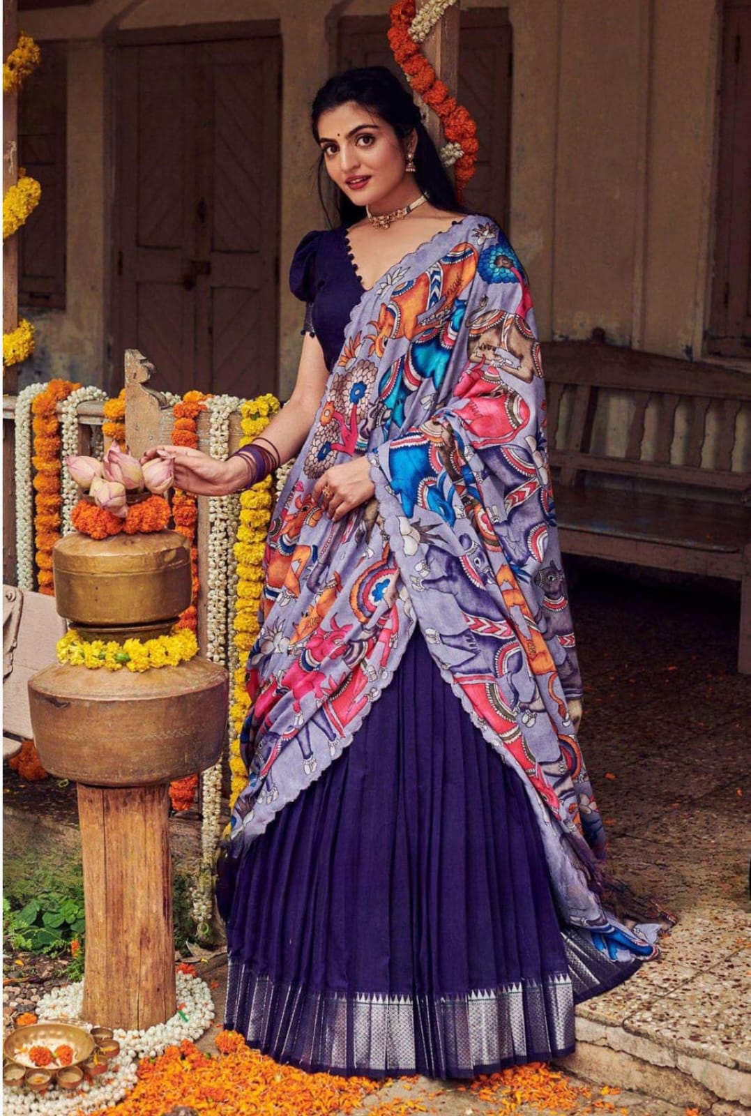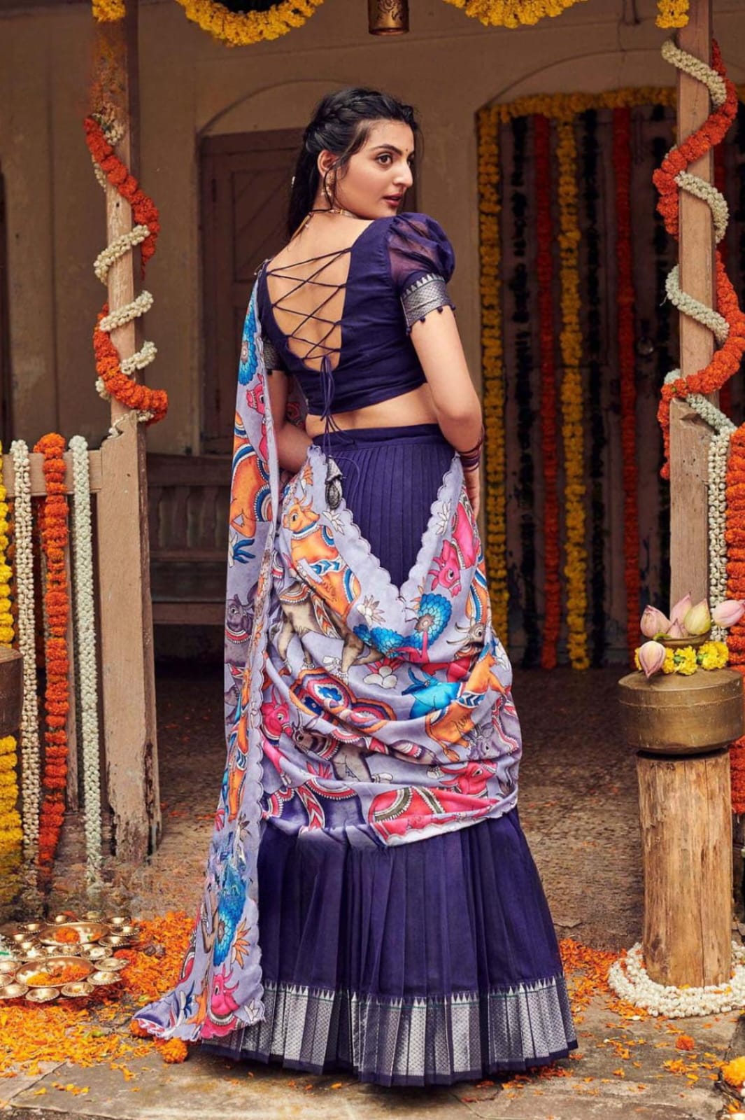 Brace yourself for a fashion voyage with our breathtaking Admiral Blue Narayanpet Lehenga Set! Immerse yourself in the spellbinding artistry of Narayanpet handlooms, elevated by a sparkling Cotton Kalamkari Printed Dupatta and Beautiful Sleeves with a Potli Pattern that radiates glamour and vivacity in the Blouse.