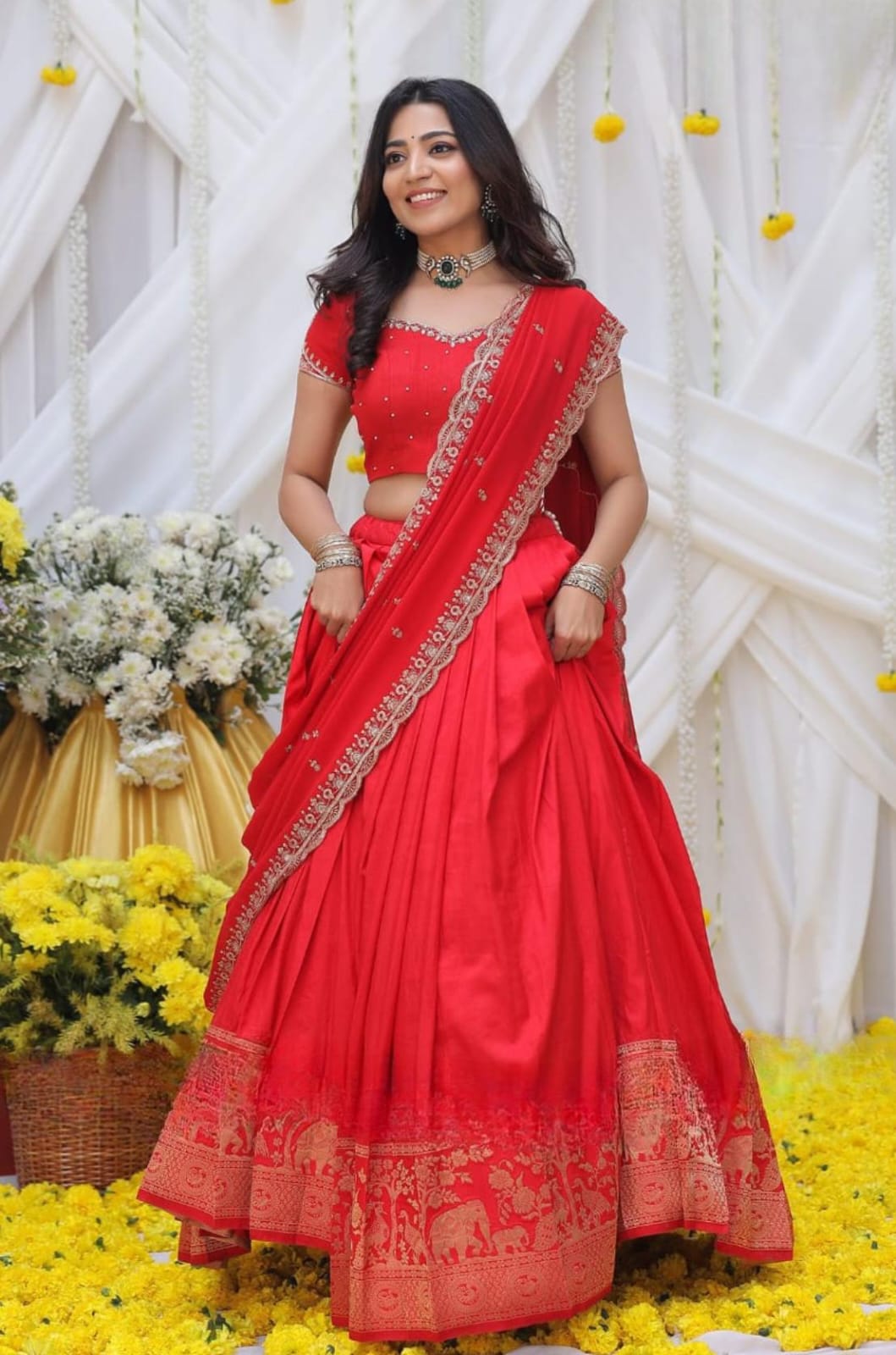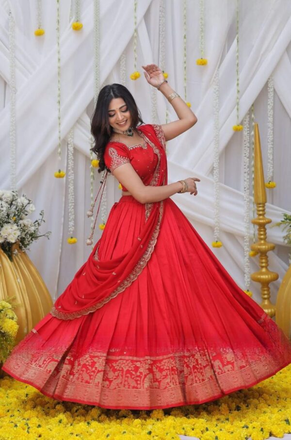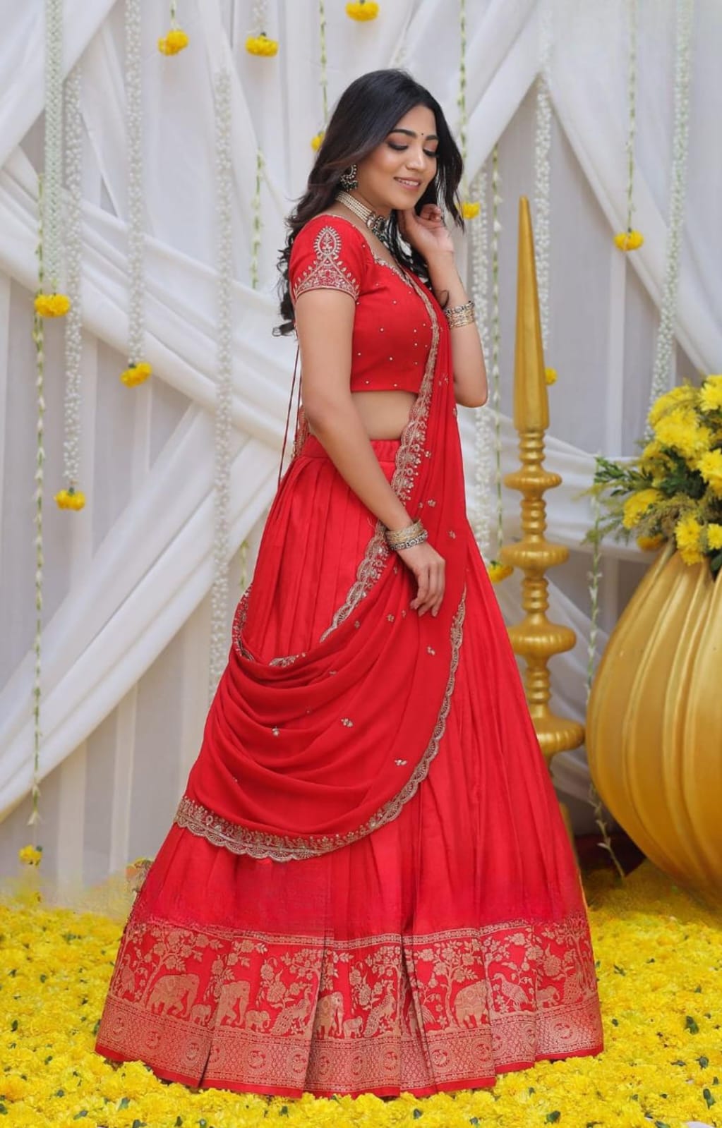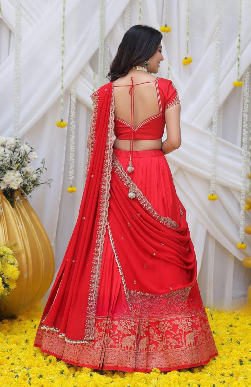 This beautiful Maharani Half Saree Set in Red is considered and made for festive functions, using vibrant red color and intricate hand embroidery with golden thread. Pair this with a georgette fabric dupatta with lace detailing. This lehenga comes with a padded blouse that has a sweetheart neckline.