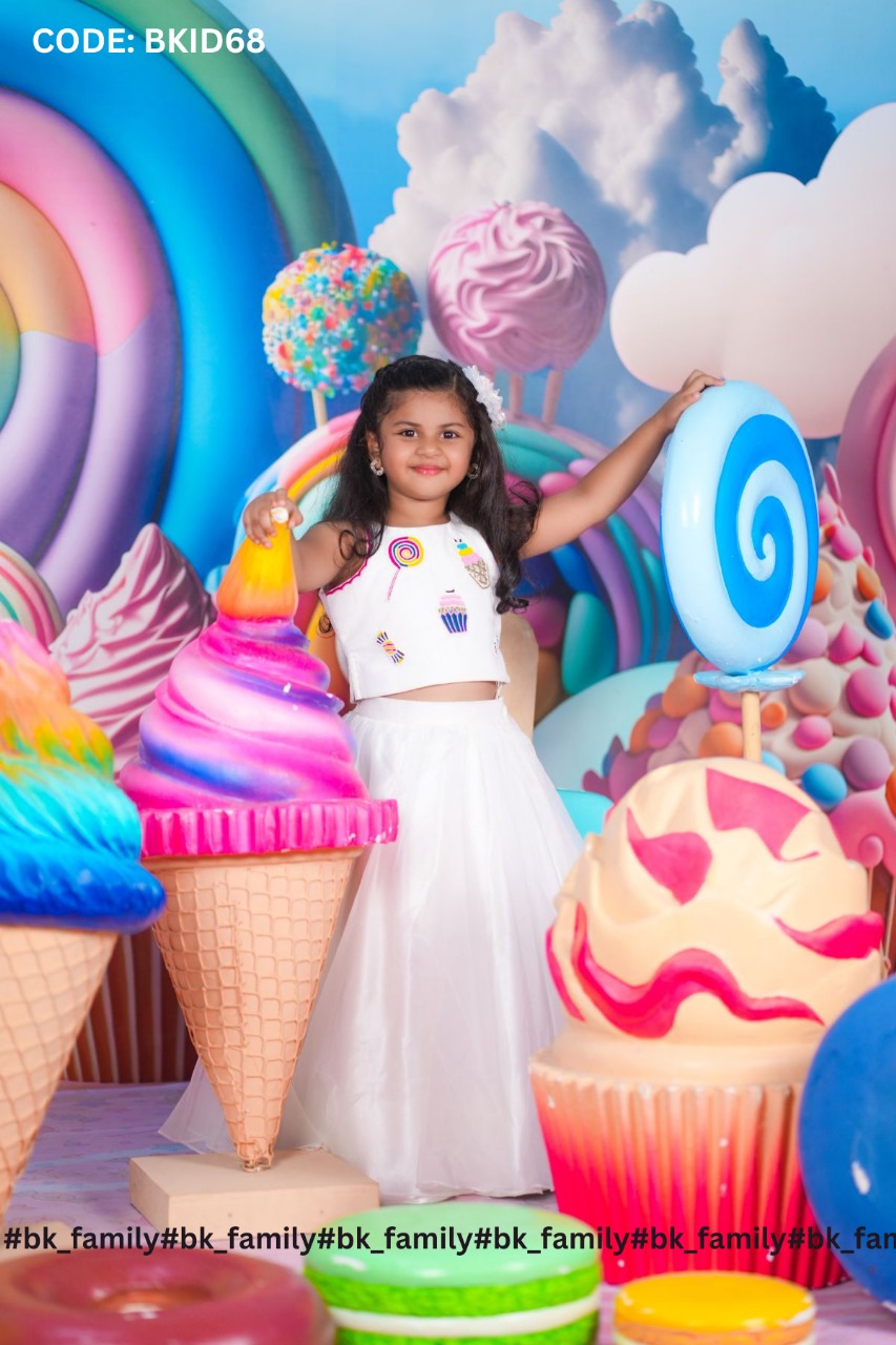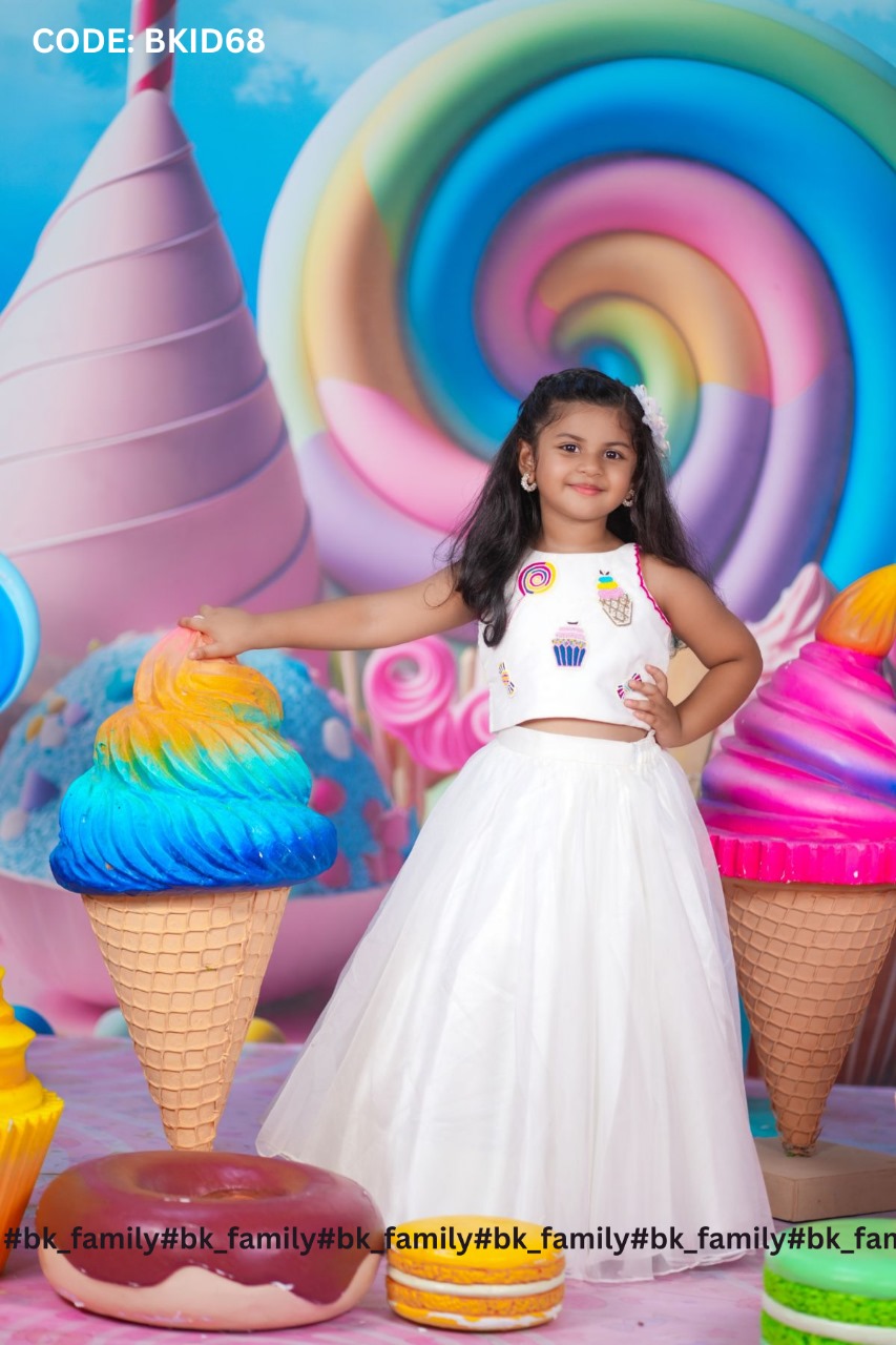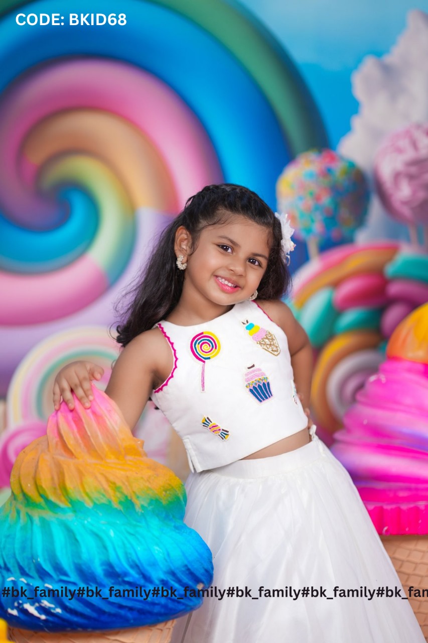 Introducing a gorgeous sleeveless top with a scalloped design that has creative handwork featuring delightful ice cream and toffee designs. Created with soft organza, this piece is beautifully complemented with smooth satin and crepe lining for your kids to feel comfy and elegant. The playful design creates charm, making it a perfect choice for festive occasions and casual outings. You must try a blend of artistry and style with this unique top that promises to turn heads wherever you go!