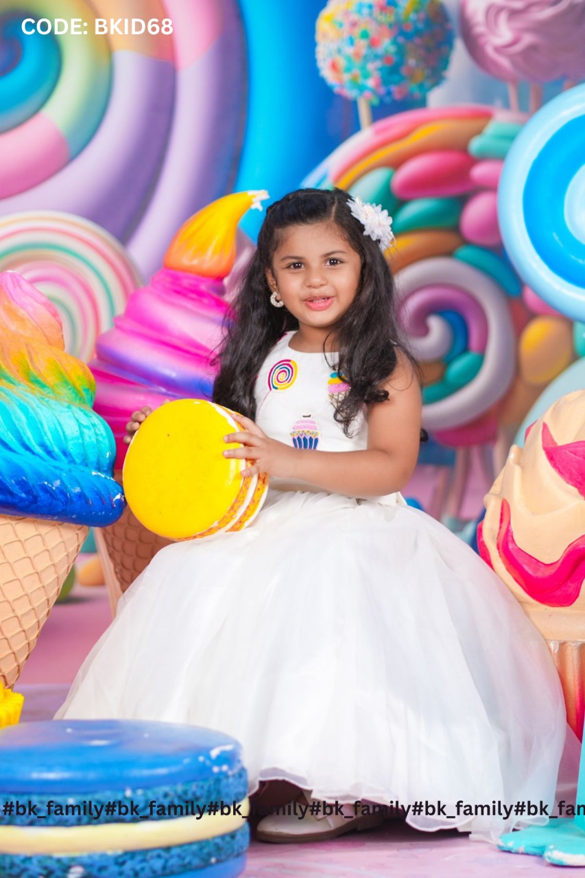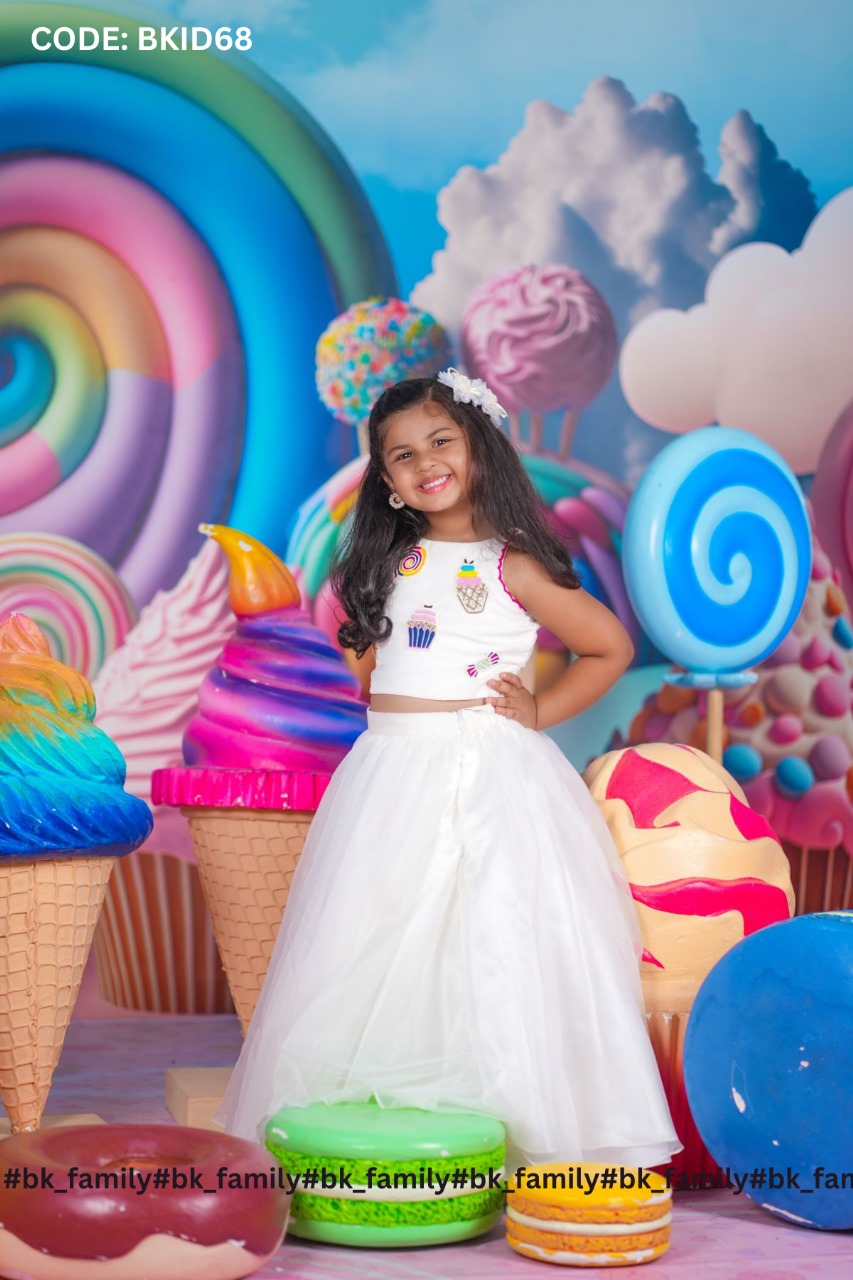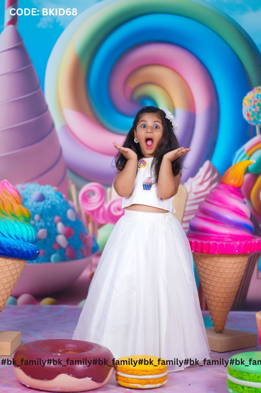 Introducing a gorgeous sleeveless top with a scalloped design that has creative handwork featuring delightful ice cream and toffee designs. Created with soft organza, this piece is beautifully complemented with smooth satin and crepe lining for your kids to feel comfy and elegant. The playful design creates charm, making it a perfect choice for festive occasions and casual outings. You must try a blend of artistry and style with this unique top that promises to turn heads wherever you go!