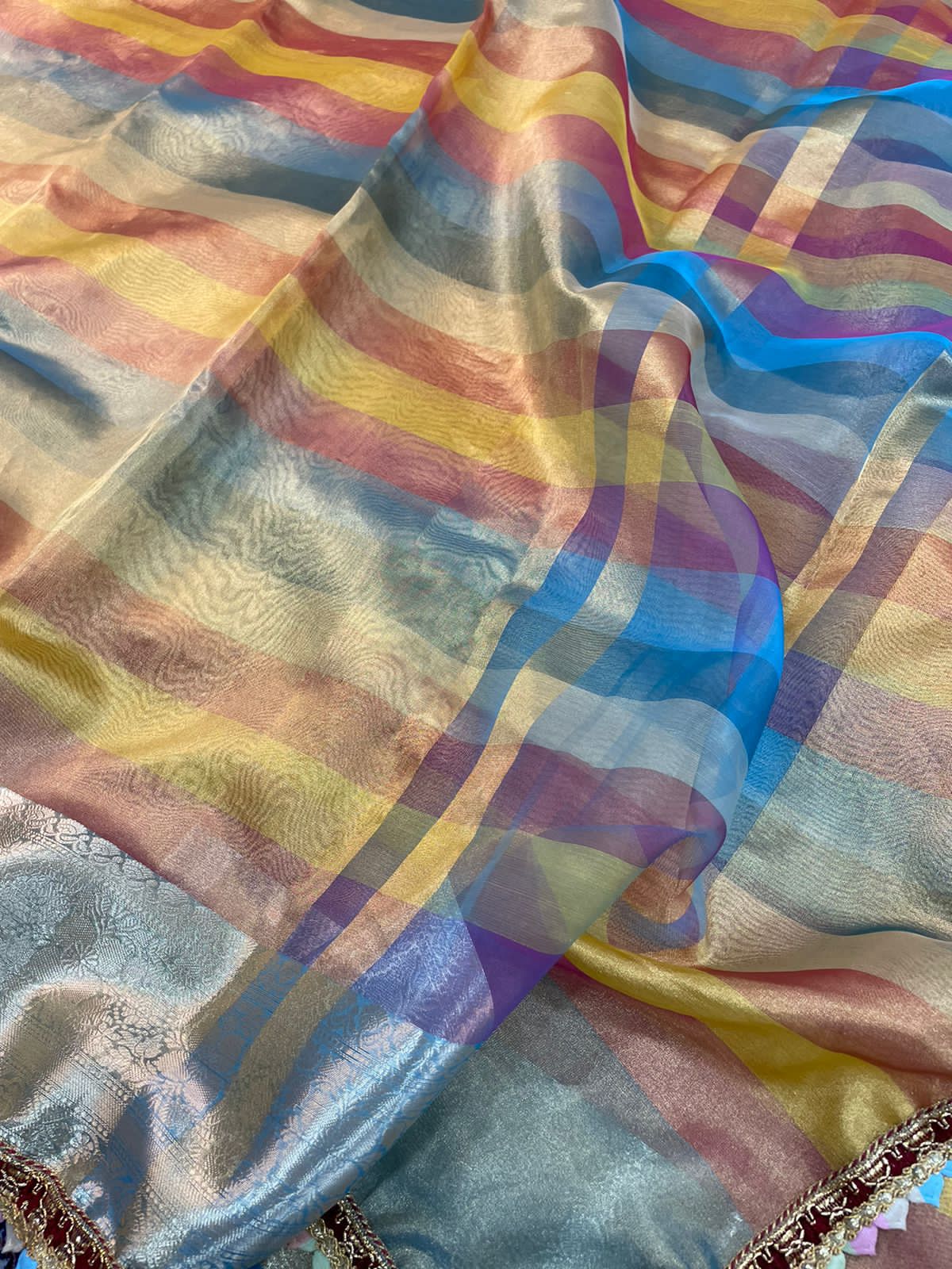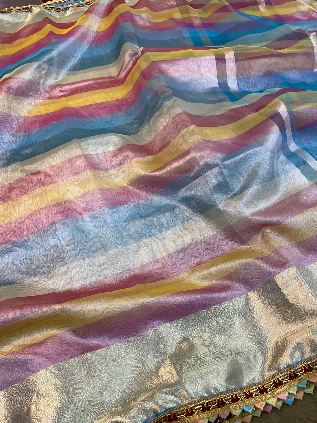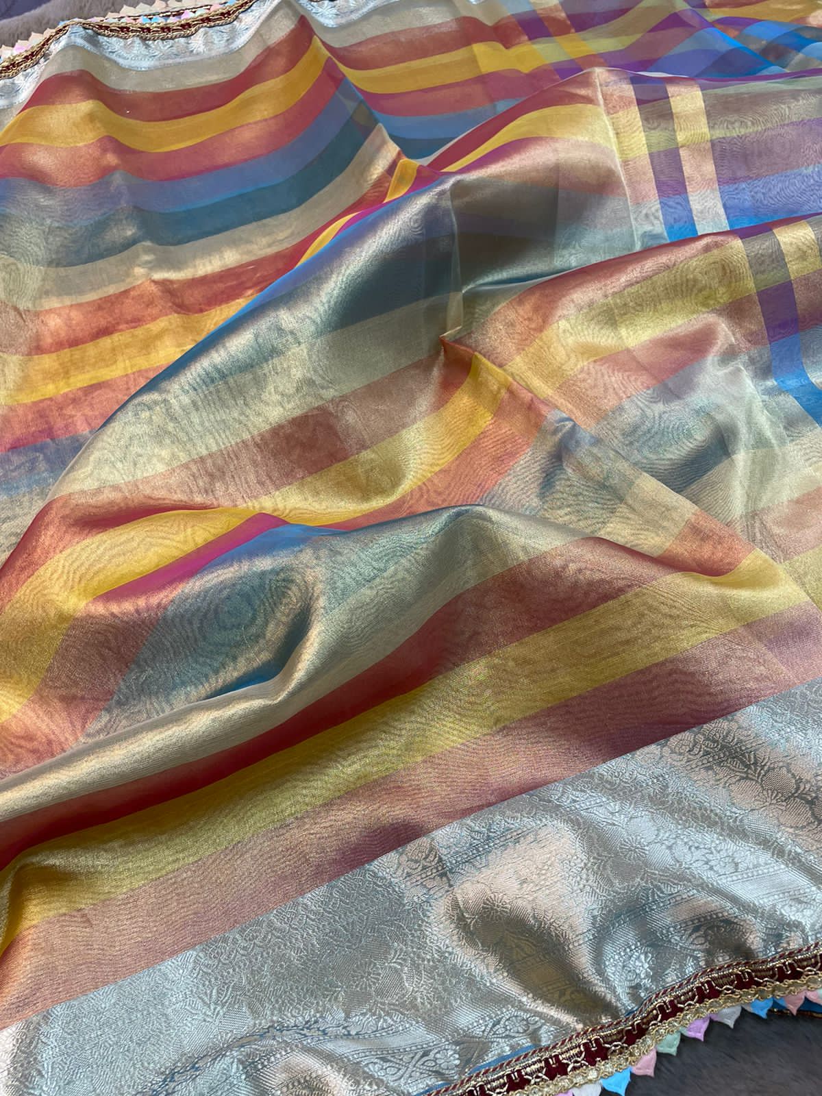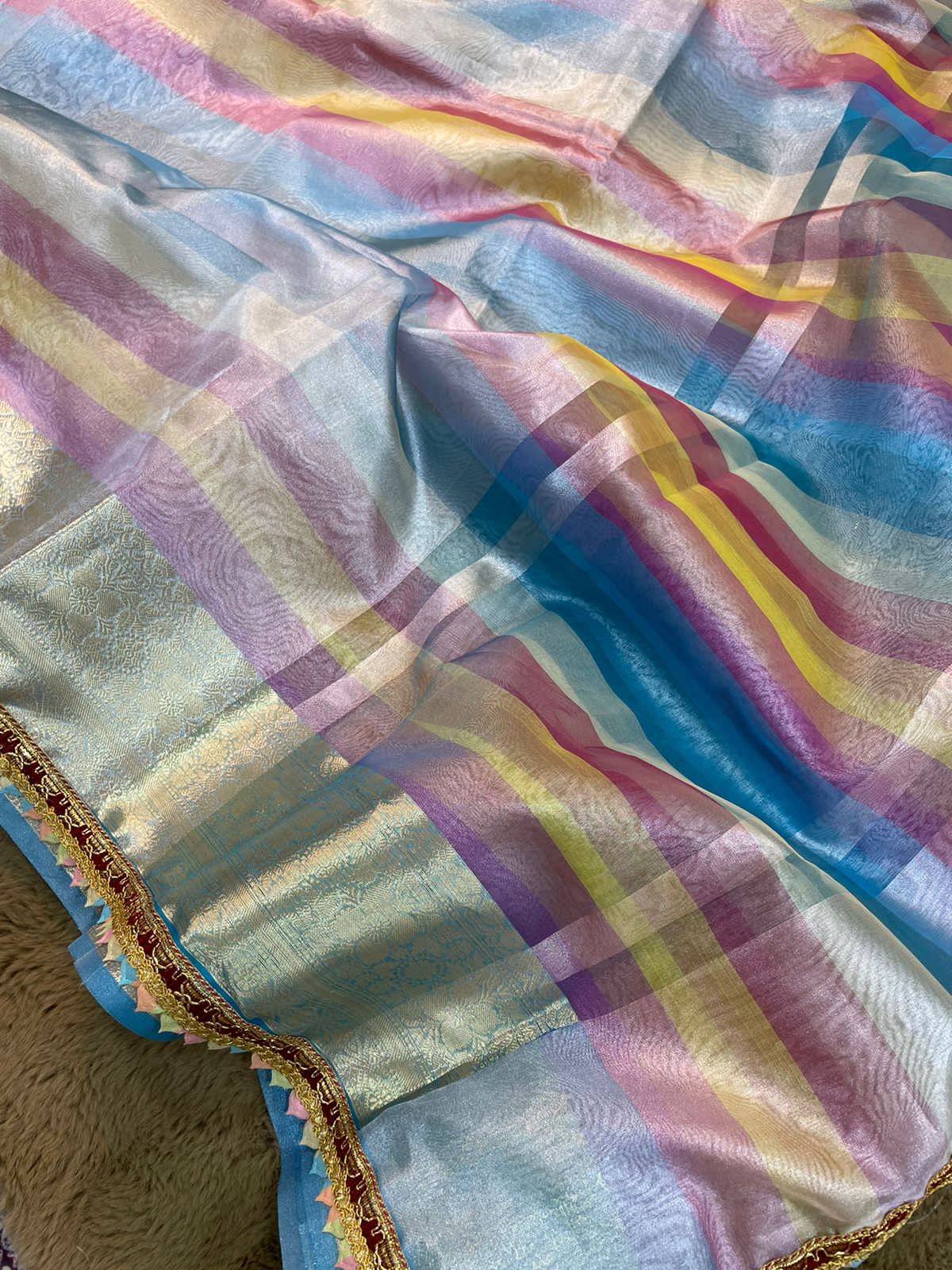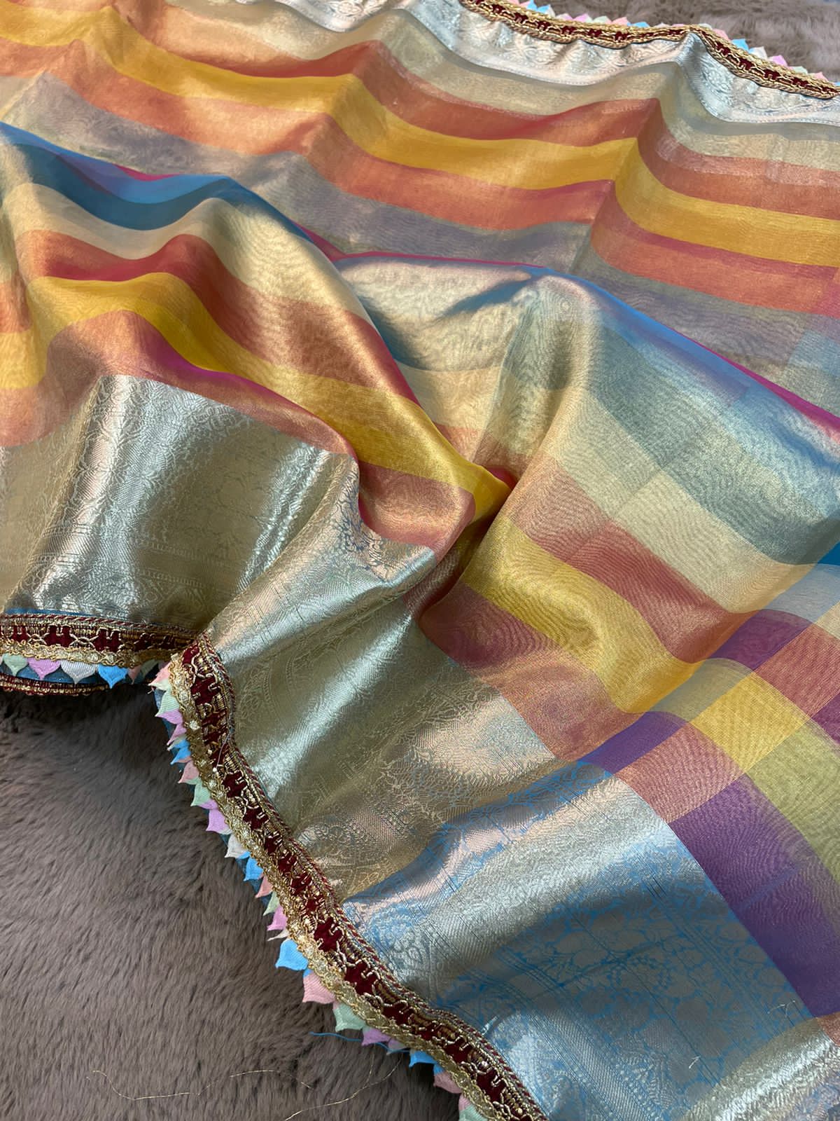 This lovely Rainbow Banarasi Crushed Tissue Saree, both side Kanchi inspired border, with Running blouse peices