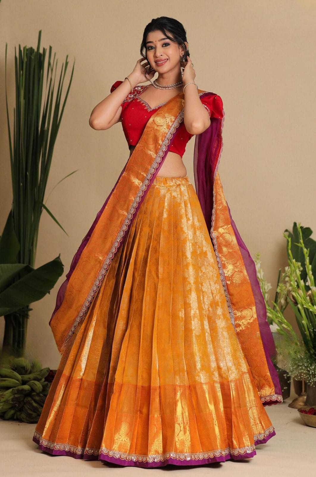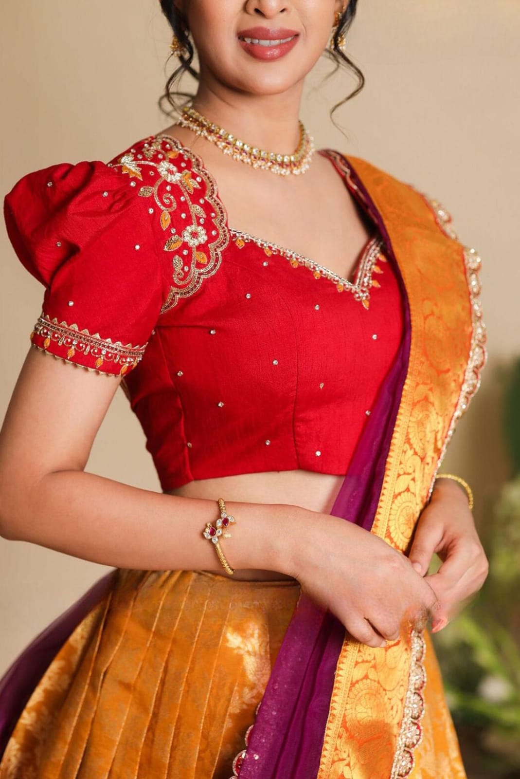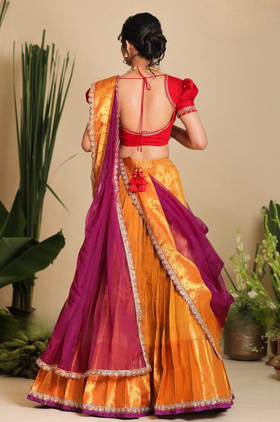This purple-yellow and red is a perfect color palette for this festive season, crafted in rich Banarasi and Dola Silk material. This beautiful lehenga is crafted in yellow Banarasi silk fabric with a hint of purple lace border at the end. A little pop of color gives it a stunning look. The blouse is crafted in Dola Silk with a hint of old puff sleeves, highlighting hand embroidery on the yoke, shoulder, and sleeves. The highlighting part of this lehenga is this beautiful contrasting dupatta with a yellow pattu border with lace detailing and contrasting purple organza, making it a perfect festive lehenga.