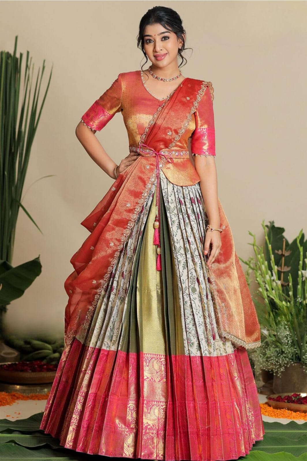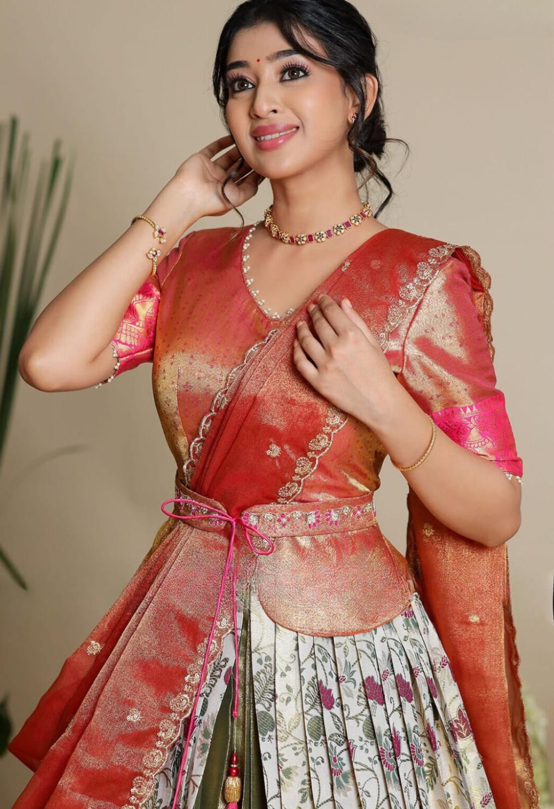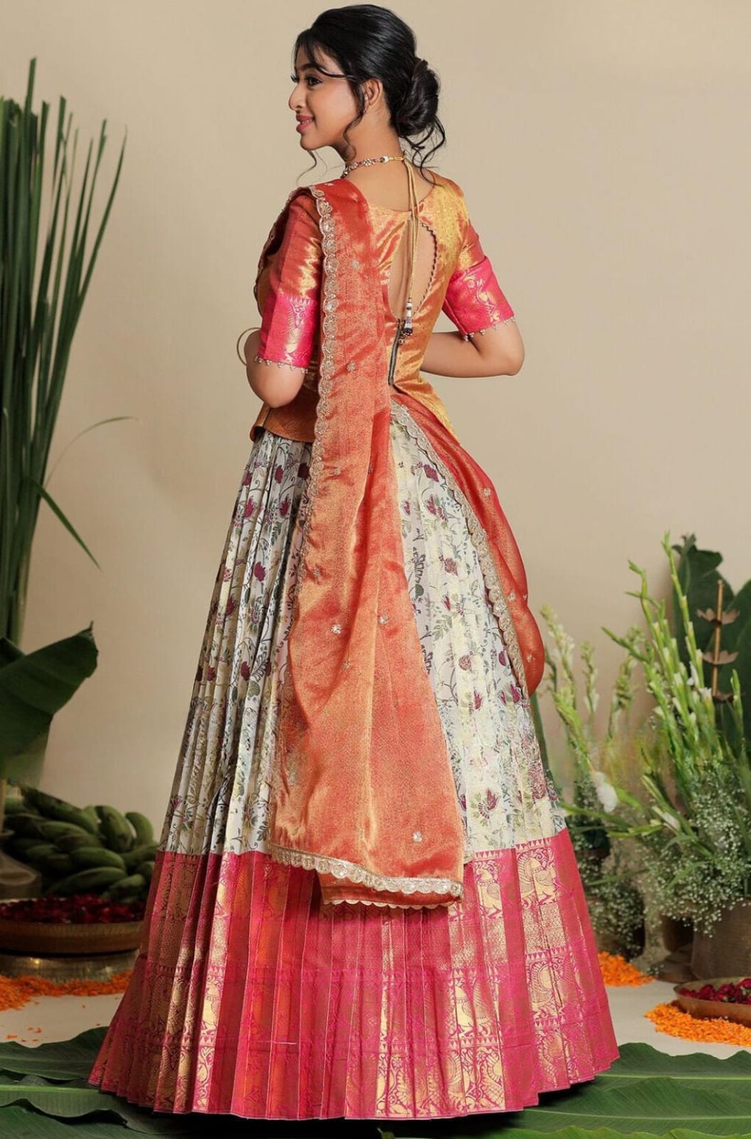 This stunning three-piece set features an elegant ivory and orange Lehenga meticulously crafted from luxurious Banarasi silk. The ensemble includes a contemporary peplum top with a back opening and intricate front embroidery, complemented by a stylish belt. The V-neckline is adorned with potli detailing on the yoke, while the sleeves are embellished with delicate beadwork. Paired with a floral-printed Lehenga showcasing a wide Banarasi pattu border along the edge, this outfit is perfect for festive occasions. Complete the look with a gold tissue dupatta with a sequined golden border.