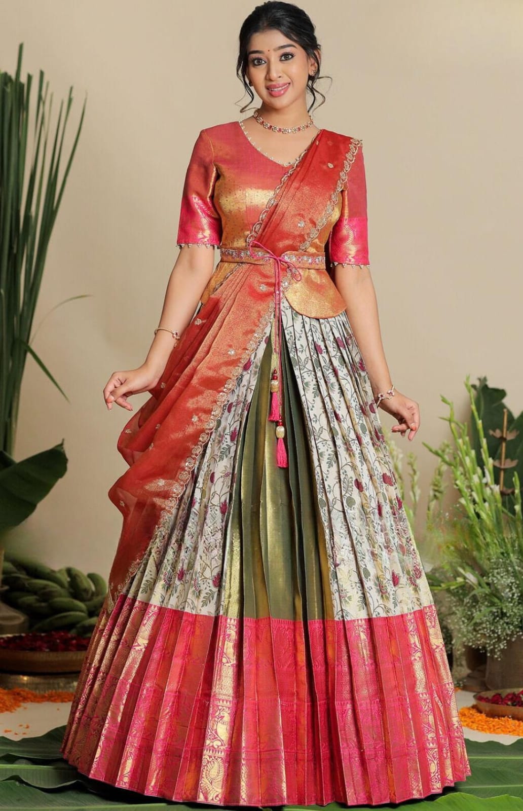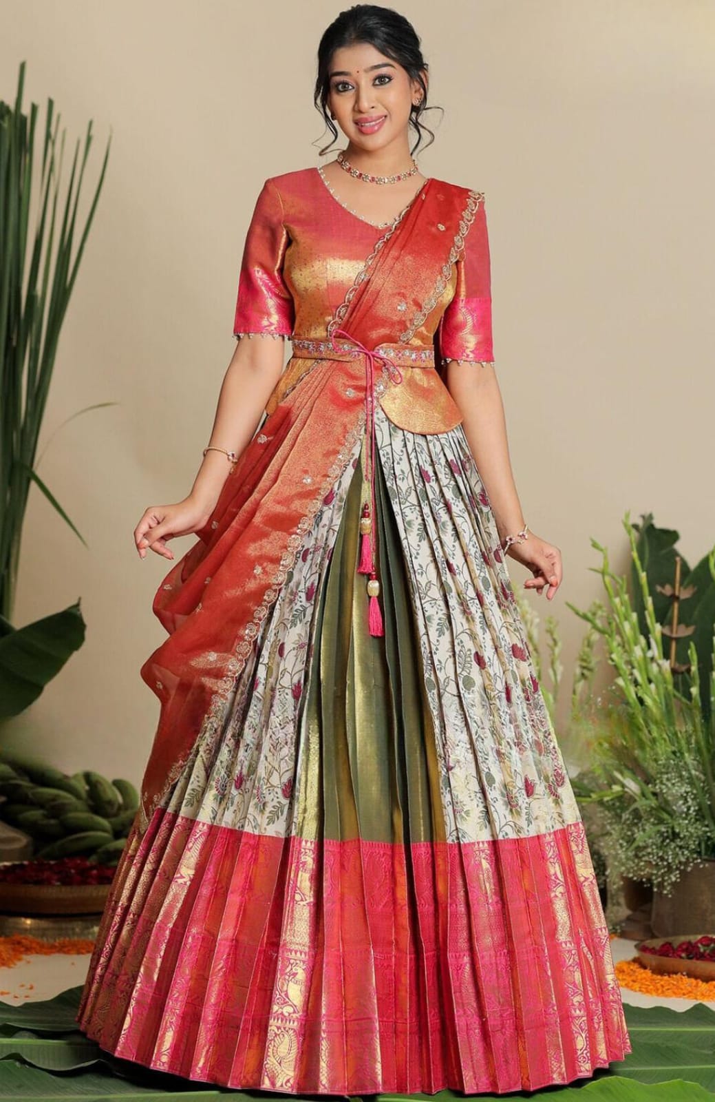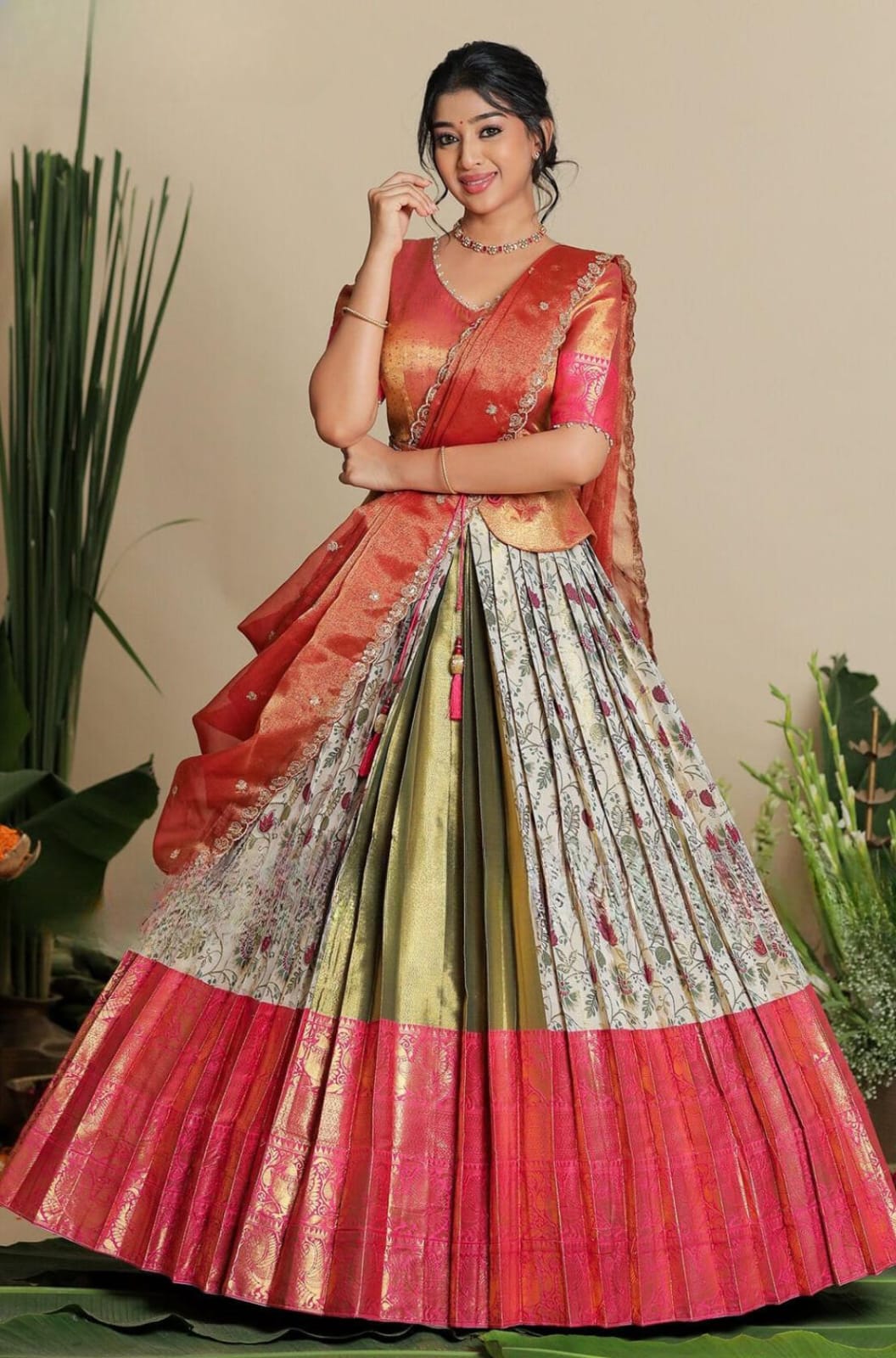 This stunning three-piece set features an elegant ivory and orange Lehenga meticulously crafted from luxurious Banarasi silk. The ensemble includes a contemporary peplum top with a back opening and intricate front embroidery, complemented by a stylish belt. The V-neckline is adorned with potli detailing on the yoke, while the sleeves are embellished with delicate beadwork. Paired with a floral-printed Lehenga showcasing a wide Banarasi pattu border along the edge, this outfit is perfect for festive occasions. Complete the look with a gold tissue dupatta with a sequined golden border.