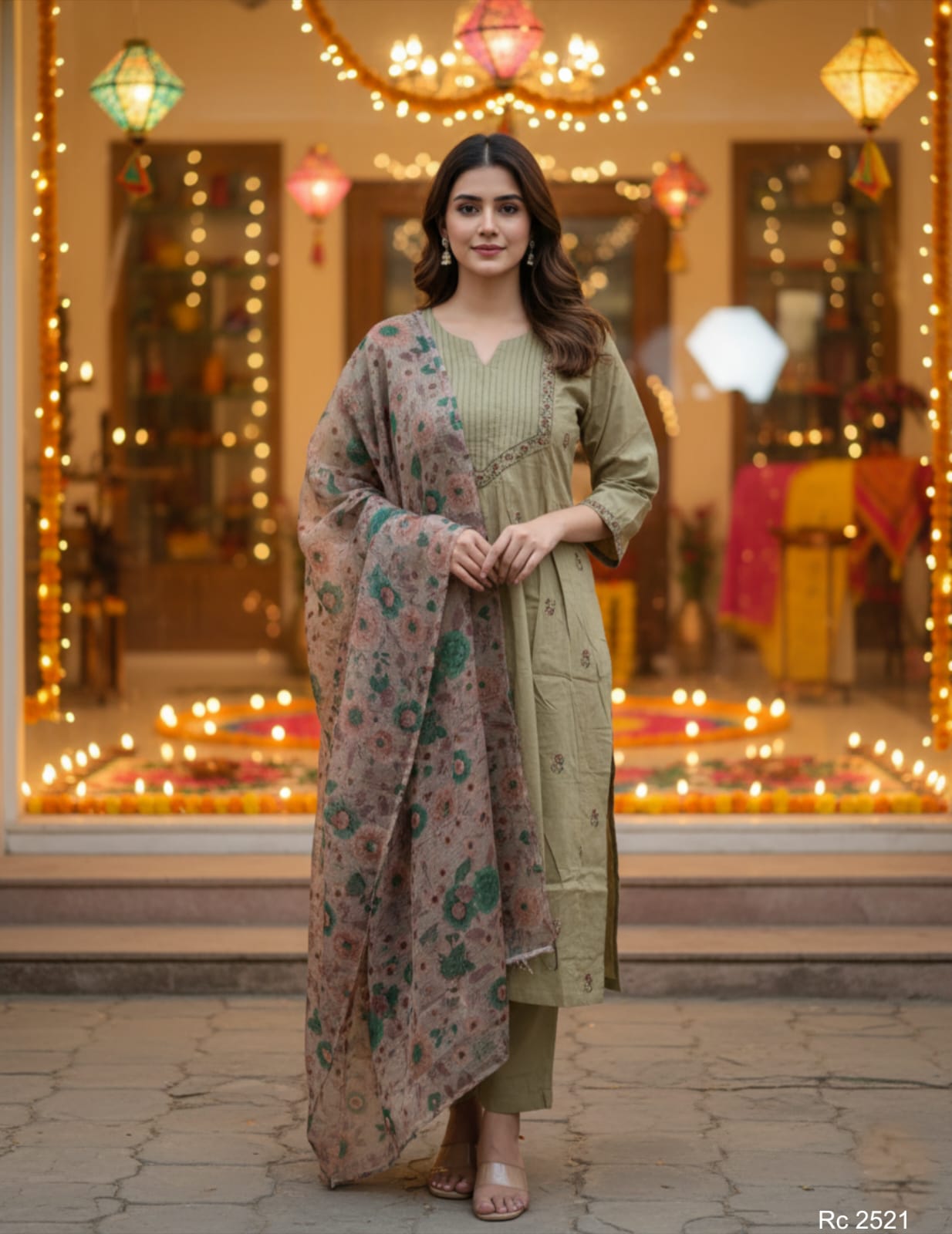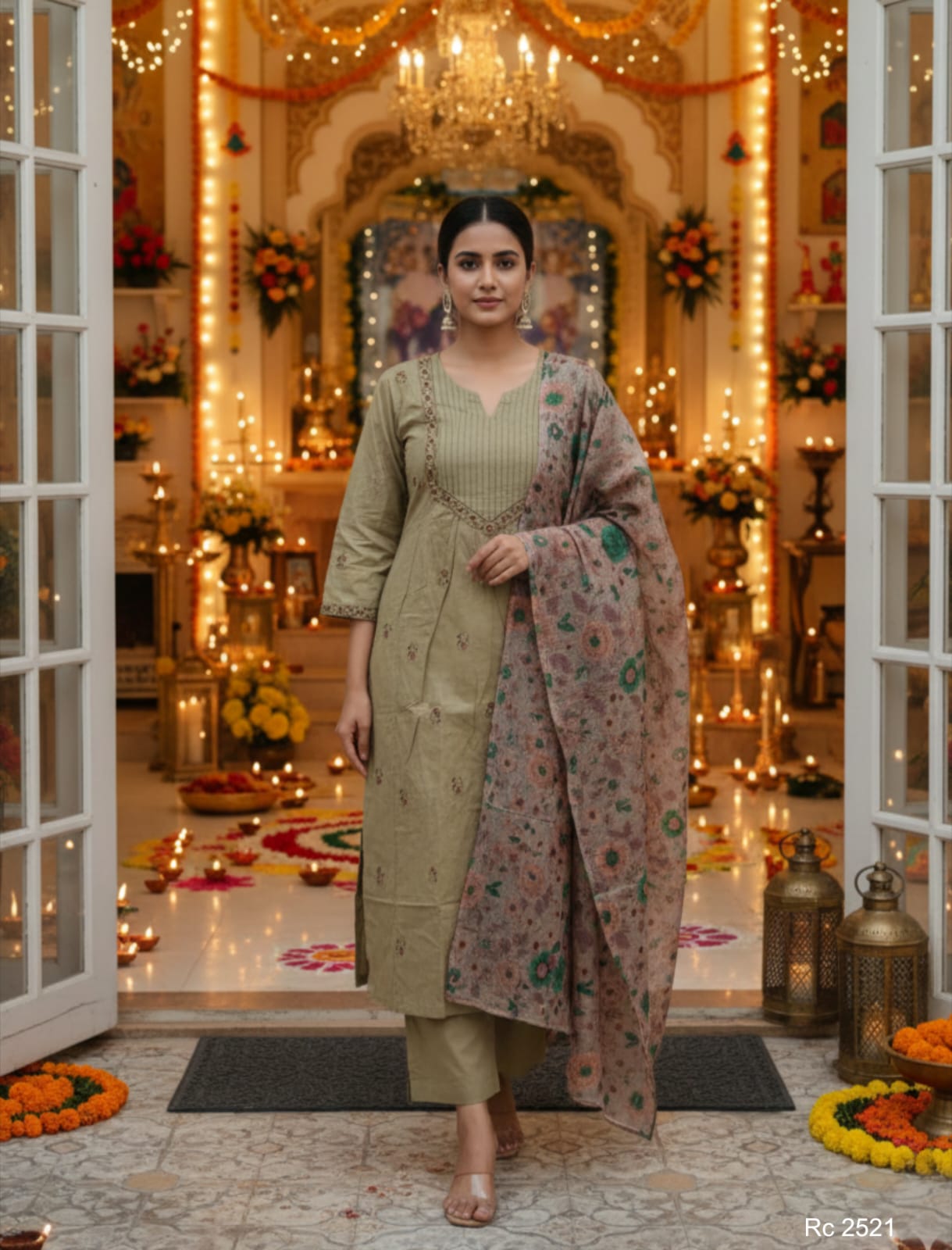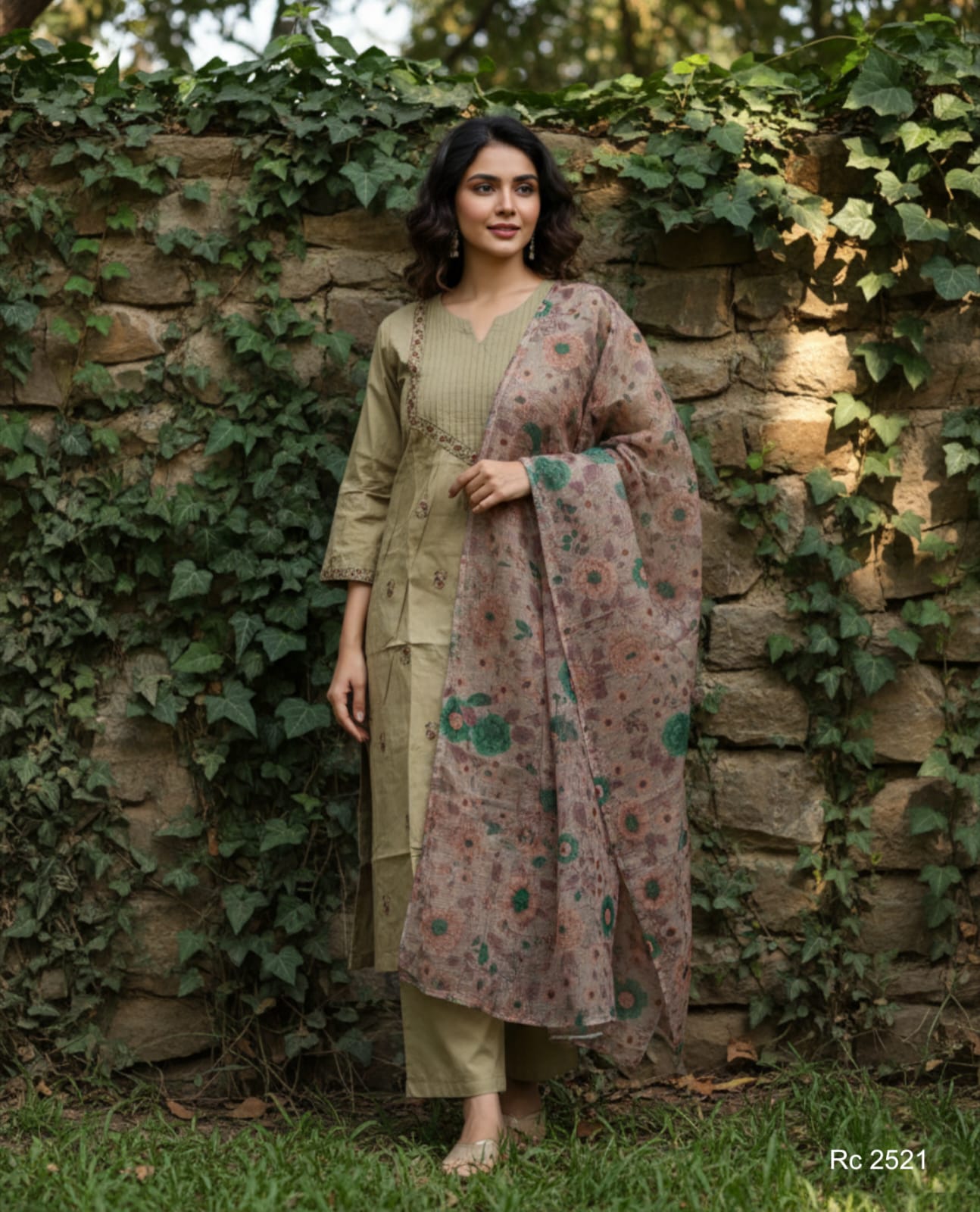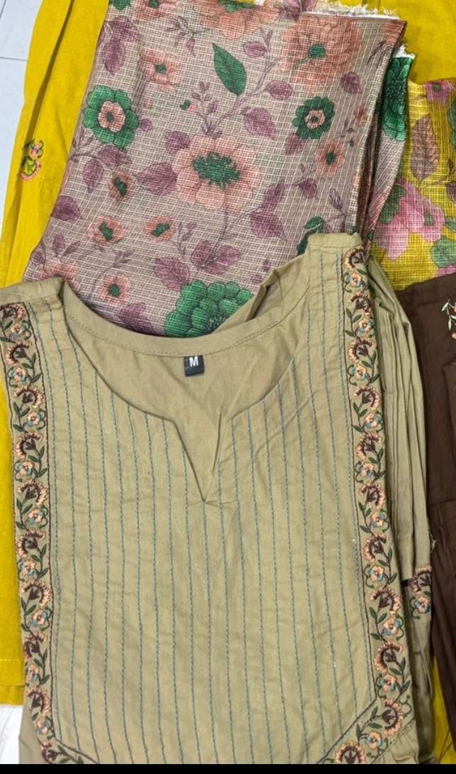 Trendy handloom cotton A-line side slit designer embroidered three-piece set, perfect for all occasions