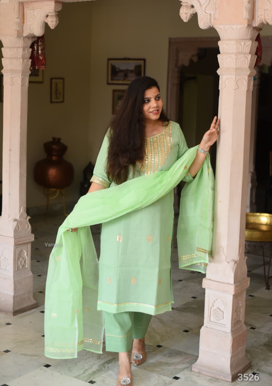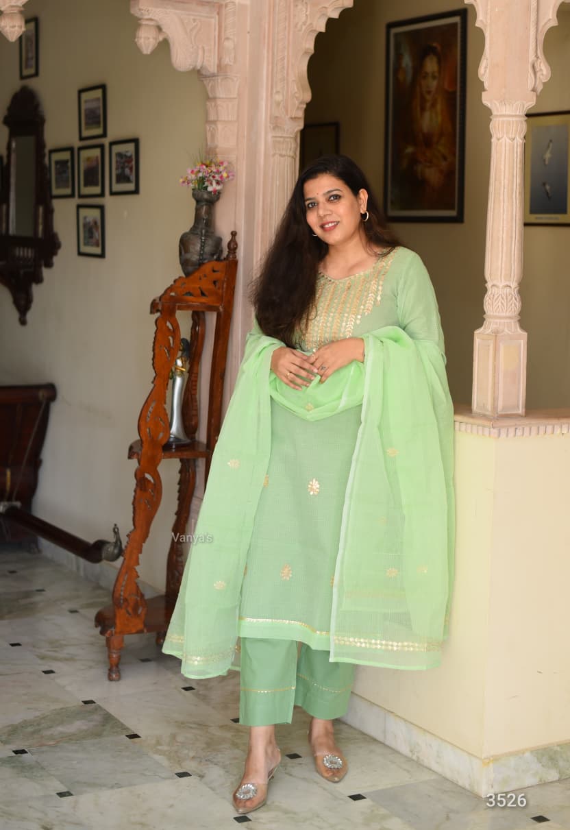 Explore this wedding season with this zzgotta paati zari work combination 3 pcs attire. Pure cotton-based thread kota Doria kurta ( full cotton lining) with matching cotton pant Paired with kota Doria duppata