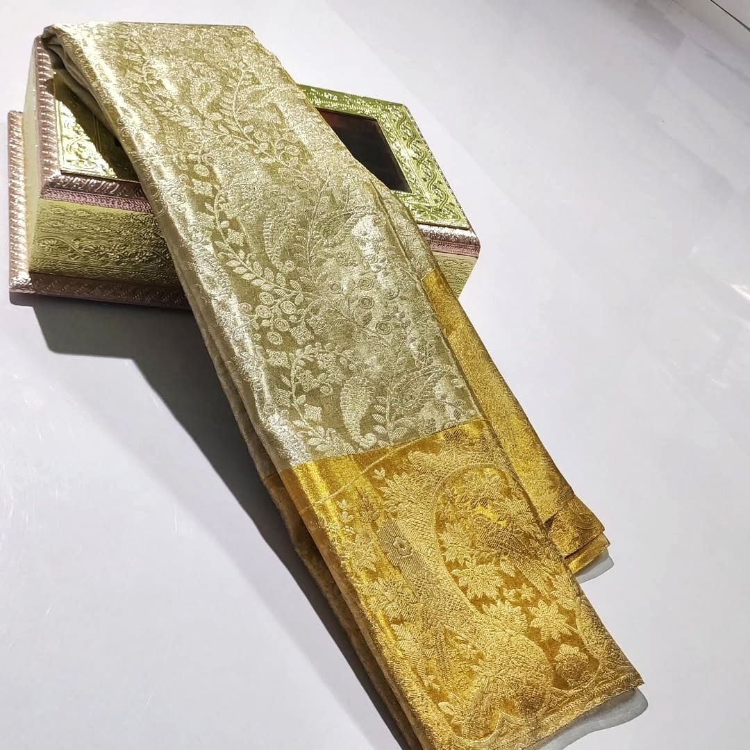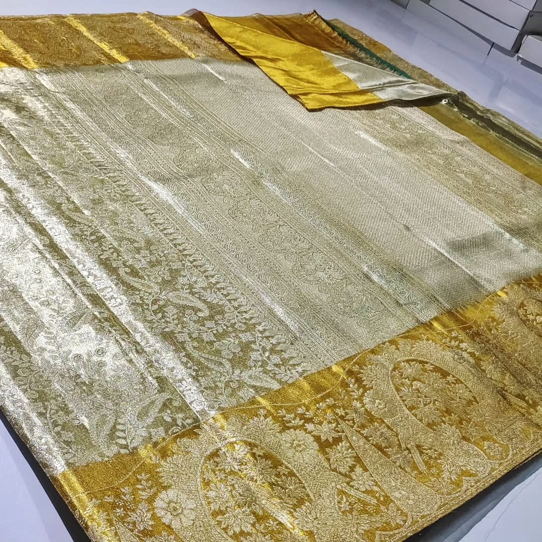 Bridal wear pure kanchipattu tissue edge to edge gold boarder with silver brocade designs