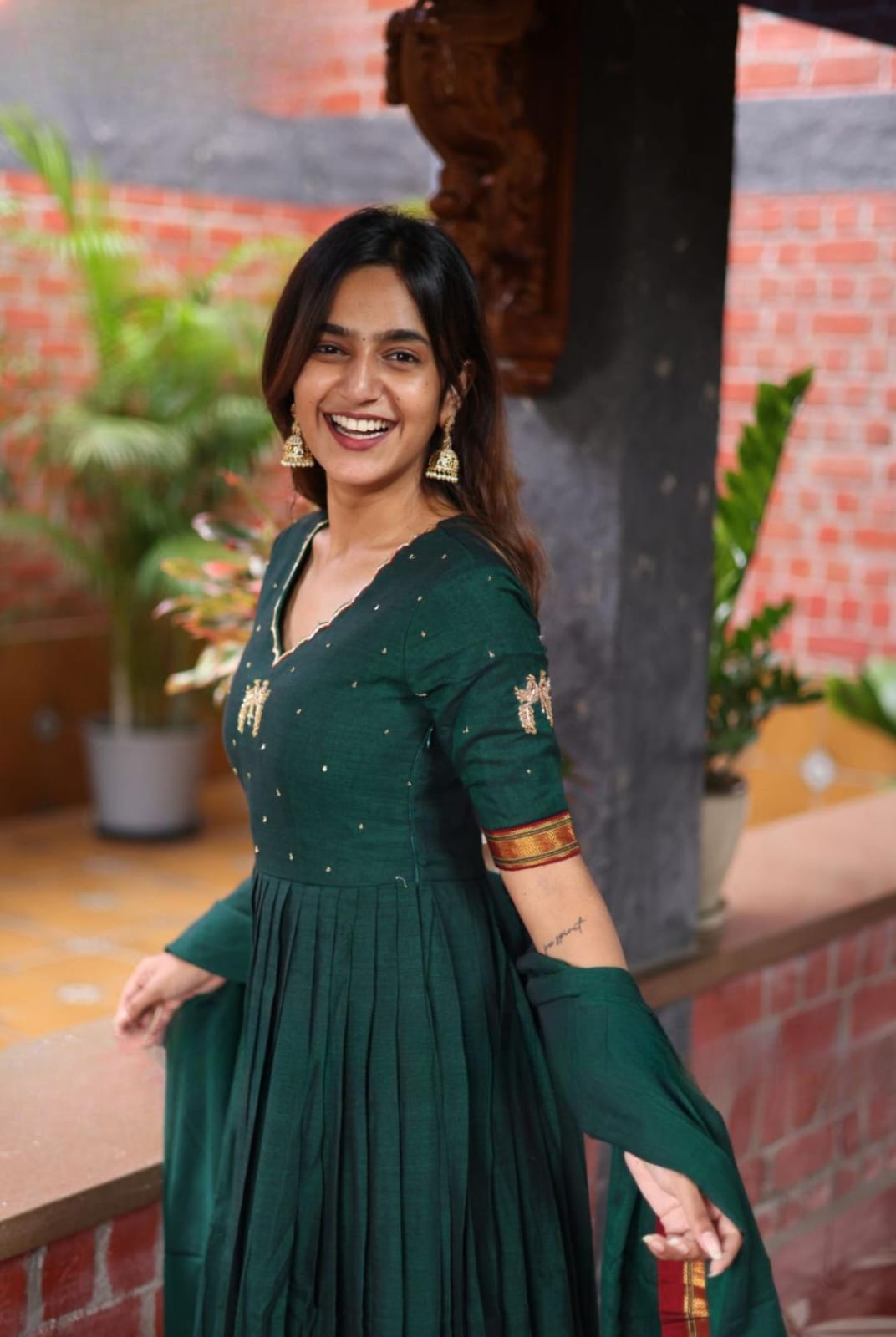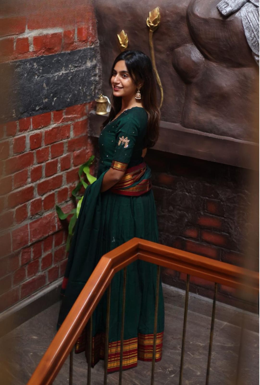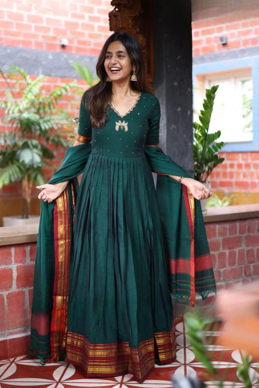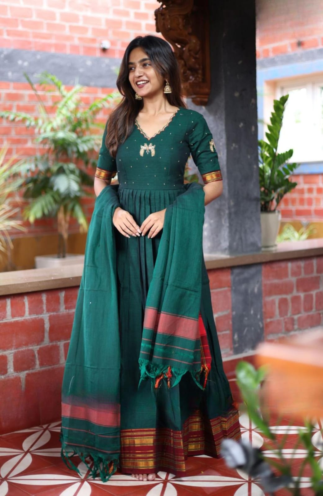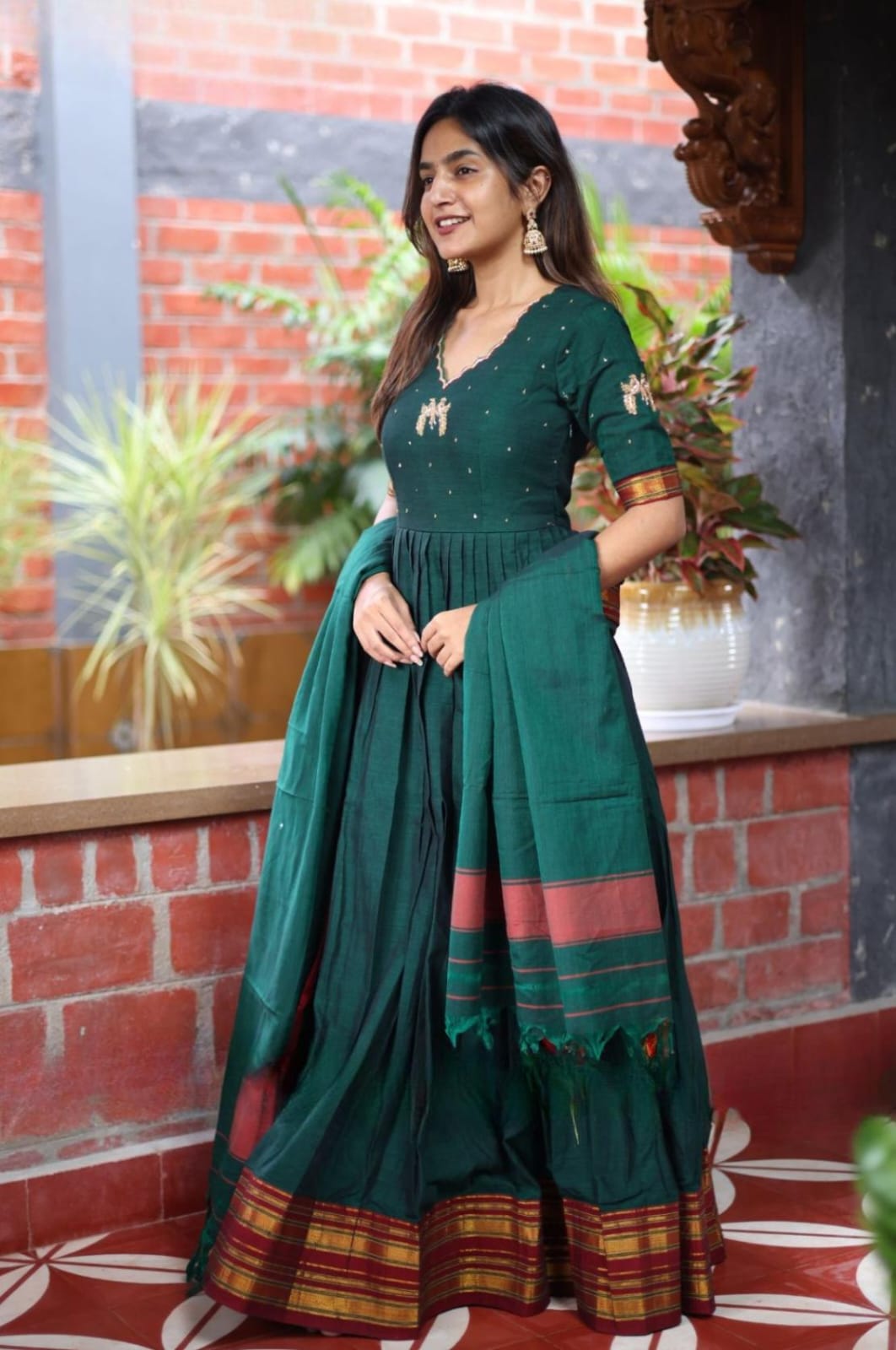 Still searching for festivals, cultural events, or pooja celebration wear in just one outfit? Here it is, this Bunaai Anarkali (Dress) in Green is perfect for everything you are looking for. The scalloped neckline detail is beautifully crafted of peacock handwork in the entire yoke part and the same in the sleeves. The dress features a floor-length design with gathering pleats for added comfort, complemented by a golden thread-weaving border. The same handloom fabric dupatta will enhance the look of the overall attire. Opt for simple yet traditional jewellery that complements this outfit, and choose simple flats for superior comfort or a more relaxed look.