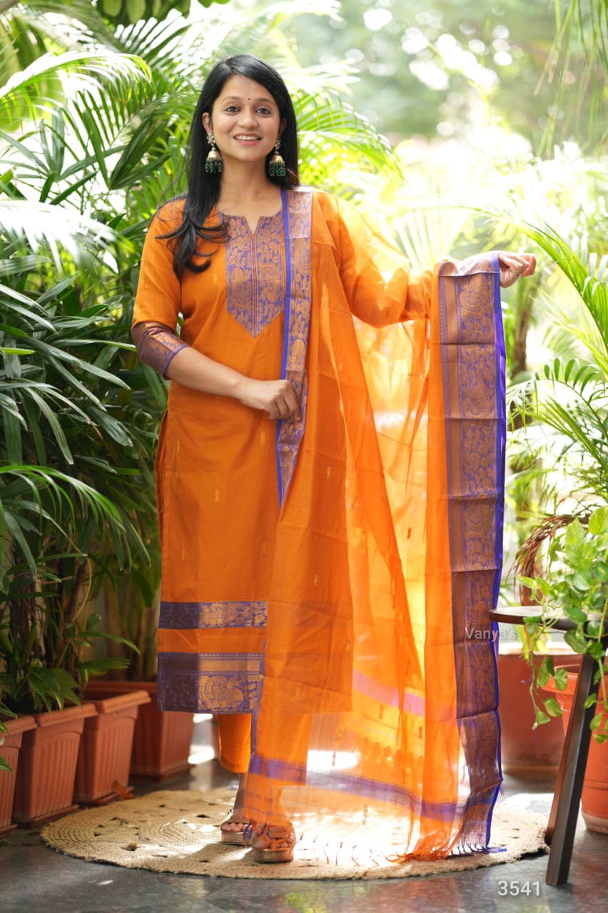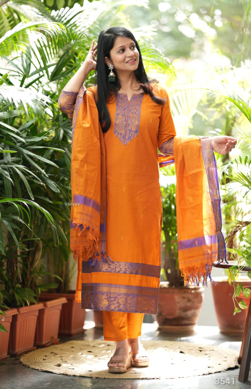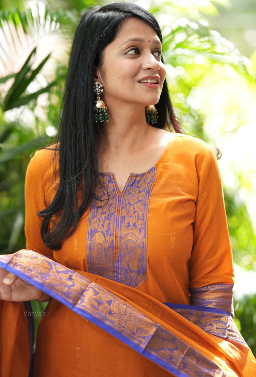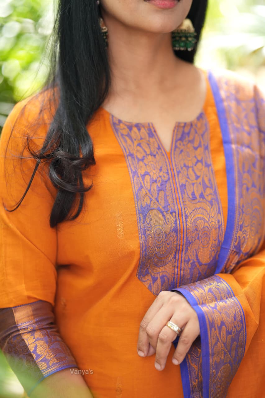 Step into timeless grace with Vrinda Orange Charm. The Rust orange kurta features exquisite woven zari-style detailing on the neckline, sleeves, and hem that adds a touch of luxury.