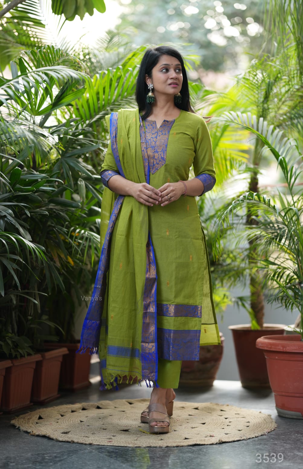 A rich Kachi cotton dupatta highlighted with a luminous royal blue border and traditional motifs. Cotton pants with full elastic