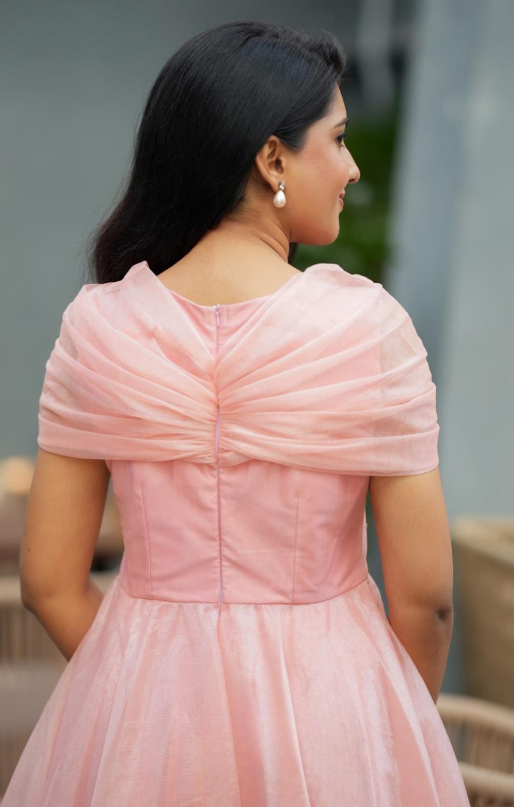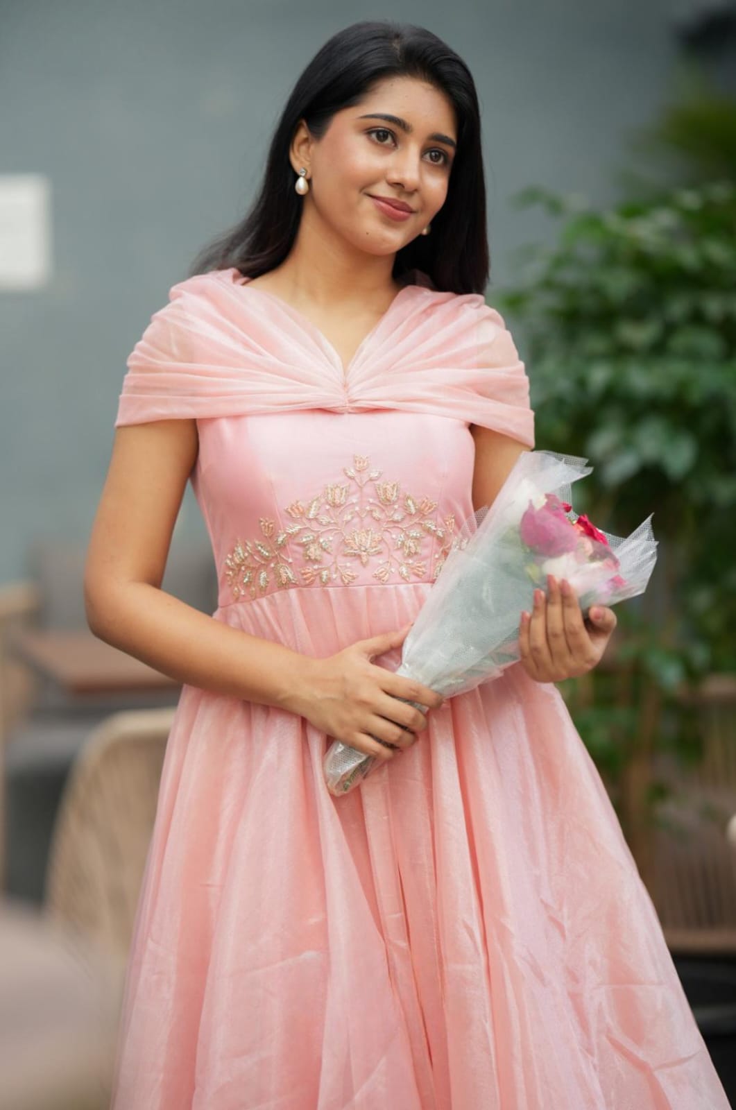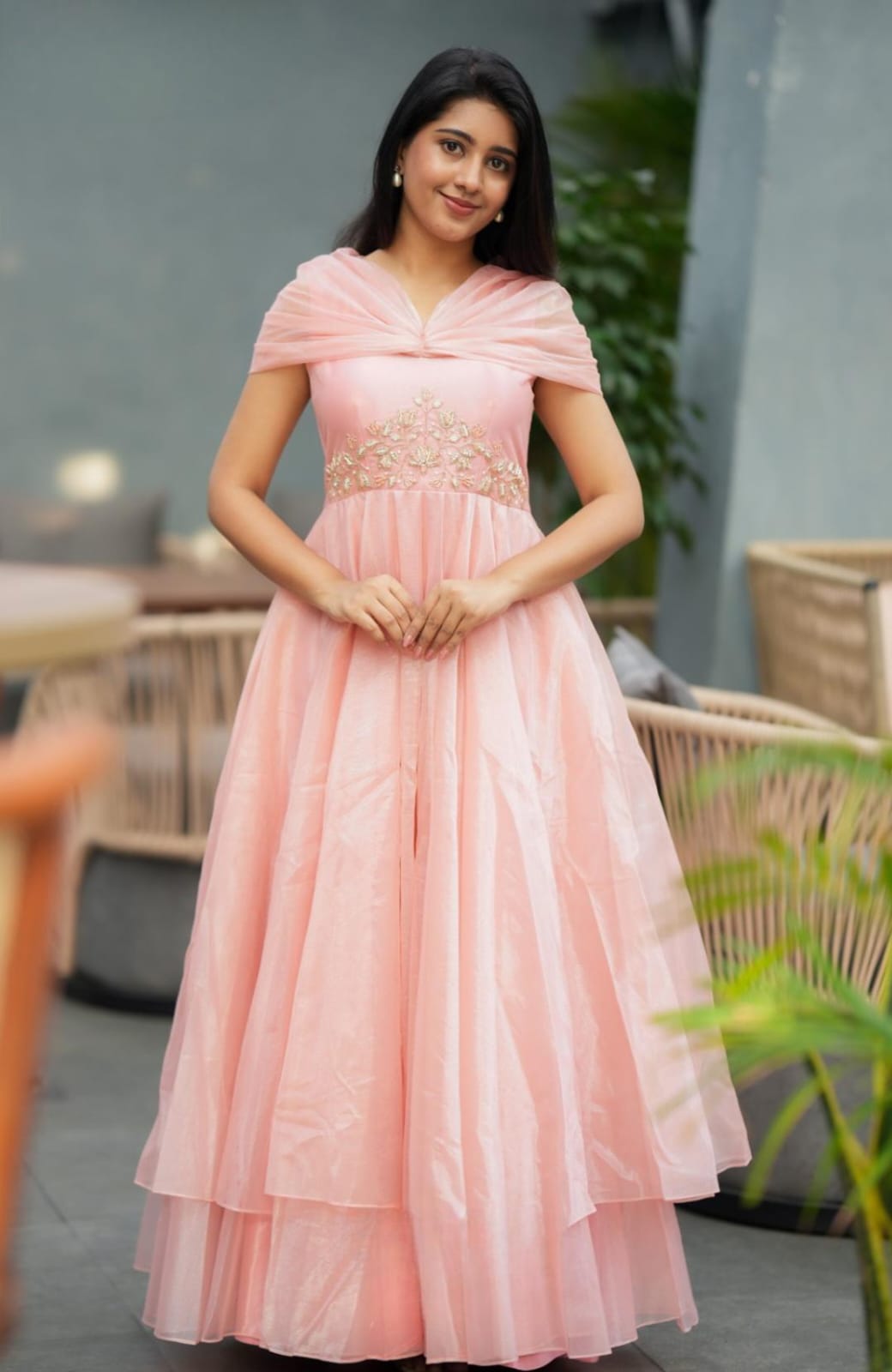 The bodice features intricate hand-embellished floral work, adding a touch of artisanal charm and sophistication. The neckline is adorned with delicately draped fabric, creating a soft, cape-like effect that extends over the shoulders and back, enhancing its regal appeal.