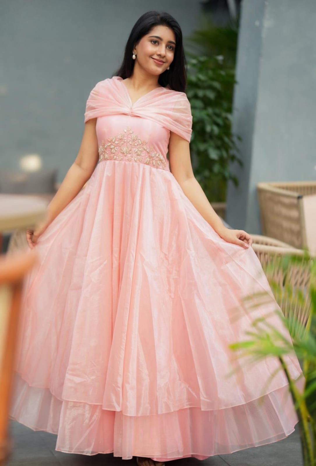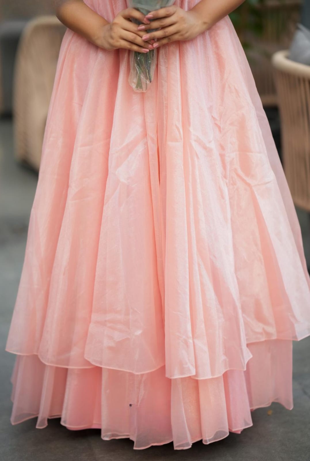Step into elegance with this enchanting Princess-style gown, crafted from luxurious Jimmy Choo fabric in a soft, romantic blush pink that shimmers beautifully with every movement. Designed with a double-layered umbrella flare, this dress exudes grace and volume, making it a stunning choice for special occasions.