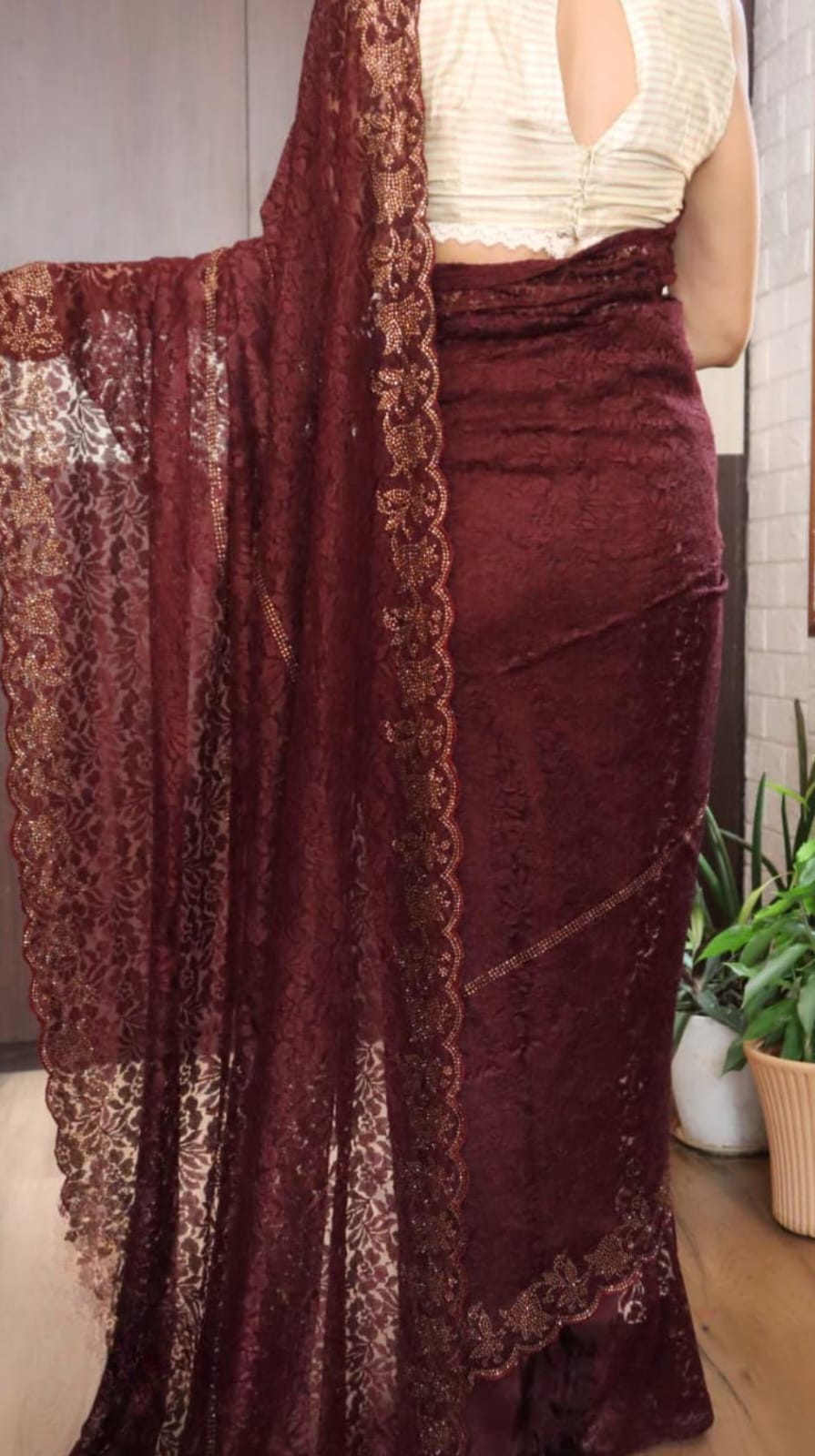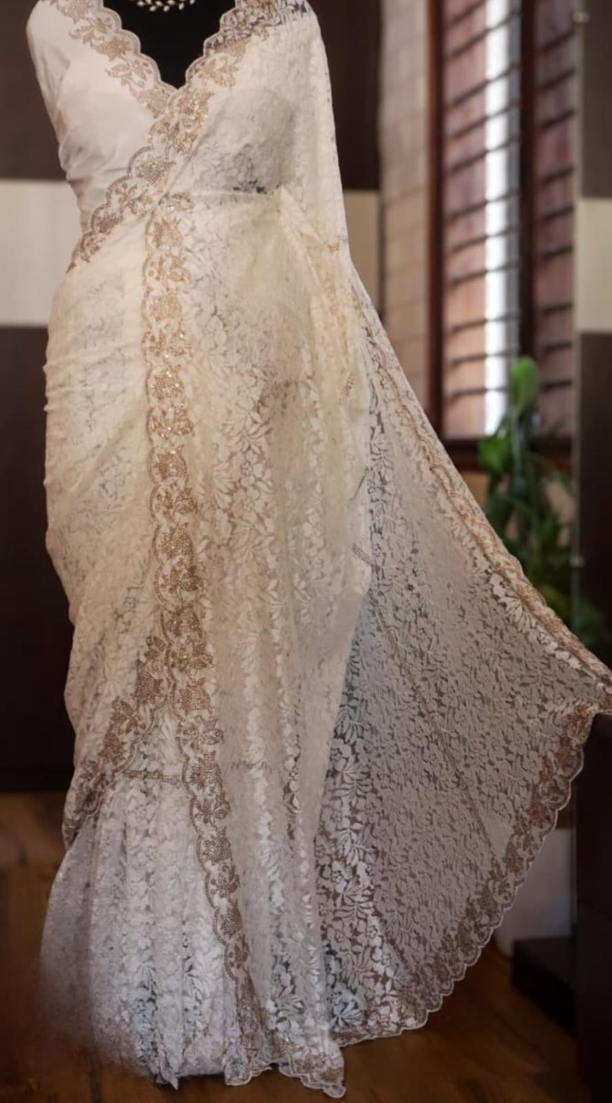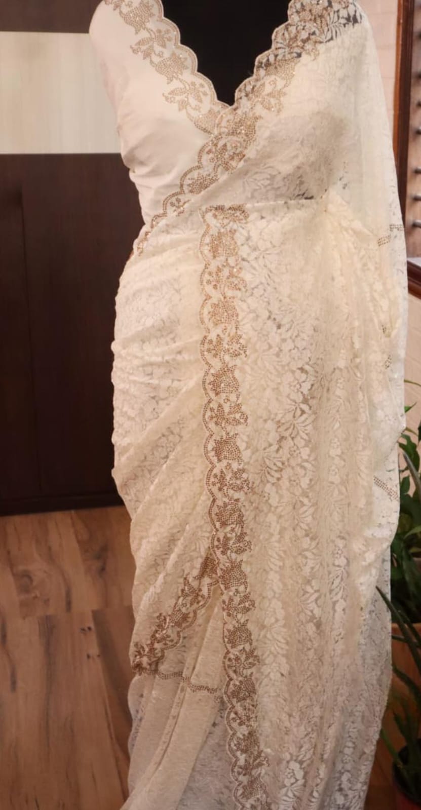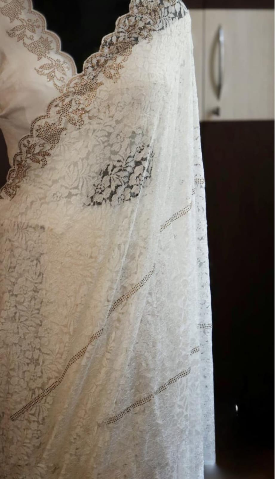 *Breathtaking Chantilly lace silk sarees, beautifully crafted in striking SWAROVSKI work all over.”
