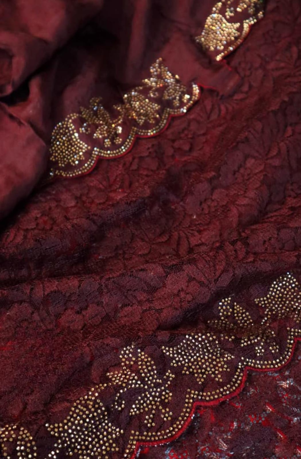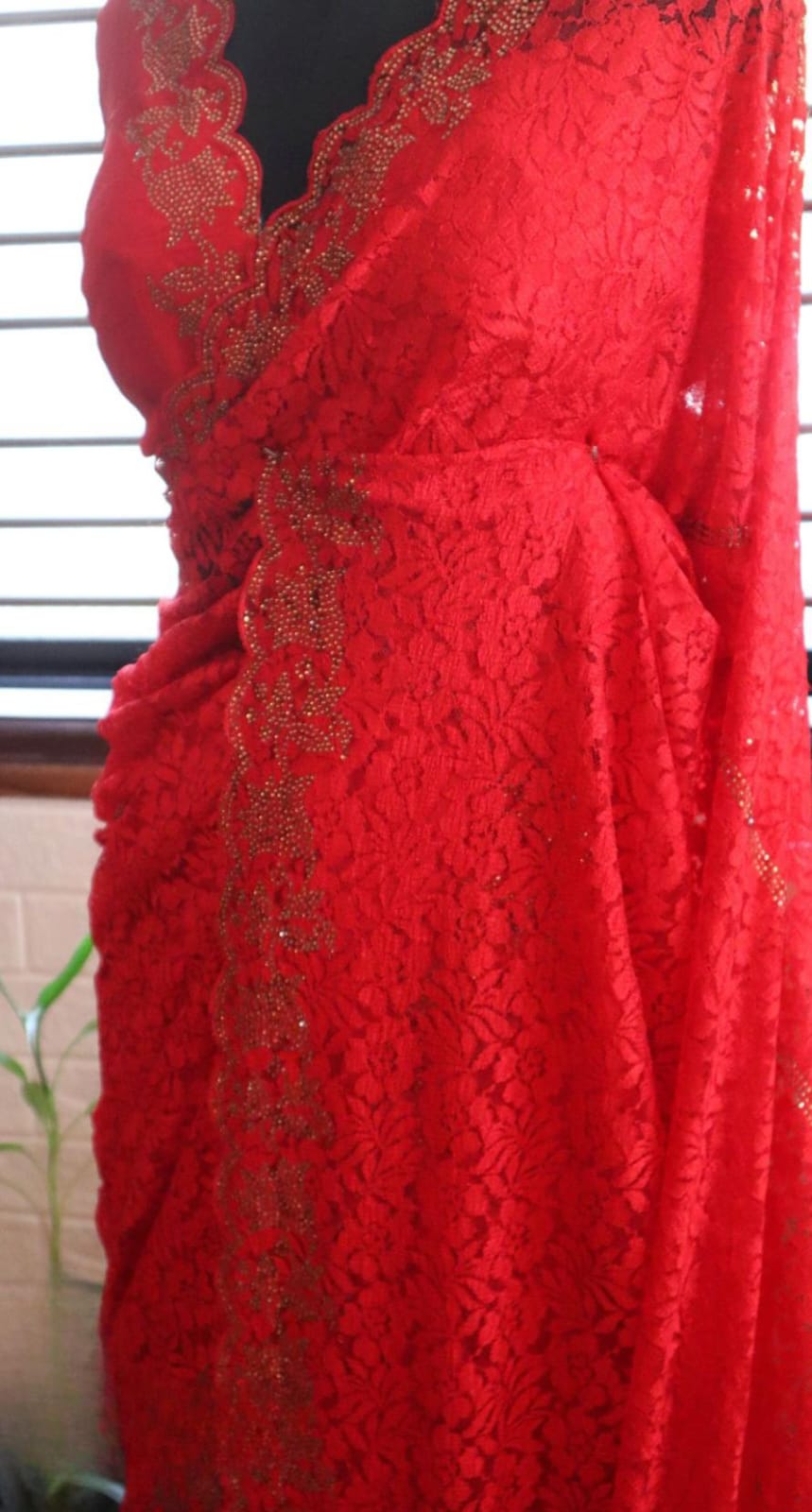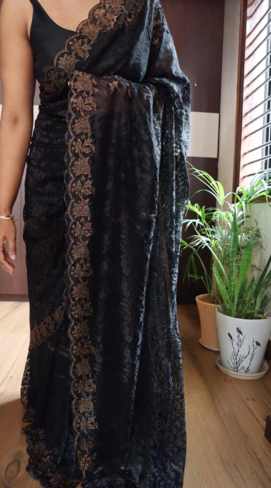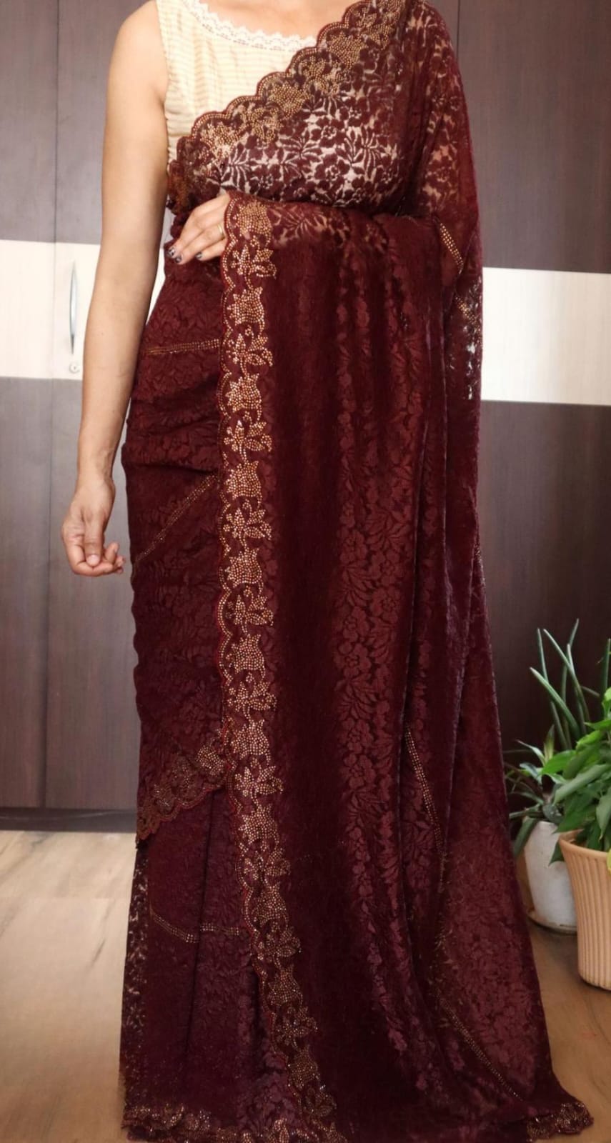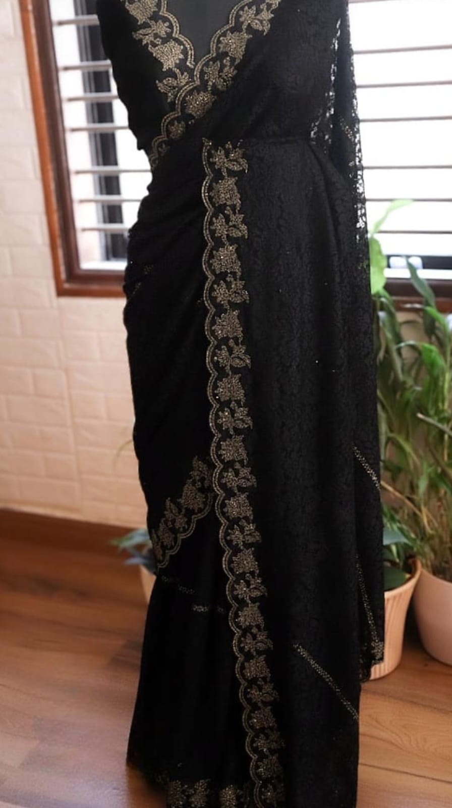 *Breathtaking Chantilly lace silk sarees, beautifully crafted in striking SWAROVSKI work all over.”
