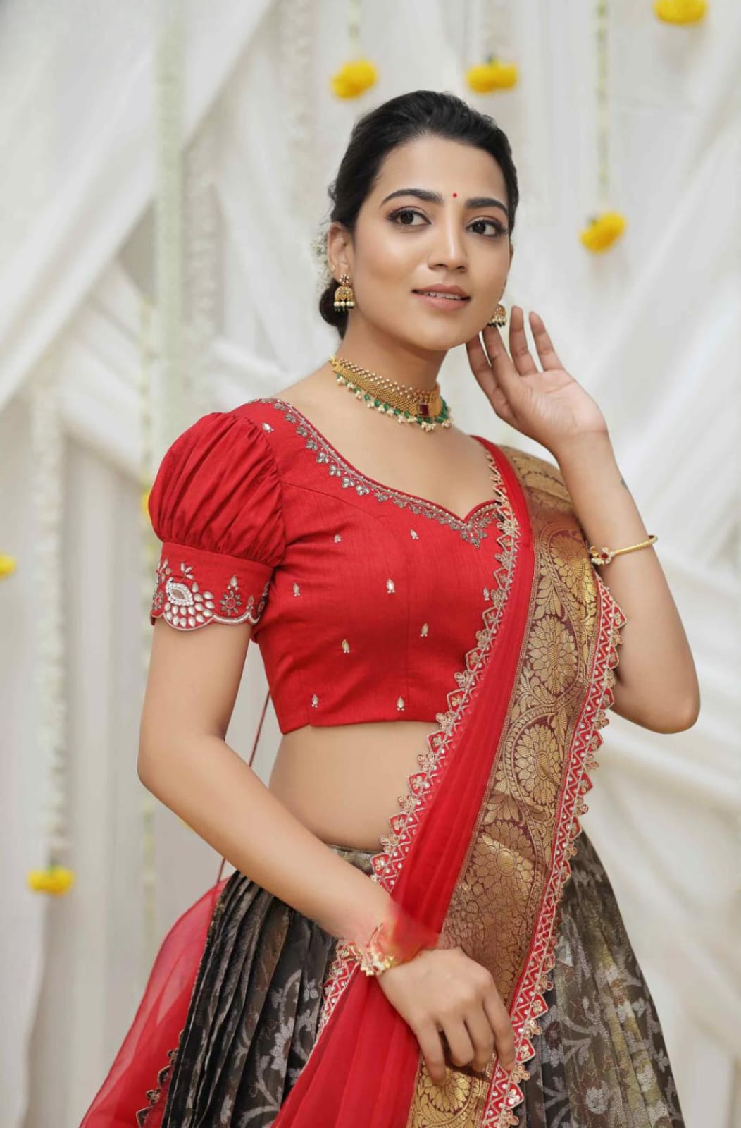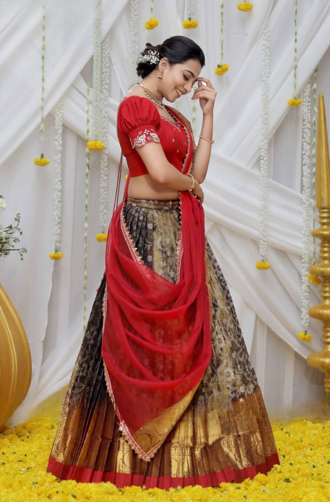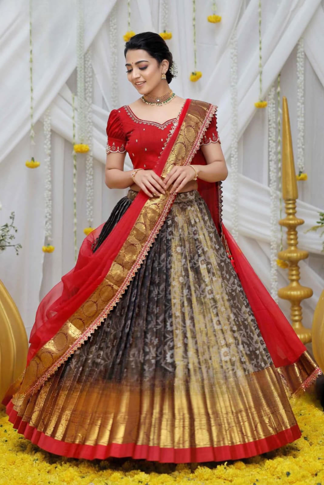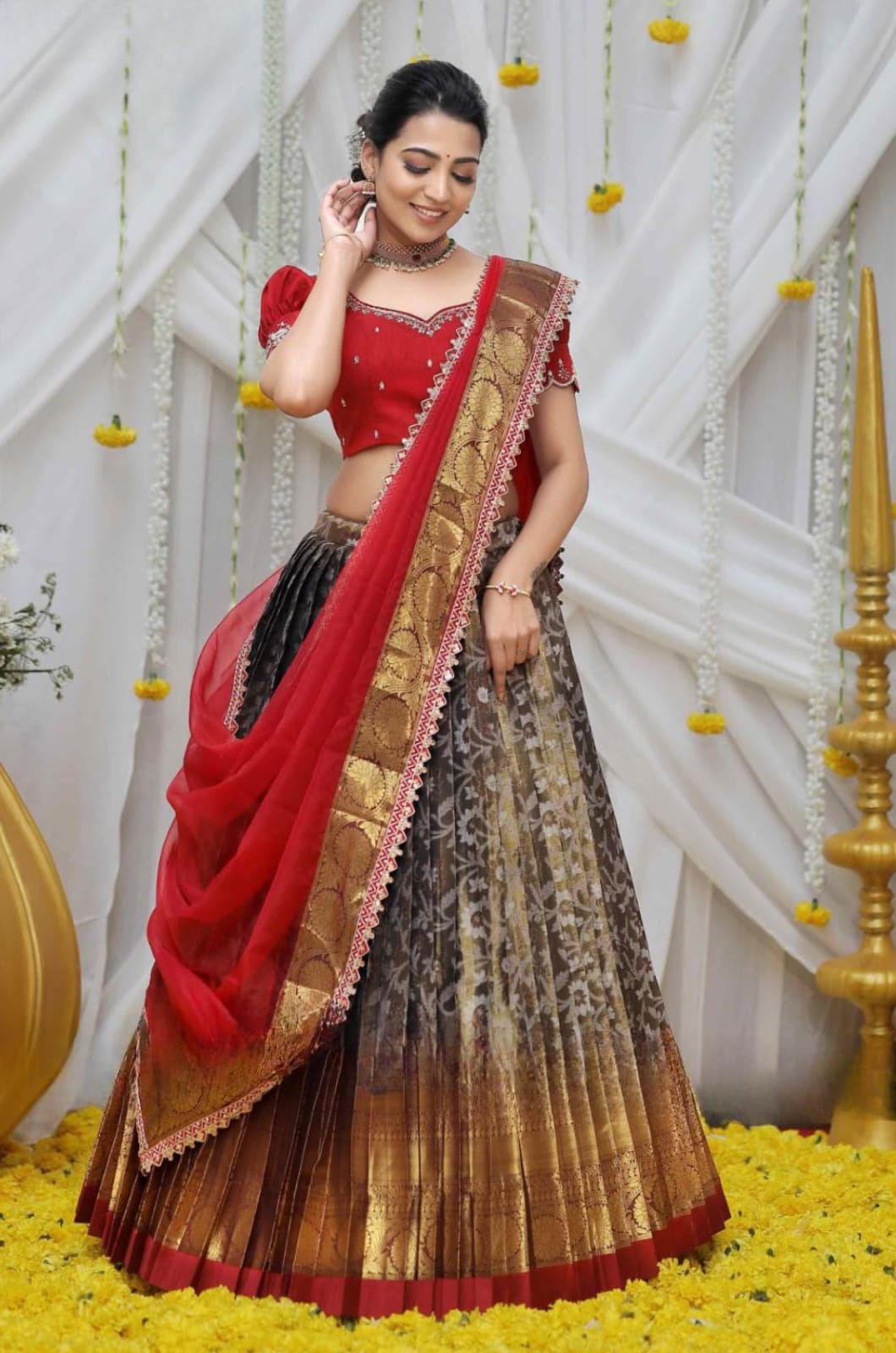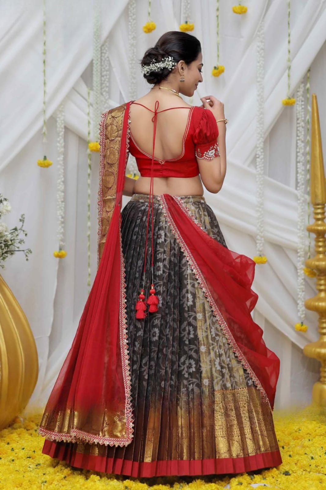 Complementing the lehenga is a Maroon Blouse meticulously crafted with Jardoshi work, adding a touch of glamour and sophistication to the attire. This Copper Banarasi Lehenga with Maroon Blouse and Dupatta is a timeless masterpiece that exudes elegance, refinement, and unmatched craftsmanship, perfect for weddings, festive occasions, or any special celebration.