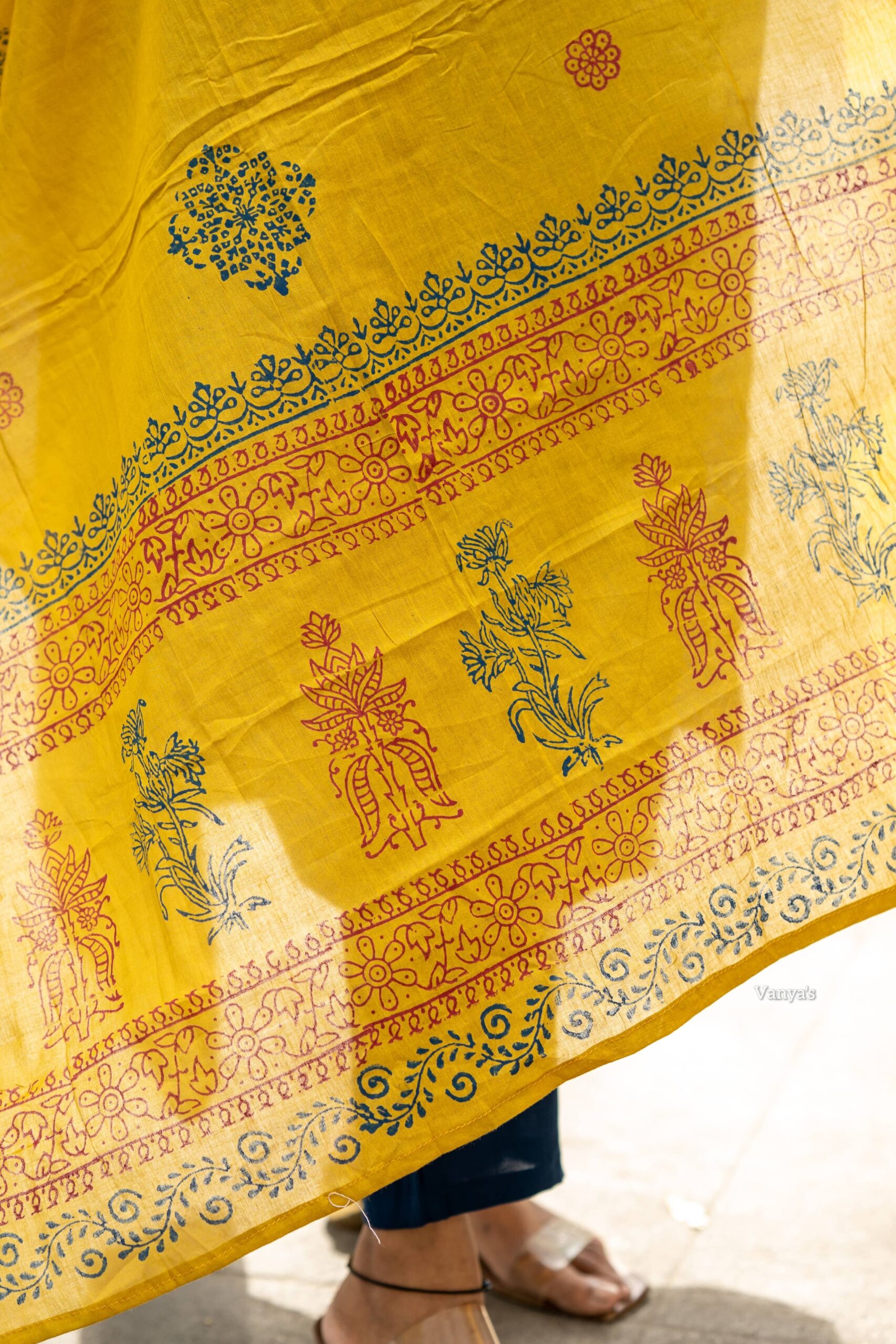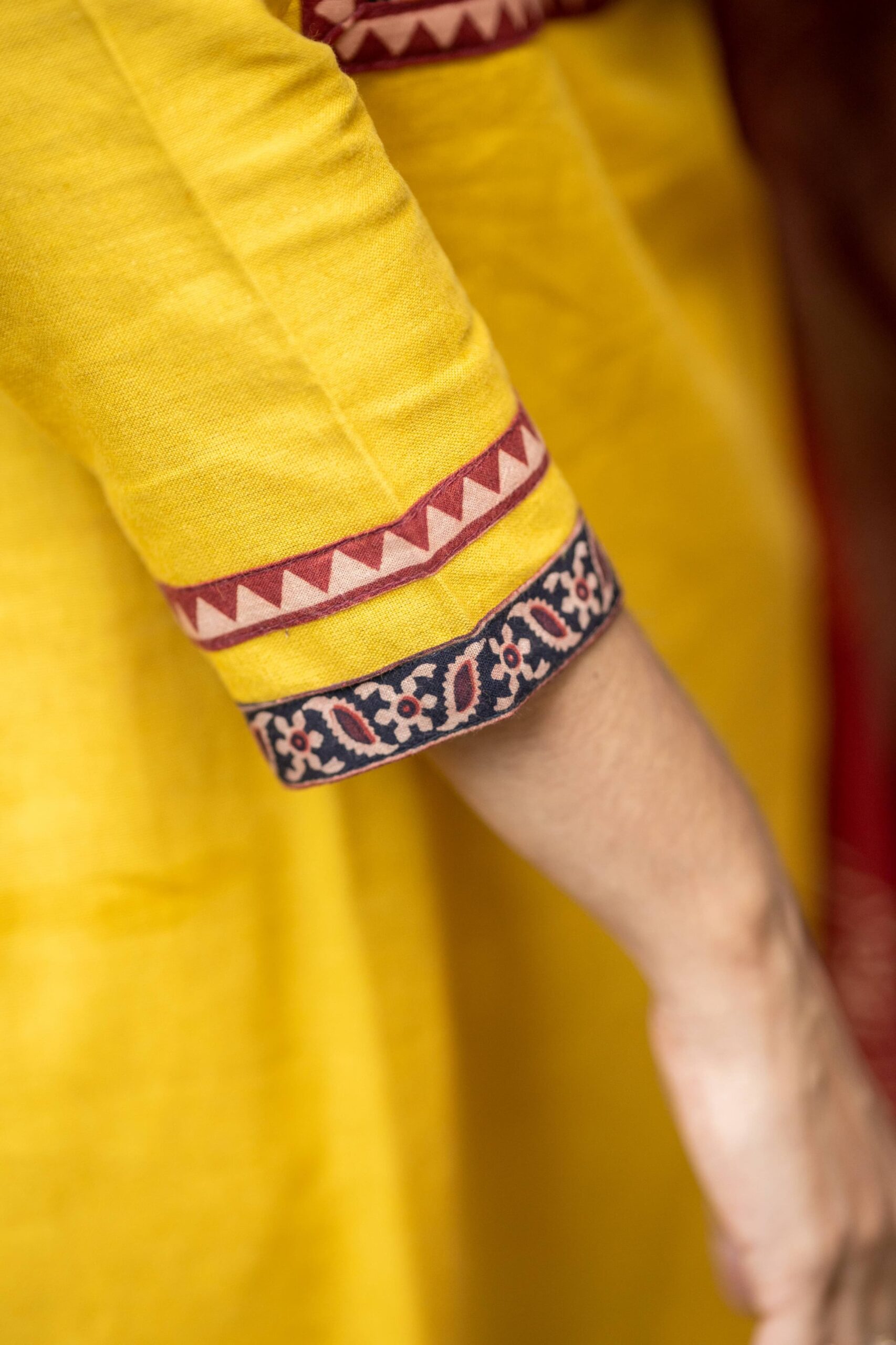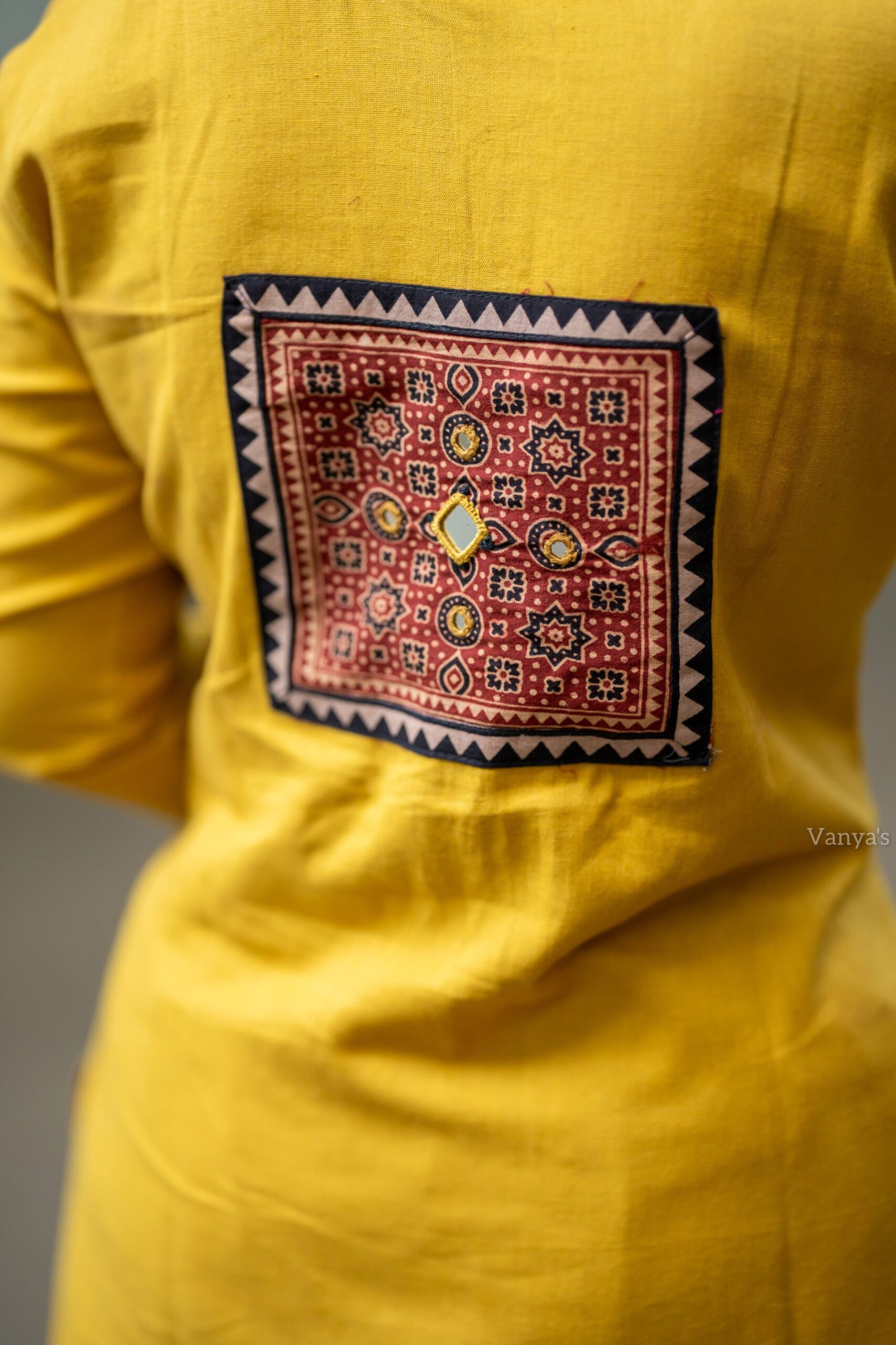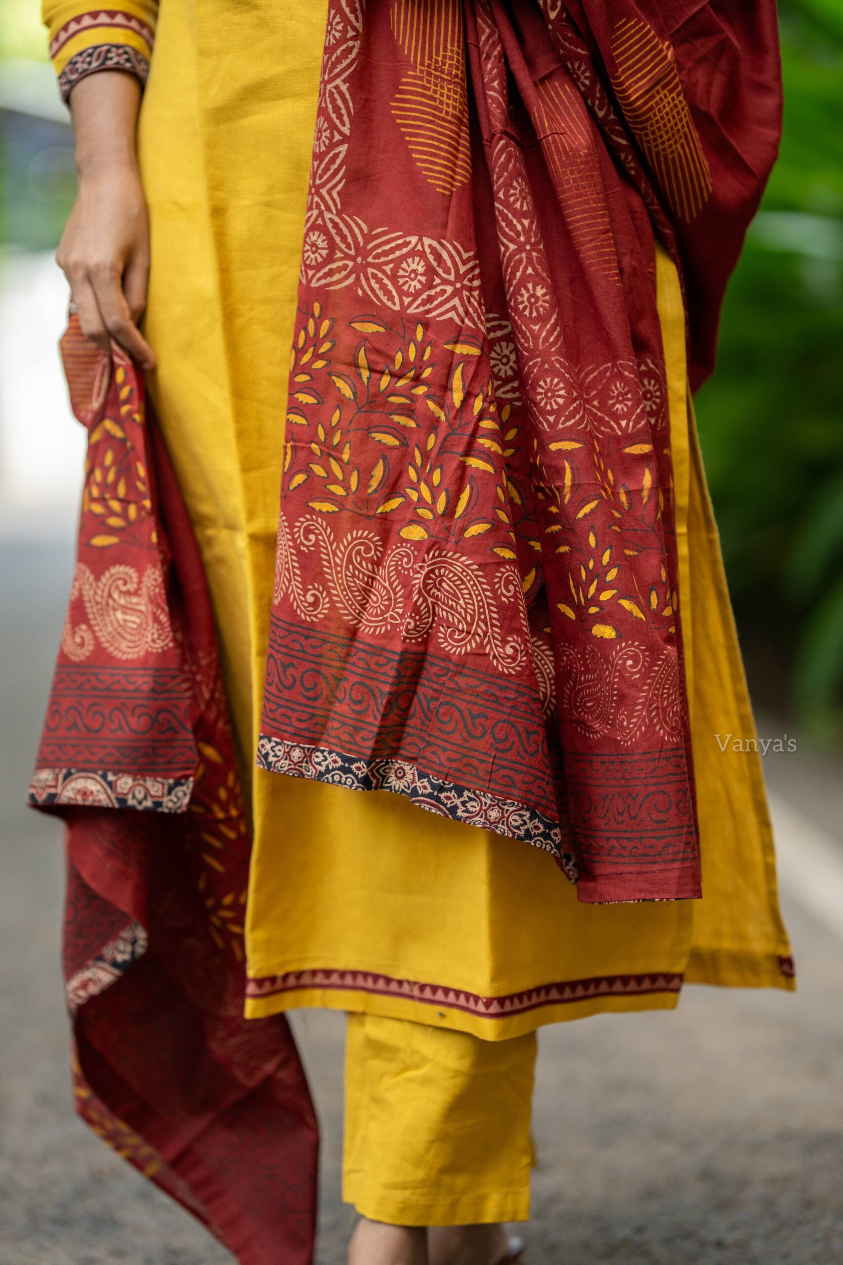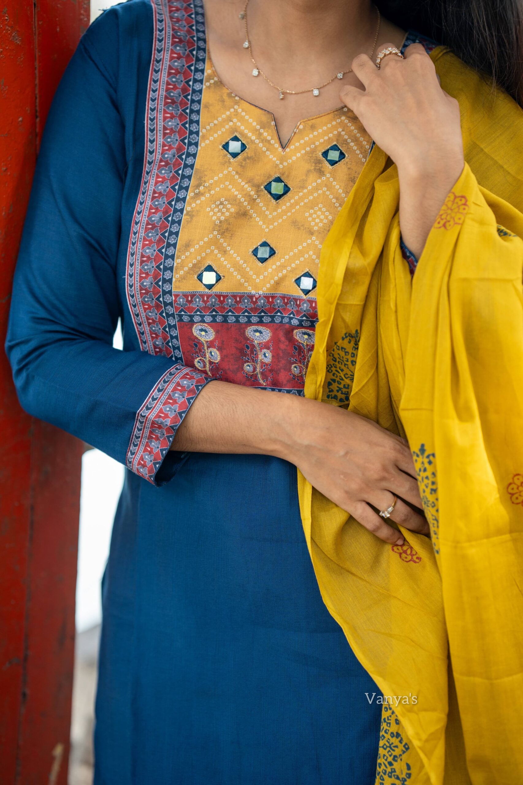The Nivea Blue and mustard yellow Charm Suit Set radiates comfort and charm with its roual blue base and artistic detailing. The straight-fit Handloom cotton kurta is adorned with a striking hand patch yoke , intricate sleeve borders. Paired with matching blue pants and a contrasting mustard yellow mul cotton dupatta featuring delicate block prints.