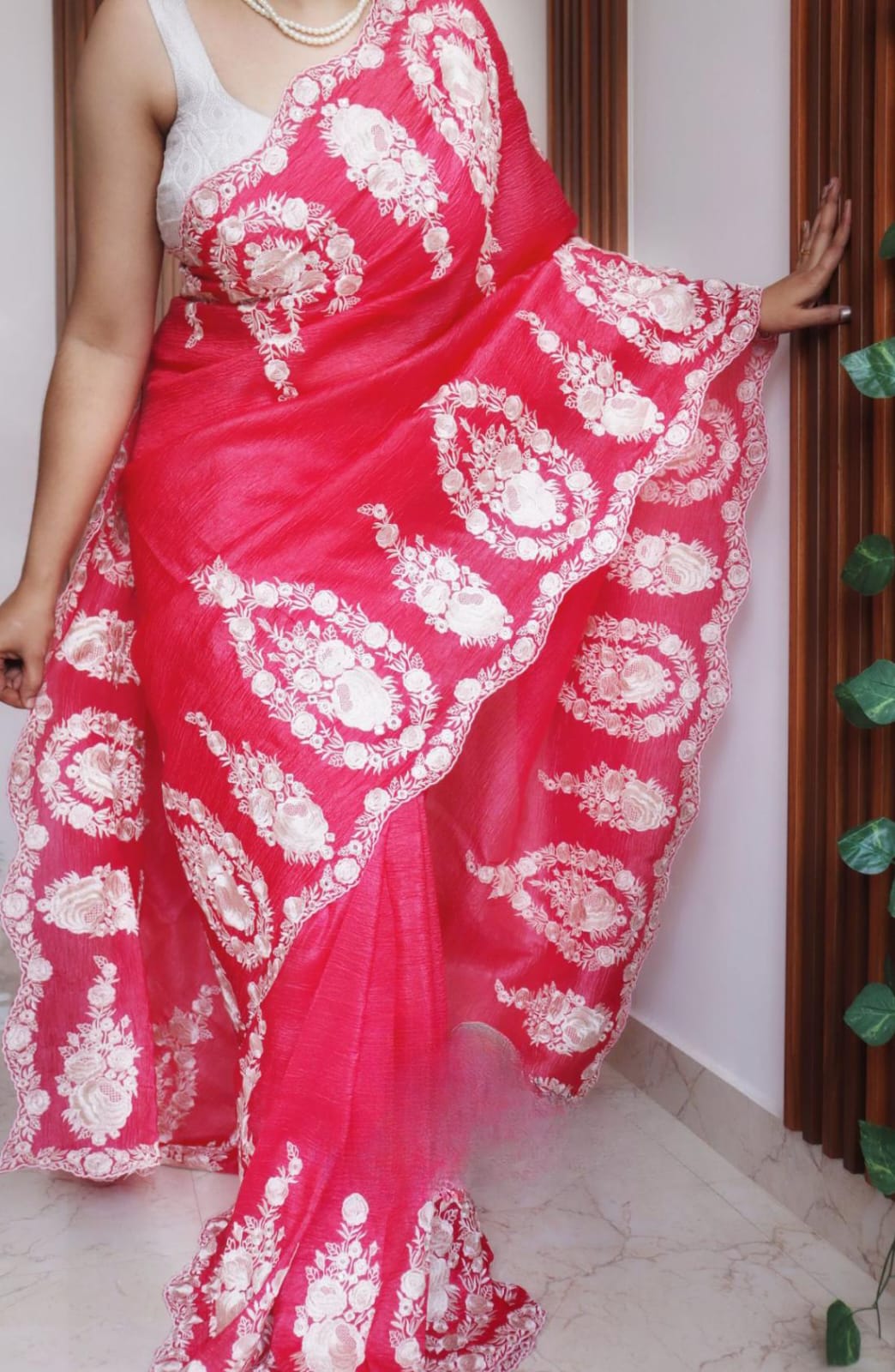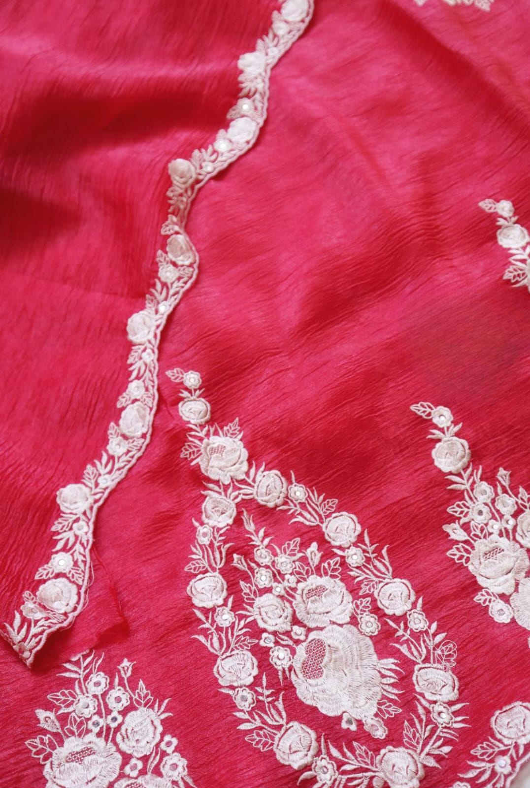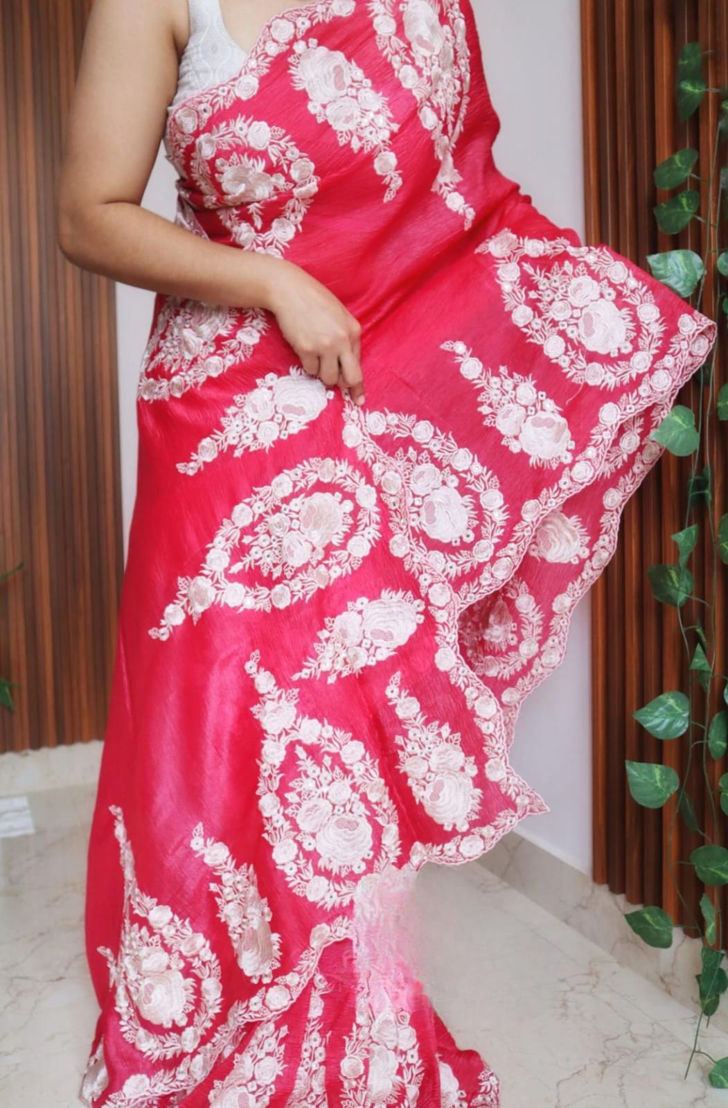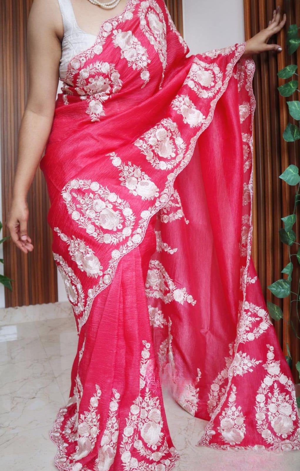 Blossom in beauty with this exquisite saree, showcasing intricate Parsi floral embroidery on crush tissue silk.