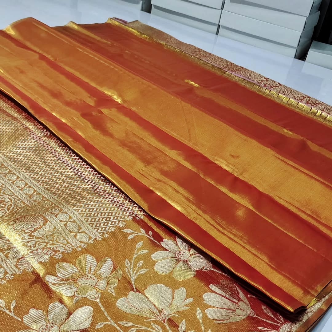 Exclusive wedding collection pure kanchipattu tissue flower brocade with meena work designs
