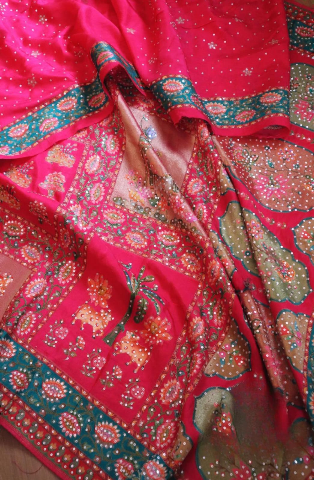 featuring intricate Kashmiri kani resham weaving in pichwai patterns and sequence work.
