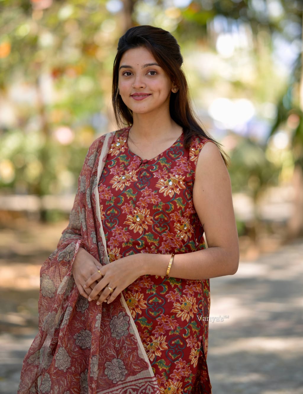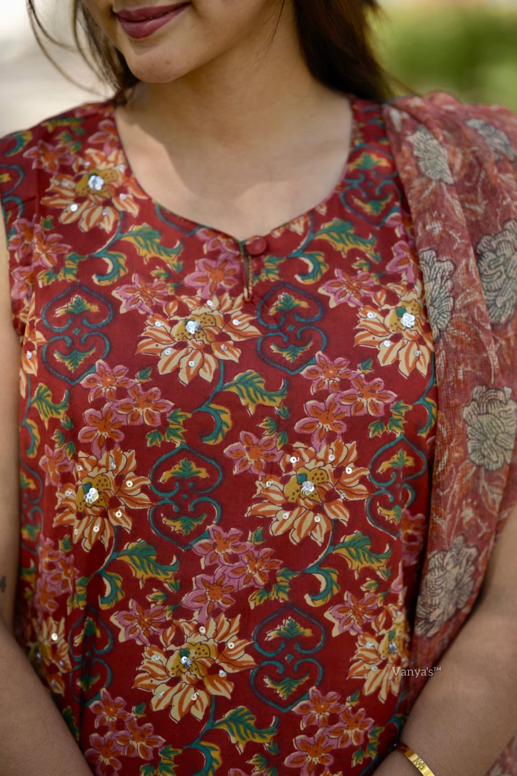 Simple Hand block printed suit sets Beautiful cotton hand block printed salwar suit. The fabric is adorned with intricate circular patterns in shades of red and multi-colours, creating a striking contrast. The matching dupatta features elegant designs complementing the suit’s print. The outfit is paired with straight-fit hand block pants. This comfortable and stylish salwar suit is perfect for casual wear or festive occasions..