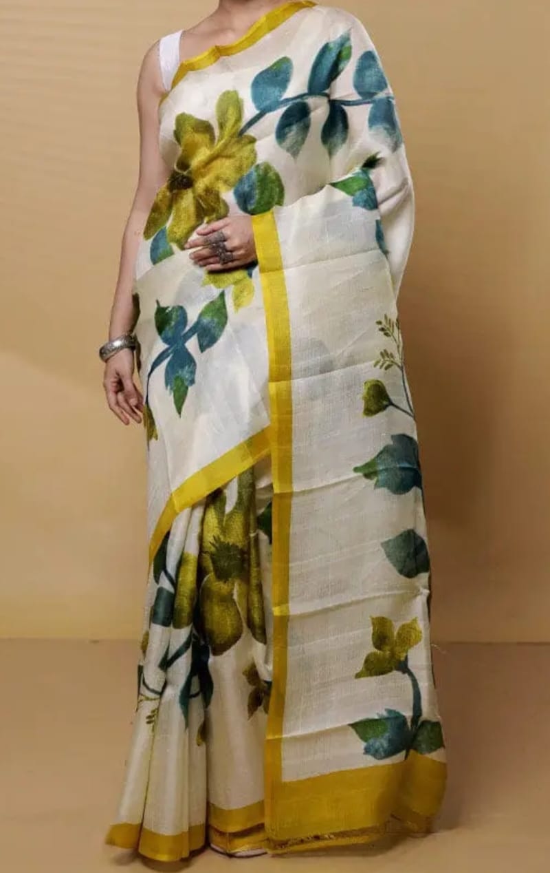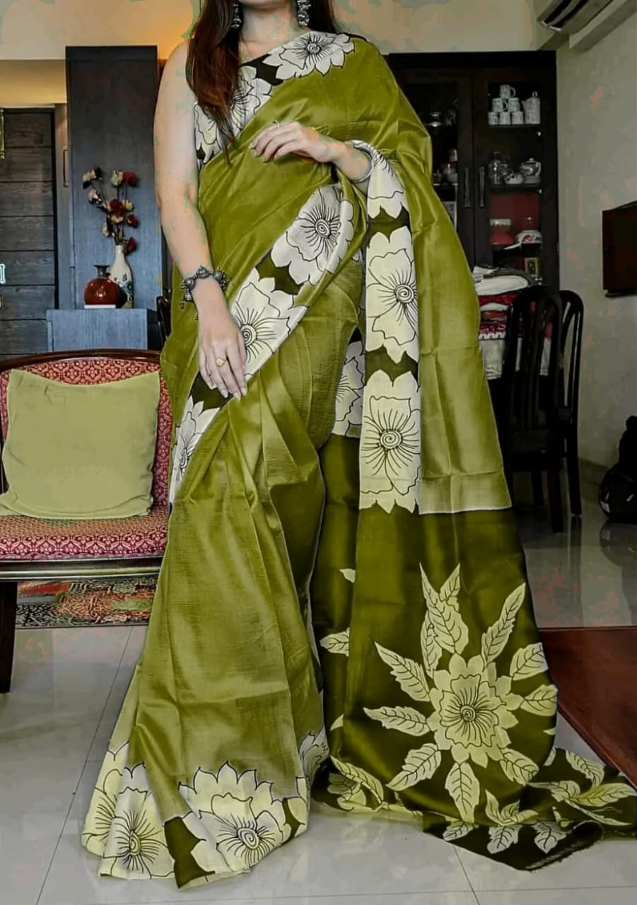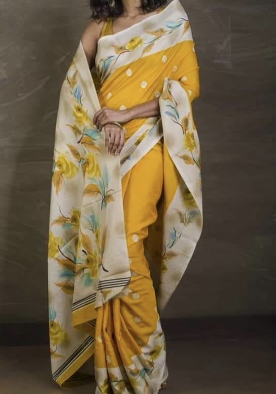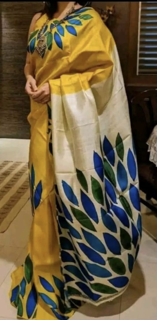 Exclusive hand painted design on zari border pure handloom tussar saree