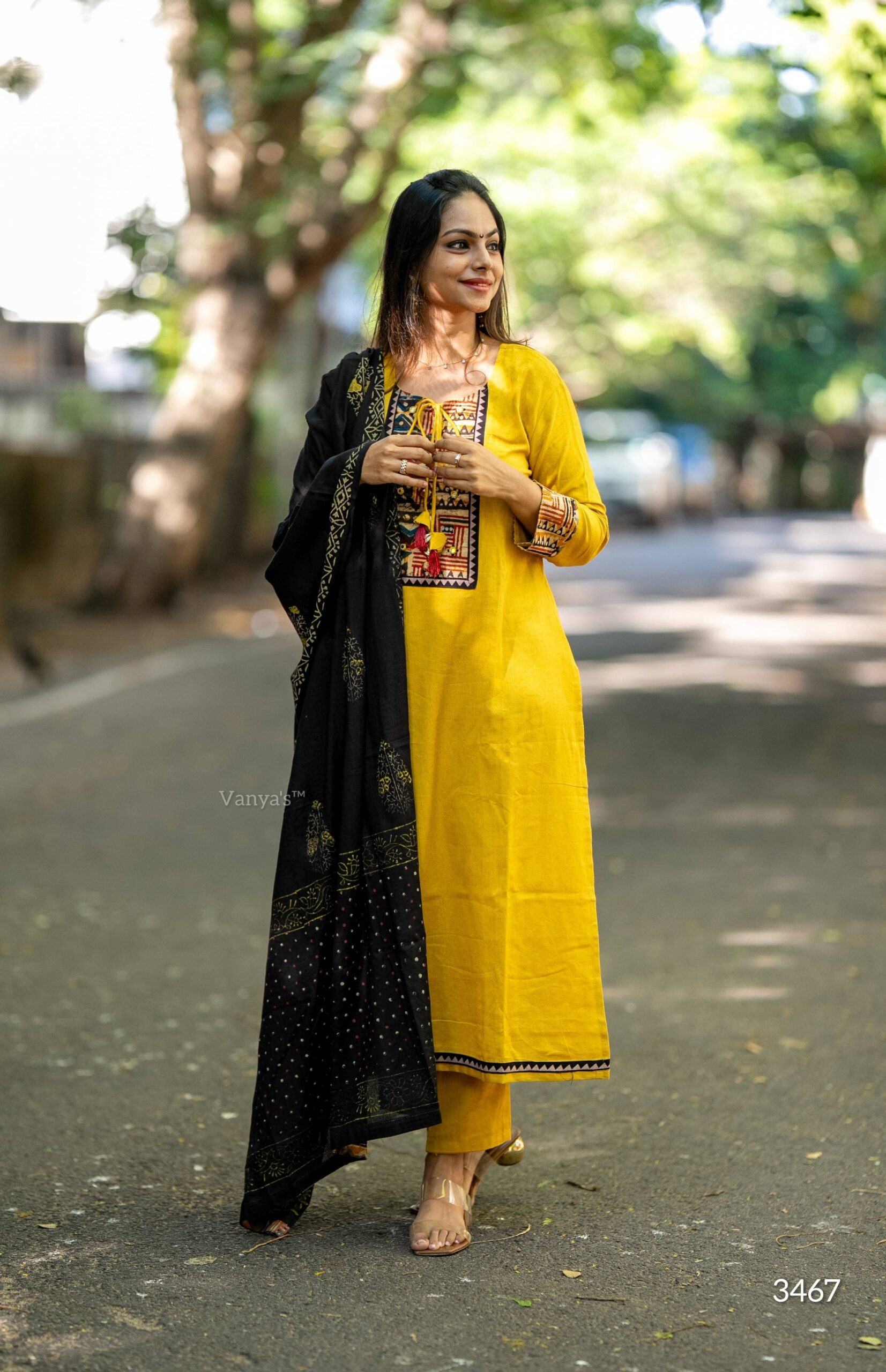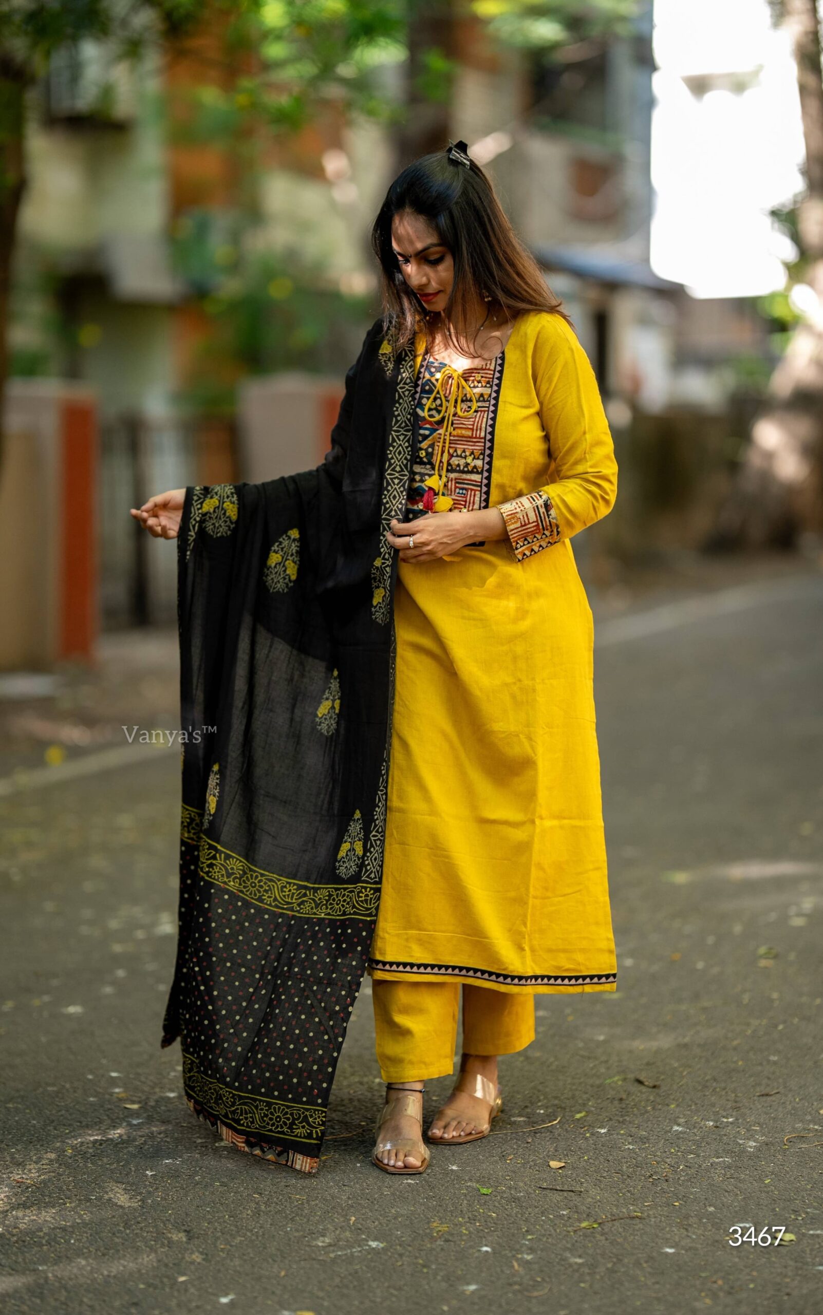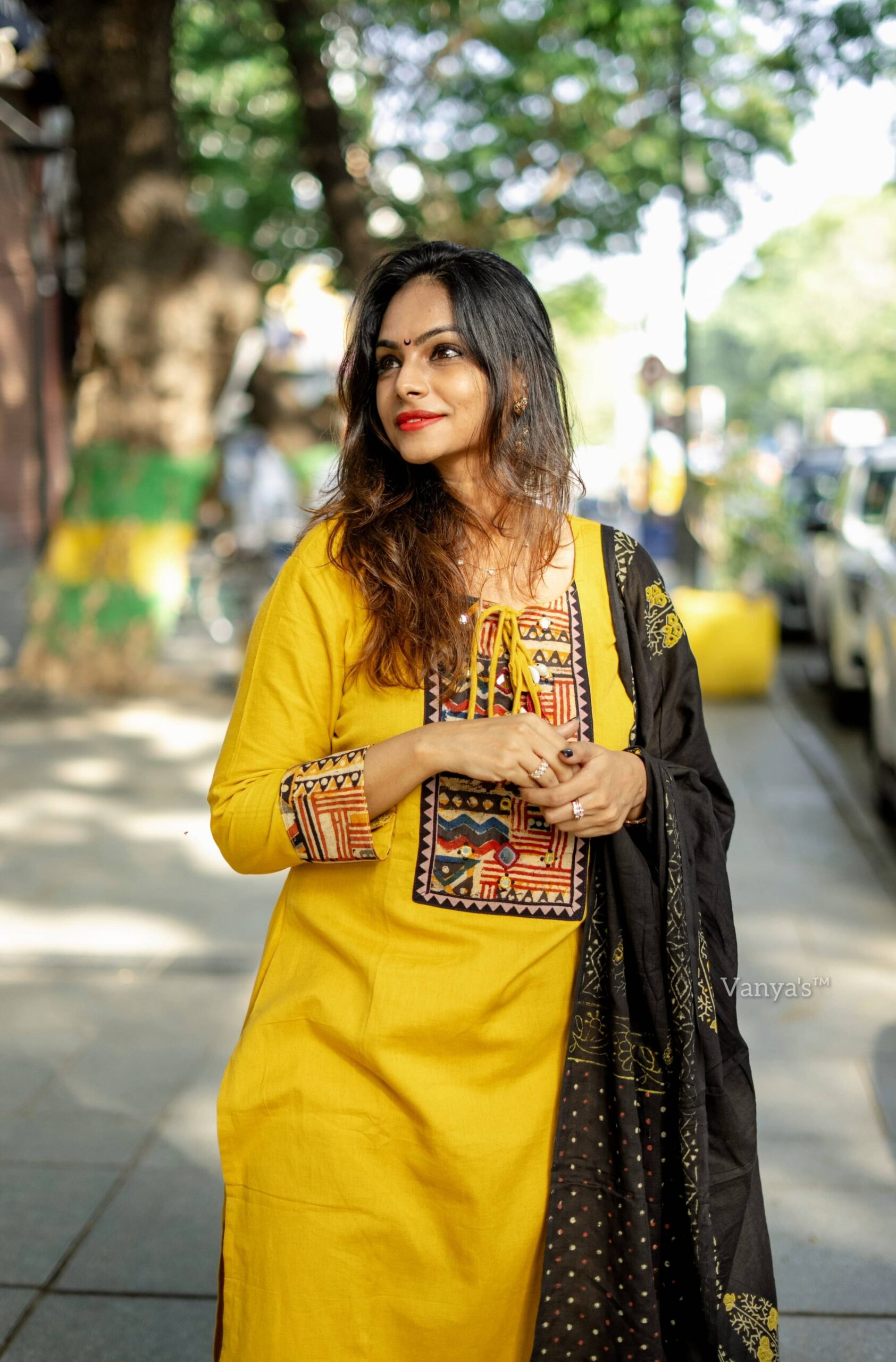 The Nivea Mustard Charm Suit Set radiates comfort and charm with its rich mustard yellow base and artistic detailing. The straight-fit *Handloom cotton* kurta is adorned with a striking embroidered yoke in tribal-inspired motifs, finished with playful tassels and intricate sleeve borders. Paired with matching mustard *Handloom cotton* pants and a contrasting black cotton dupatta featuring delicate gold block prints and a traditional border
