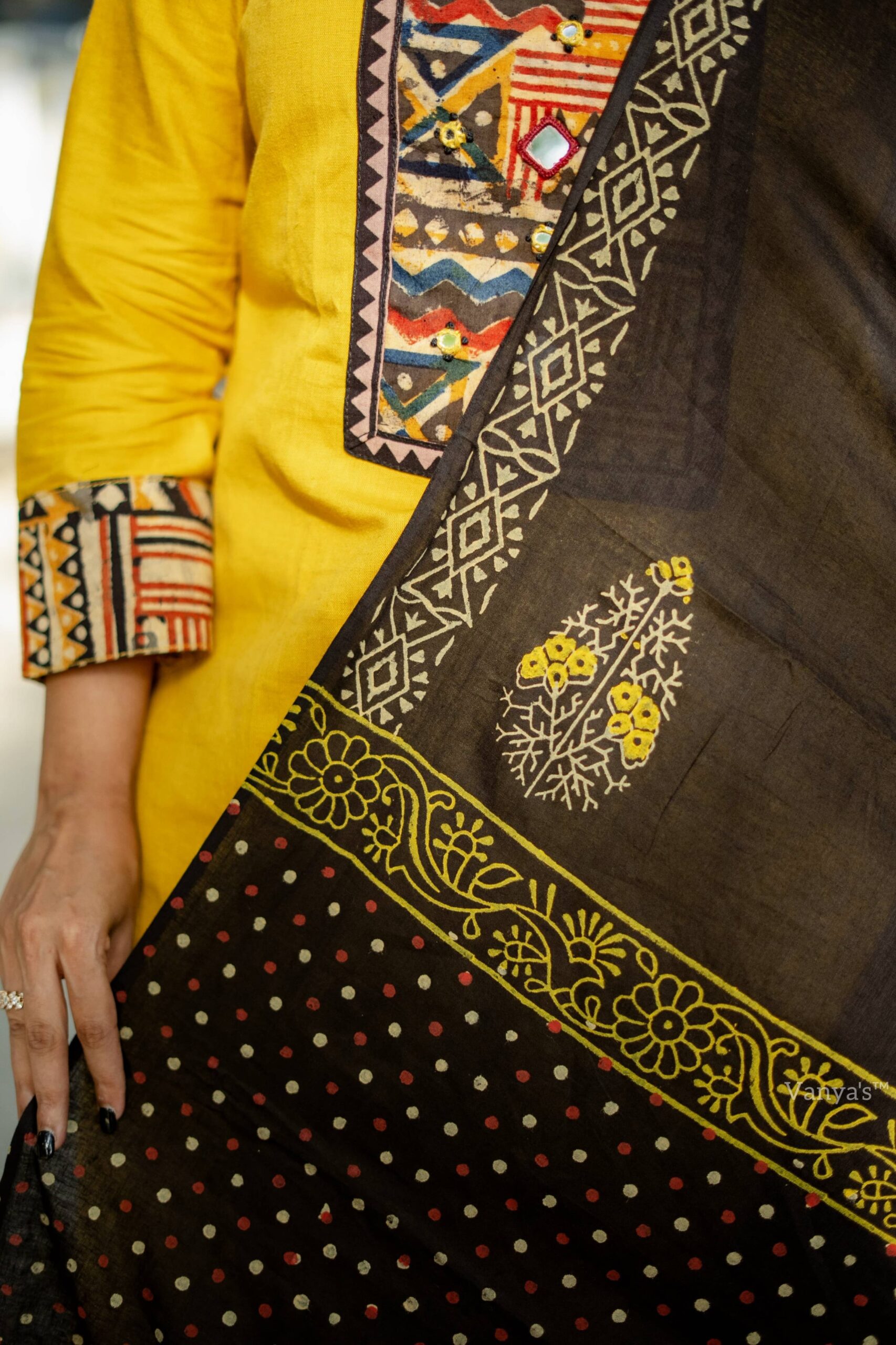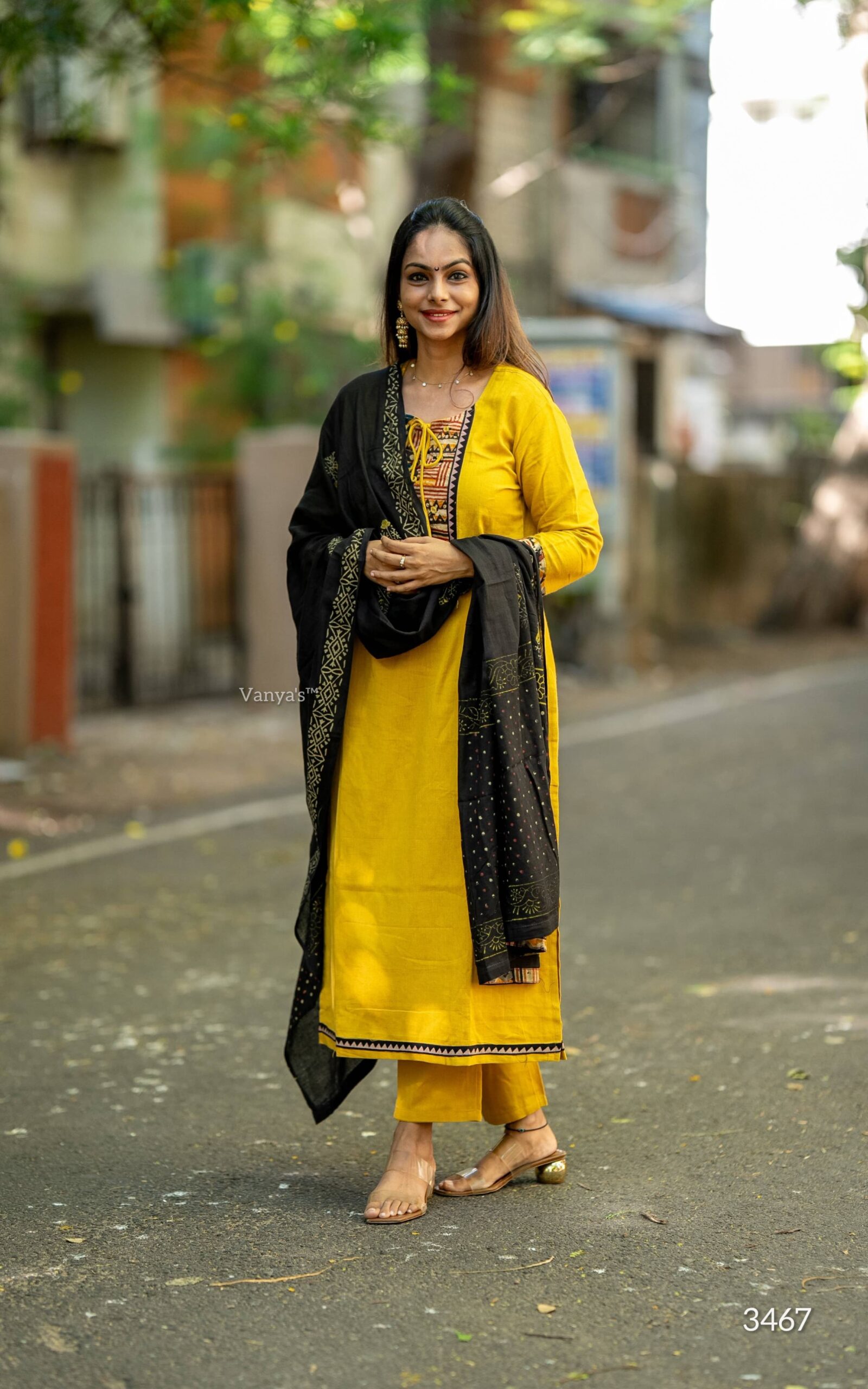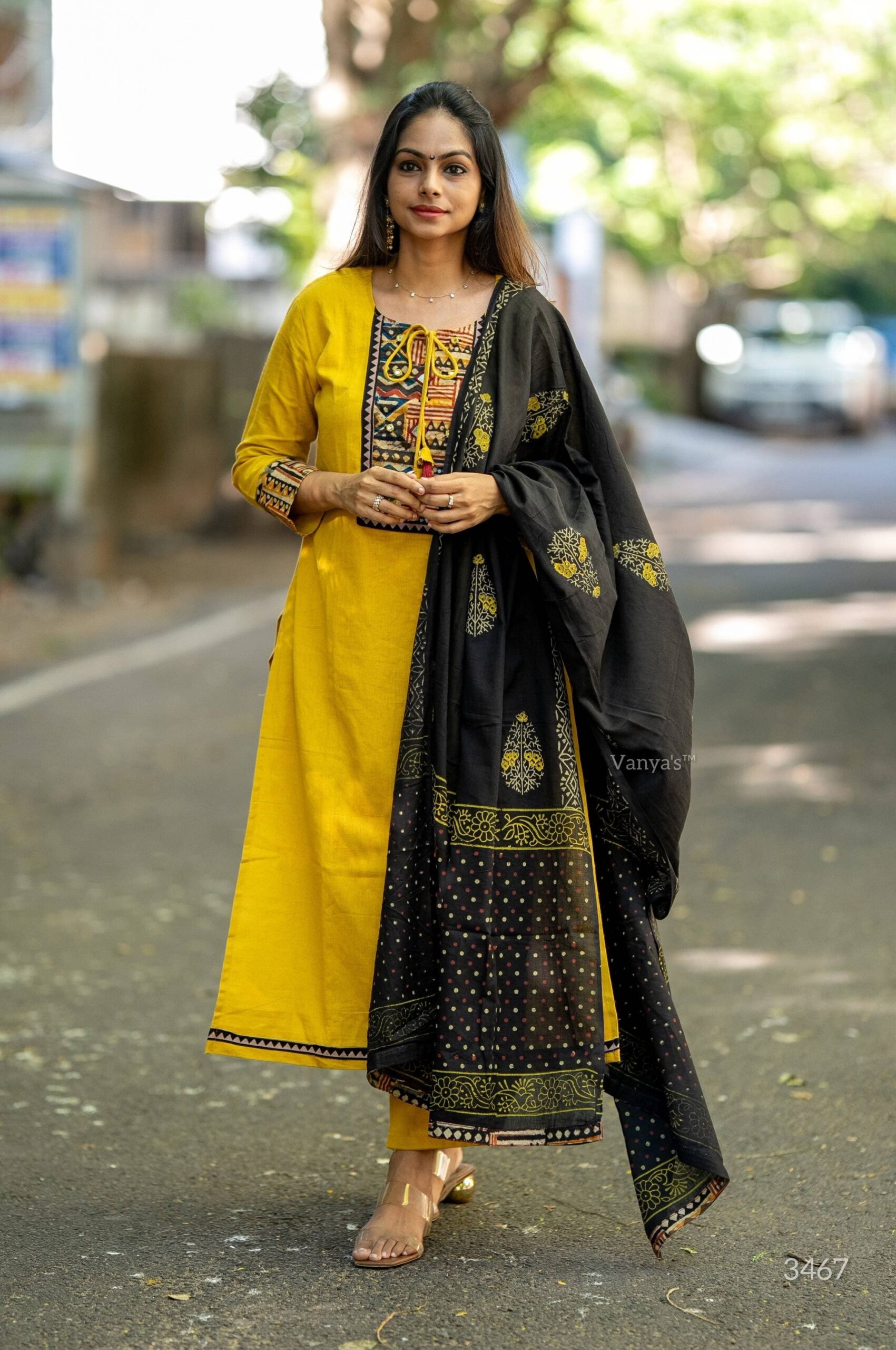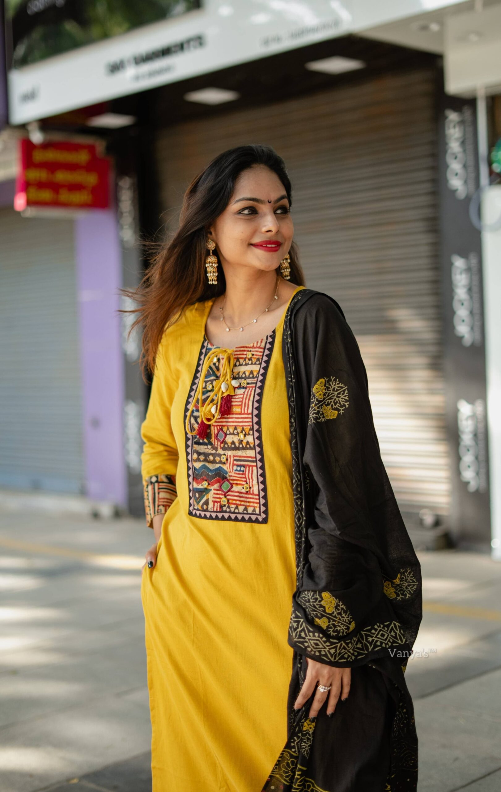 The Nivea Mustard Charm Suit Set radiates comfort and charm with its rich mustard yellow base and artistic detailing. The straight-fit *Handloom cotton* kurta is adorned with a striking embroidered yoke in tribal-inspired motifs, finished with playful tassels and intricate sleeve borders. Paired with matching mustard *Handloom cotton* pants and a contrasting black cotton dupatta featuring delicate gold block prints and a traditional border