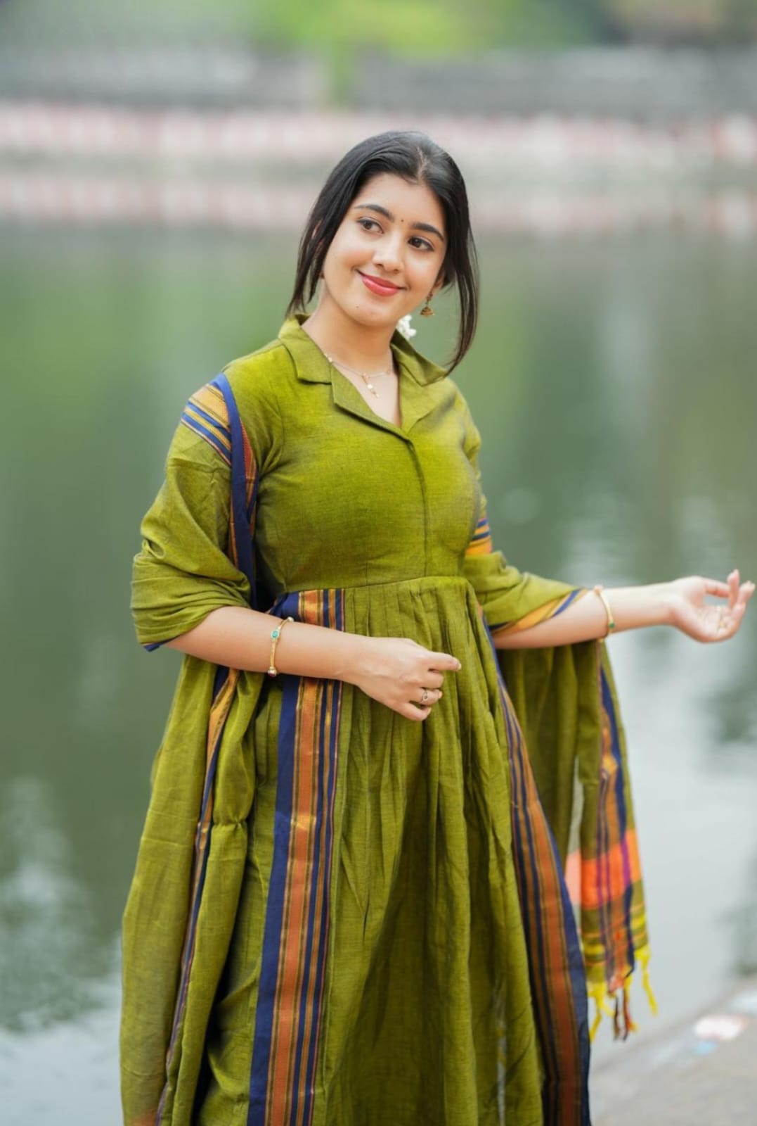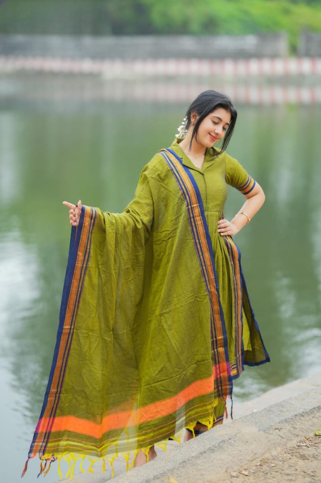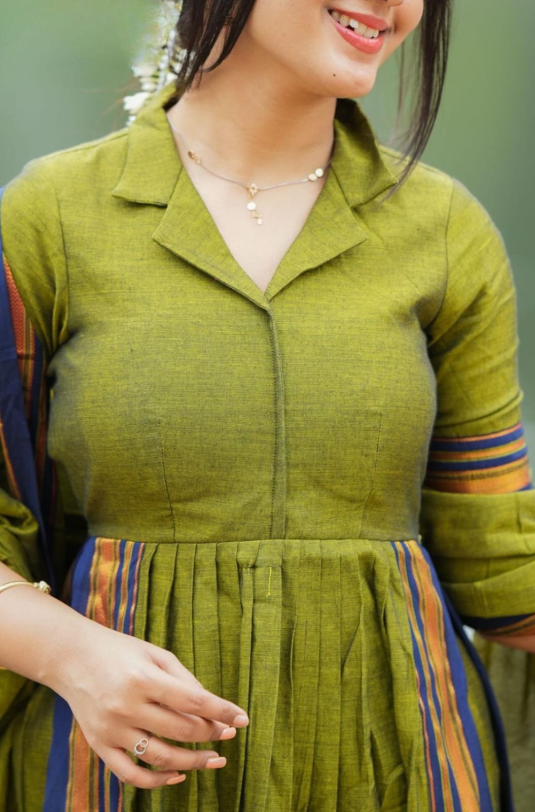 Presenting a Syahi Handloom Suit Set in Olive Green. It’s the perfect, vibrant, elegant, rich olive color outfit. The kurta features a detailed classic collar neckline, making it an ideal choice for office wear. The thread-weaving border along the edges of the handloom cotton fabric adds an ethnic charm. Complementing the kurta with a matching dupatta in the same color enhances the richness and sophistication of the look. The kurta incorporates a pleat to ensure comfort. The pocket is available in pants for ease and convenience, making it perfect for cultural events, festive celebrations, or even home-gathering ceremonies.