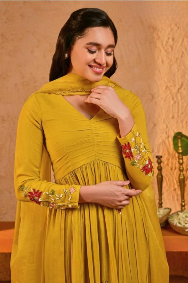 This sunny yellow A-line Anarkali kurta set is crafted in soft cotton georgette, giving you both comfort and elegance in one stunning piece.The kurta is beautifully enhanced with delicate handwork and patchwork details that bring a subtle festive glow. Paired with classic chanderi pants and a light, airy organza dupatta, this outfit is designed to flow with you through every celebration.Whether it’s a haldi, festive gathering, or daytime wedding event – this set is a perfect pick for a graceful and easygoing ethnic look. Lightweight, lively, and made to shine – this yellow kurta set is a wardrobe must-have!