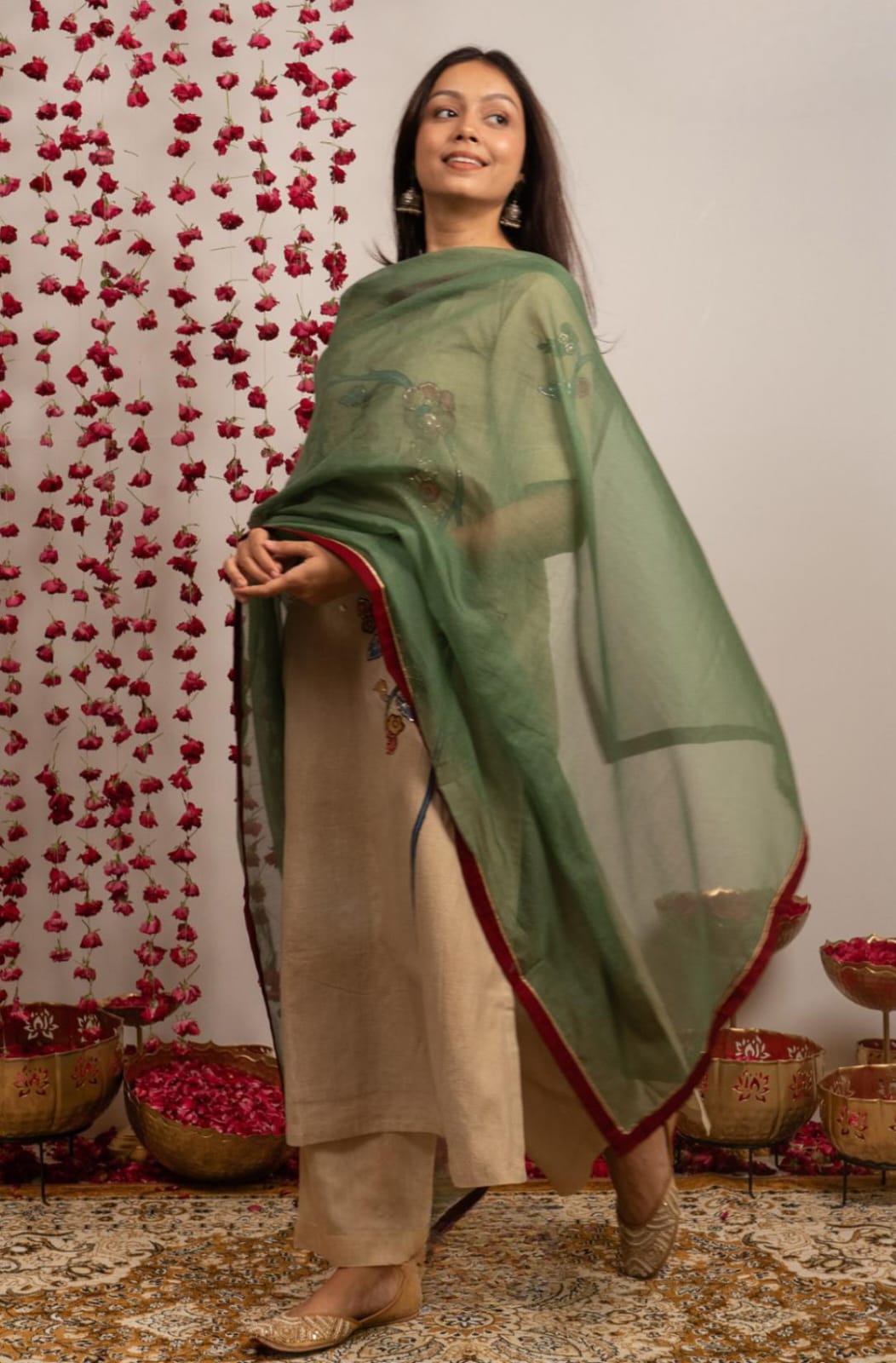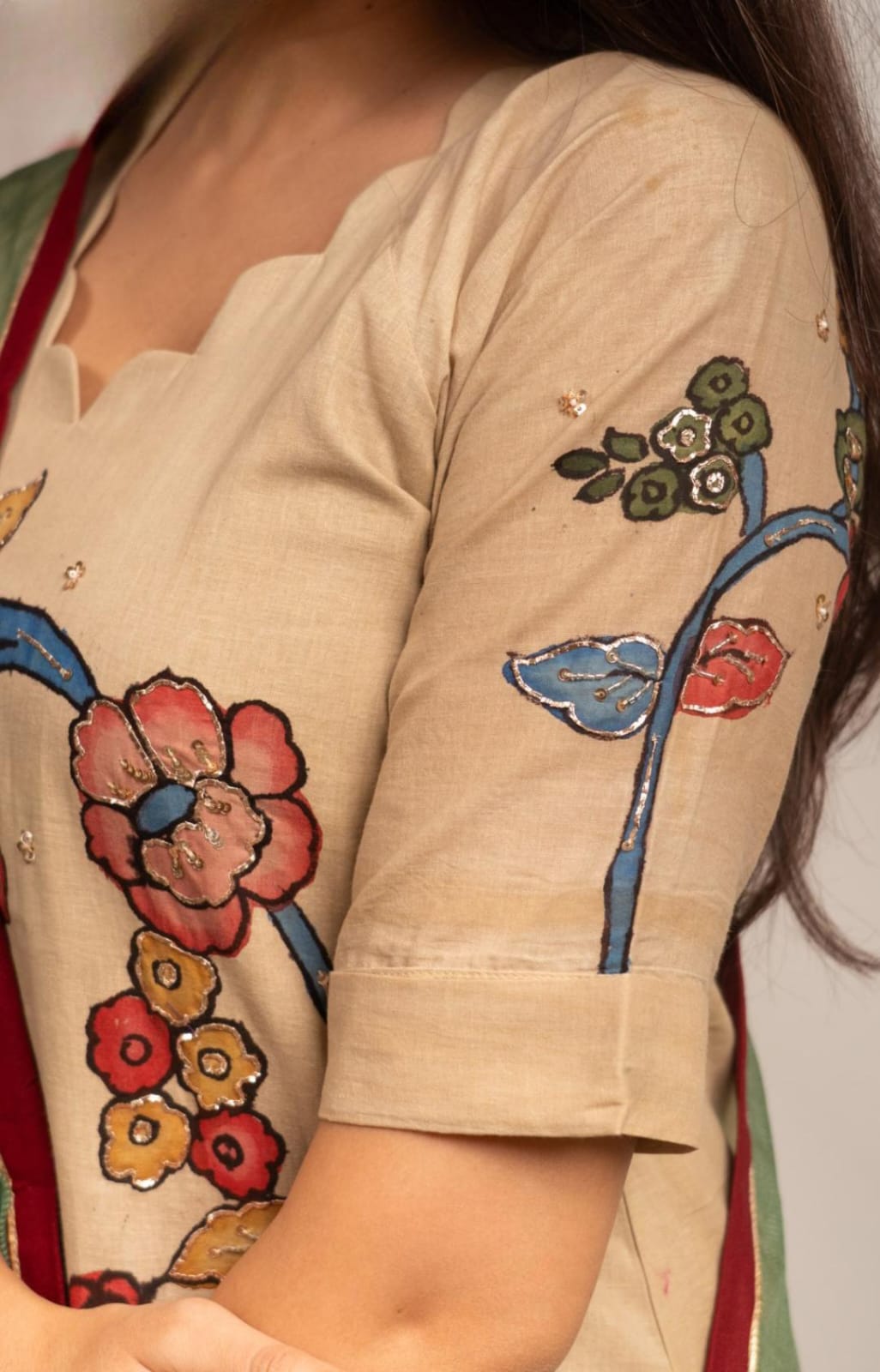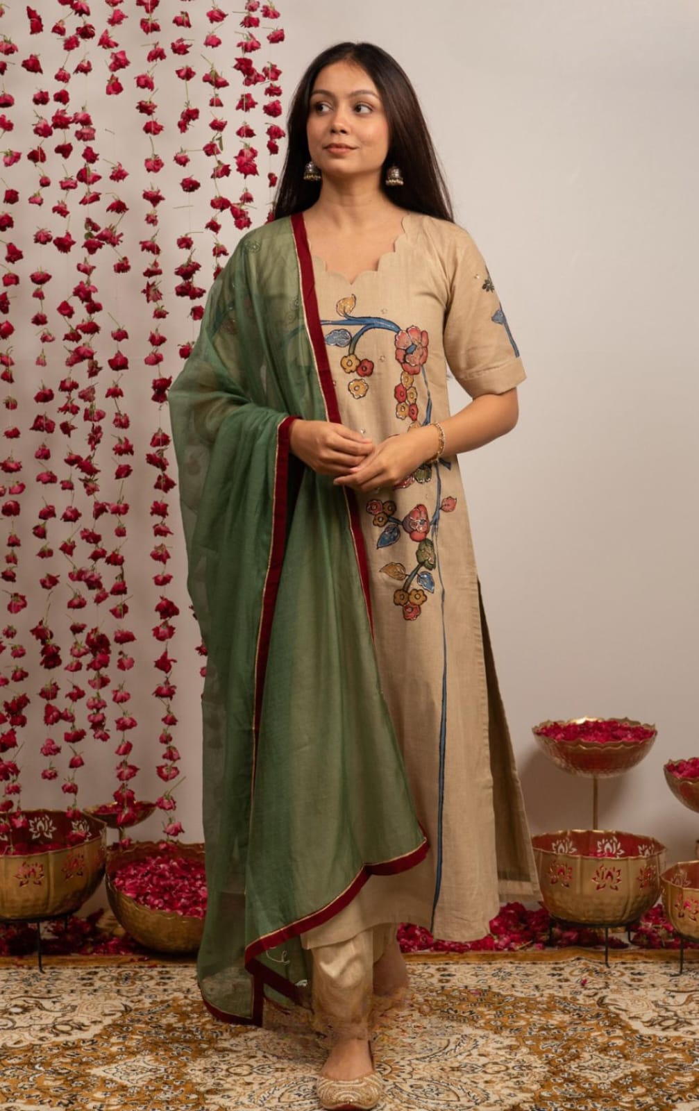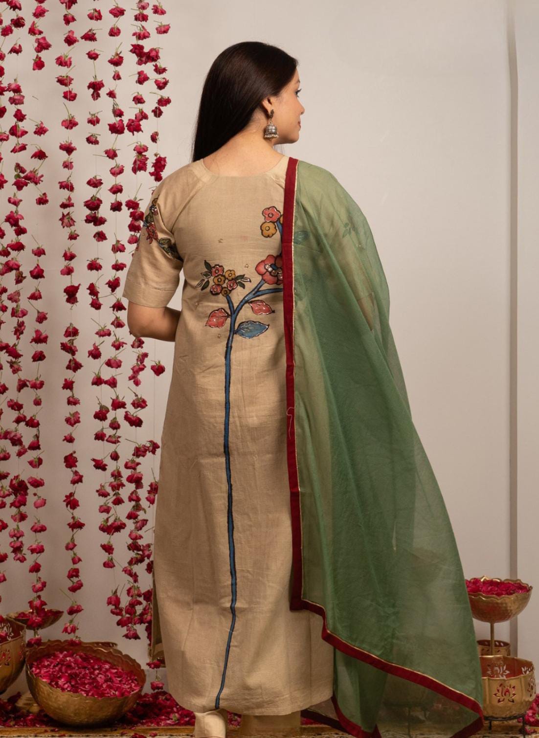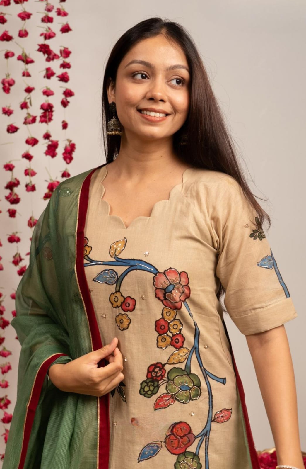 🎨Authentic Pen Kalamkari Elegance – 3-Piece Cotton Set Celebrate tradition with a touch of artistry in this original Pen Kalamkari kurta set, meticulously handcrafted on pure cotton fabric. The kurta features beautiful hand-highlighted details that bring every motif to life, making it a wearable canvas of heritage and craftsmanship.Paired with a lightweight kota dupatta, this set offers a breezy yet elegant look, enhanced by subtle textures and delicate drape. Completing the trio is a slim pencil pant, tailored for comfort and a modern silhouette. *Dress Code:* BK1126N Kurta Detail:- Neck depth: 7 inches Length: 46 inches Sleeves: 11.5 Inches Pant Detail:- Length: 39 inches Closure: Elastic with zip at the bottom Dupatta Detail:- Fabric : kota Doria What You Will Receive: 1 Kurta and 1 pant and 1 Duptta Wash Care: 1st wash stritct Dry Clean only, 2nd wash onwards mild shampoo wash. *SIZE:* S to XXL
