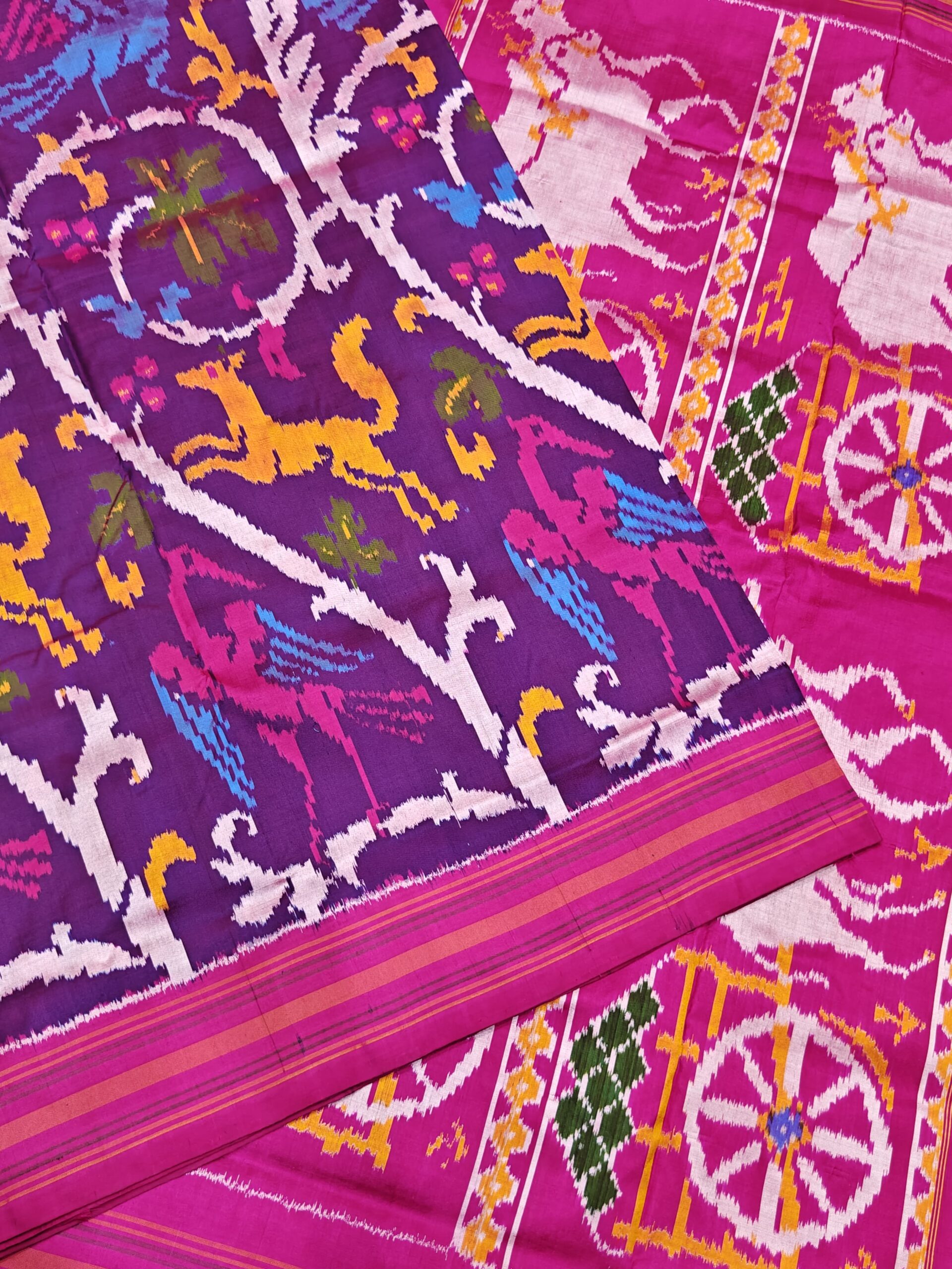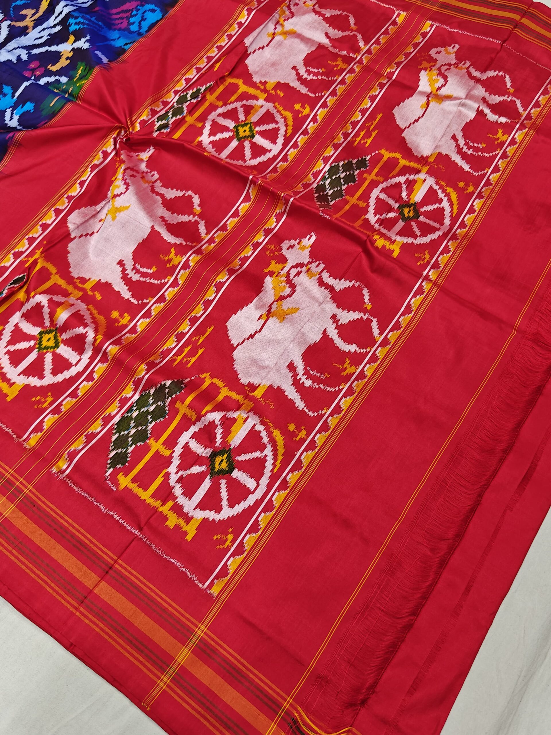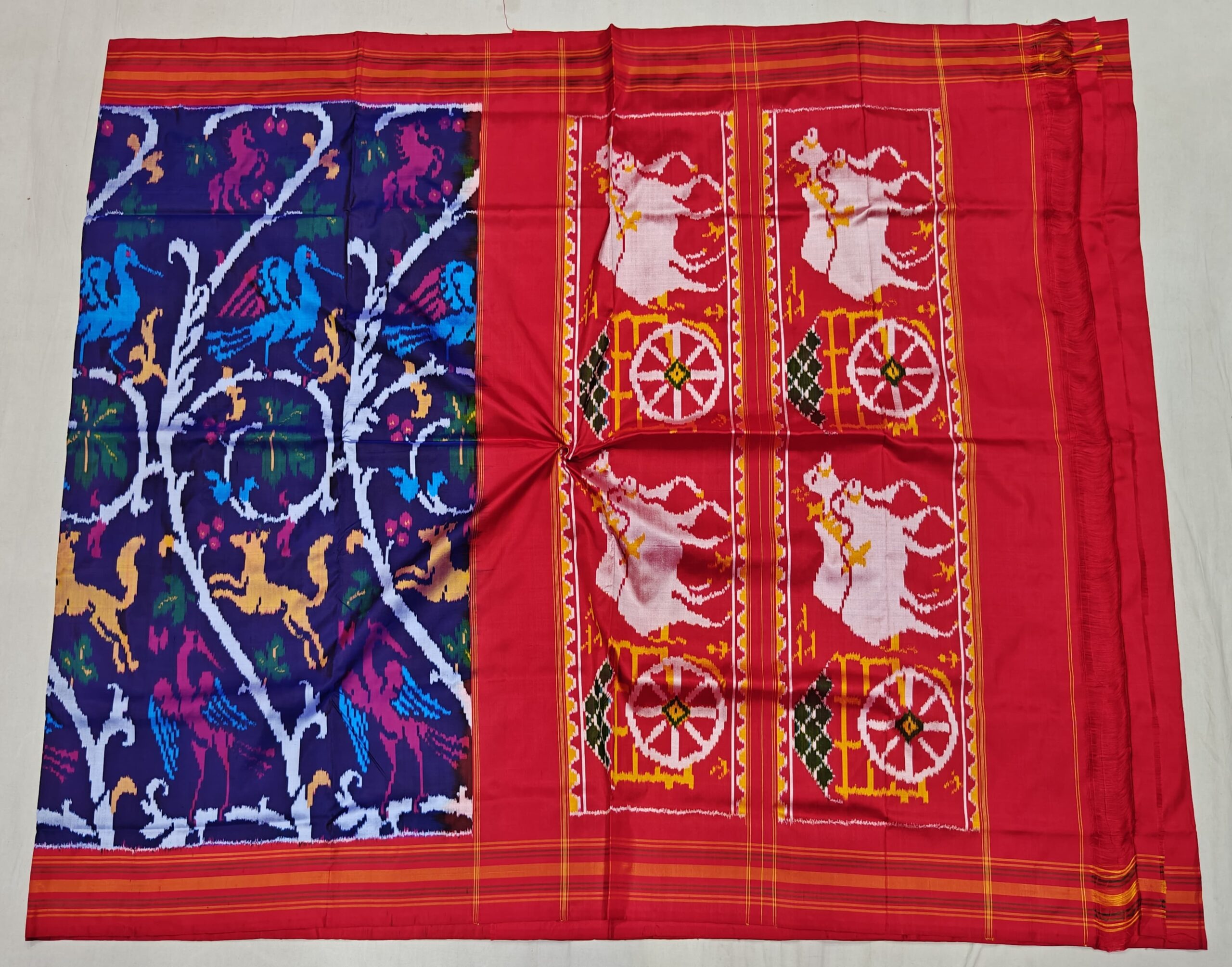 Each saree is carefully handwoven using premium-quality pure silk threads, offering a luxurious feel and graceful fall. The vibrant color combinations and symmetrical motifs make it a perfect choice for weddings, festive gatherings, and special occasions.