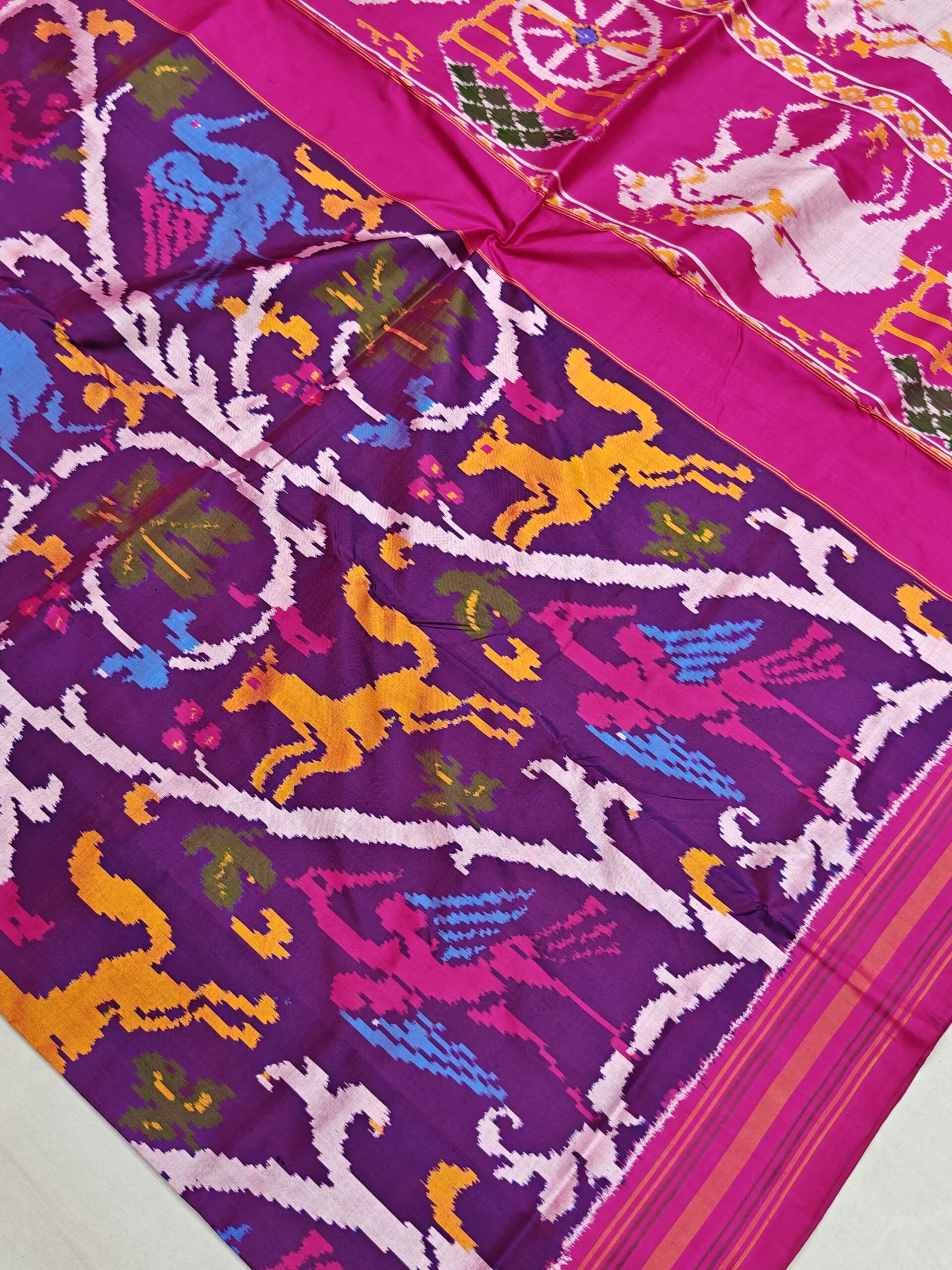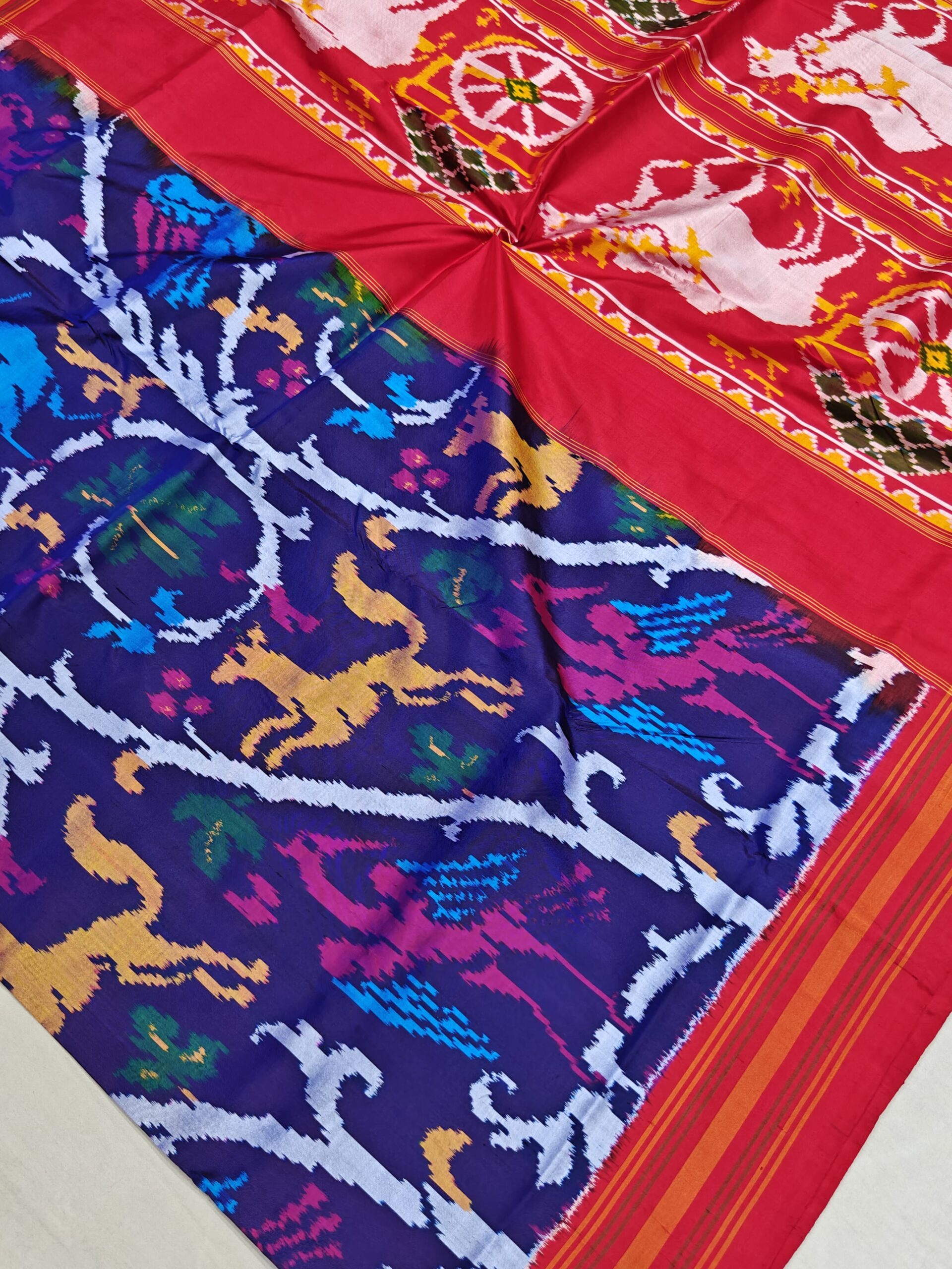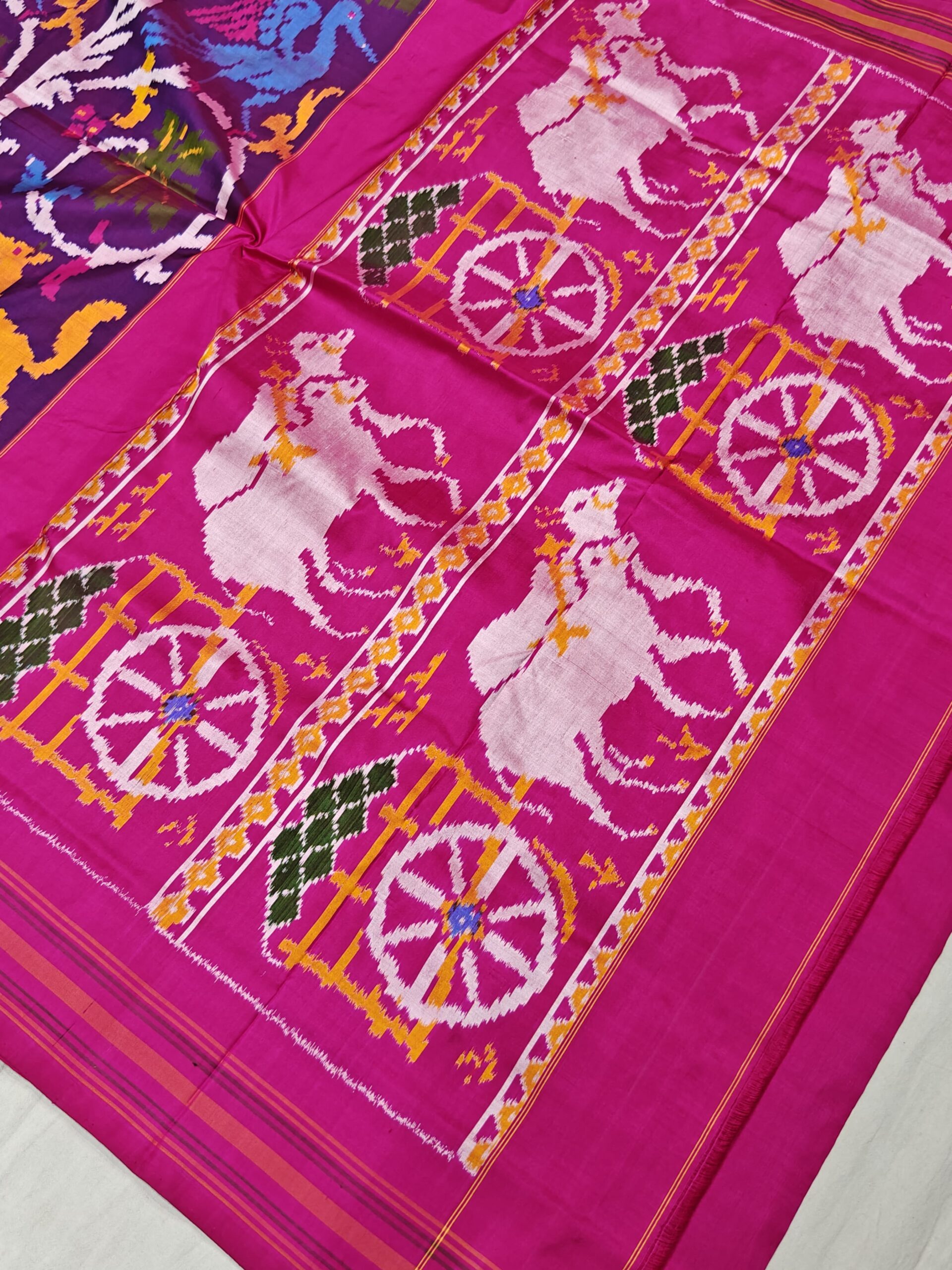 Each saree is carefully handwoven using premium-quality pure silk threads, offering a luxurious feel and graceful fall. The vibrant color combinations and symmetrical motifs make it a perfect choice for weddings, festive gatherings, and special occasions.