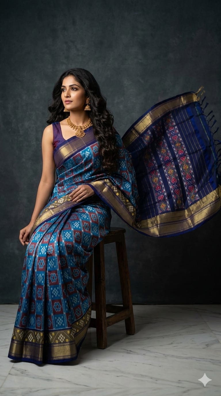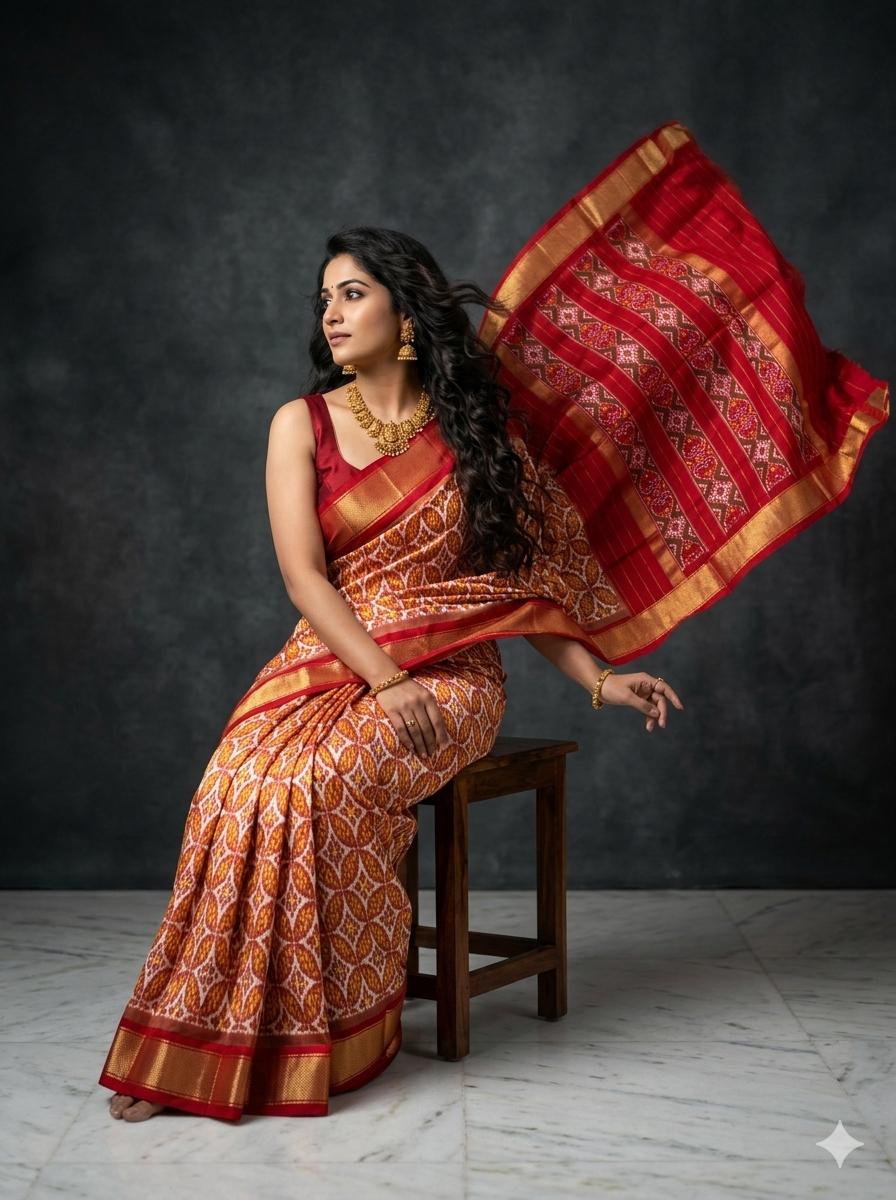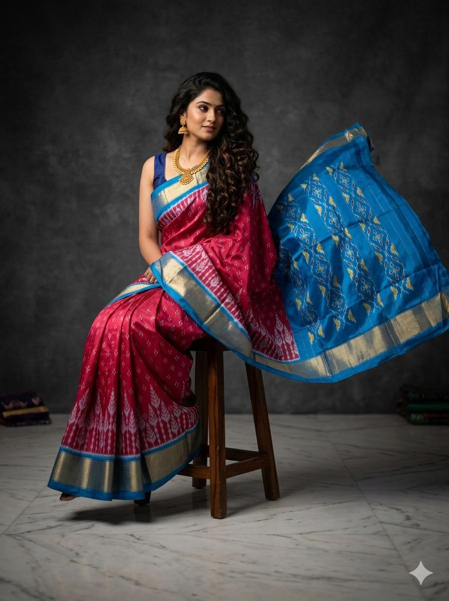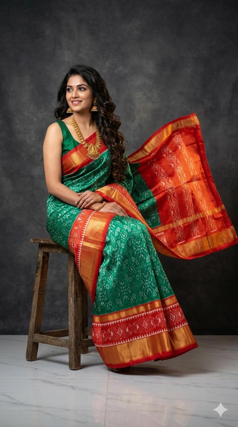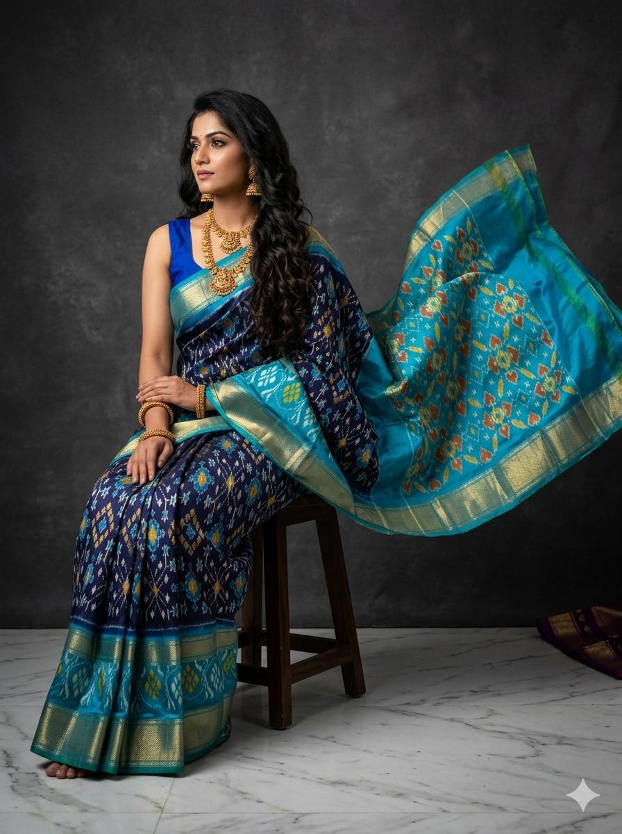 The Pochampally Pure Silk Saree is a symbol of South Indian weaving excellence. Originating from Bhoodan Pochampally, these sarees are famous for their intricate Ikat dyeing technique, where the yarns are tie-dyed before weaving to create stunning geometric and traditional patterns.