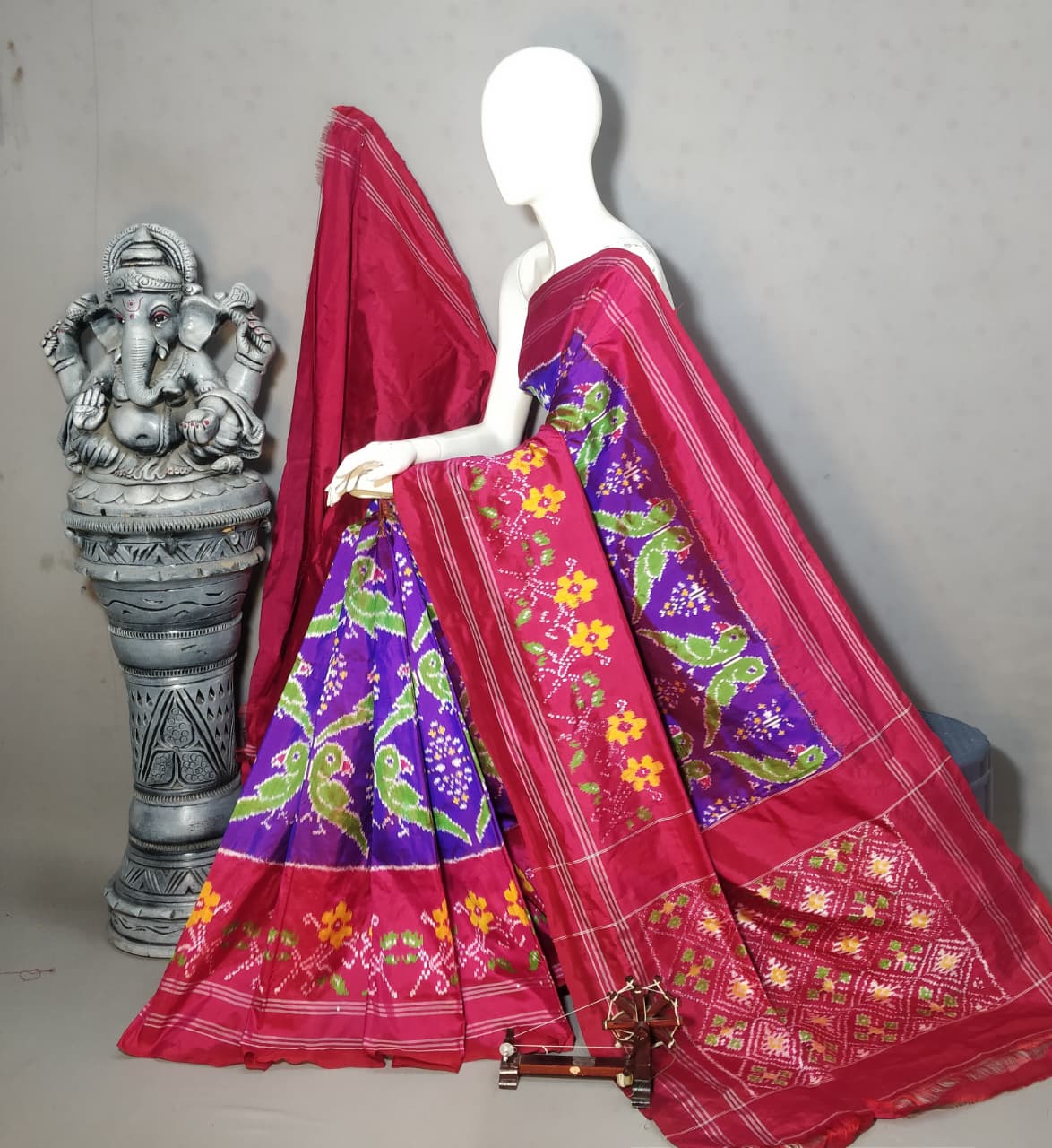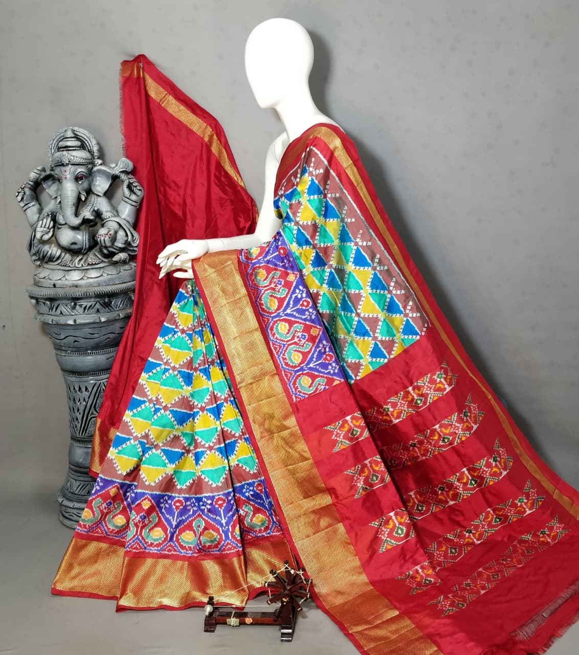 Each saree is carefully handwoven using premium-quality pure silk threads, offering a luxurious feel and graceful fall. The vibrant color combinations and symmetrical motifs make it a perfect choice for weddings, festive gatherings, and special occasions.