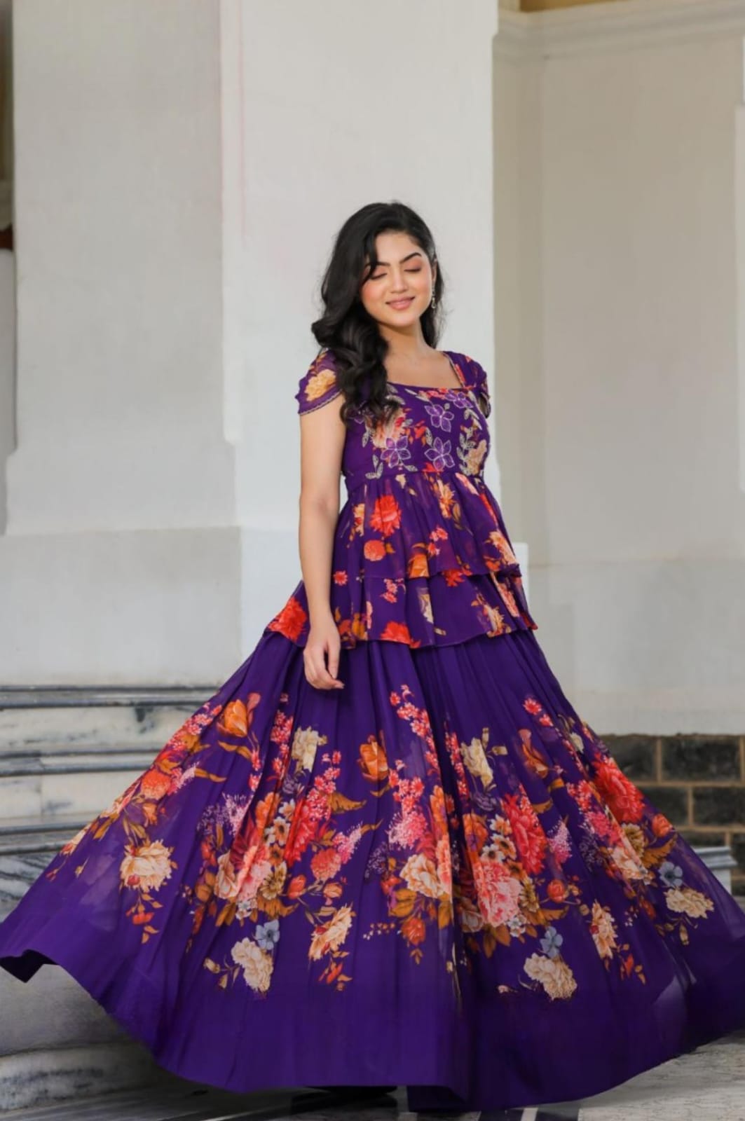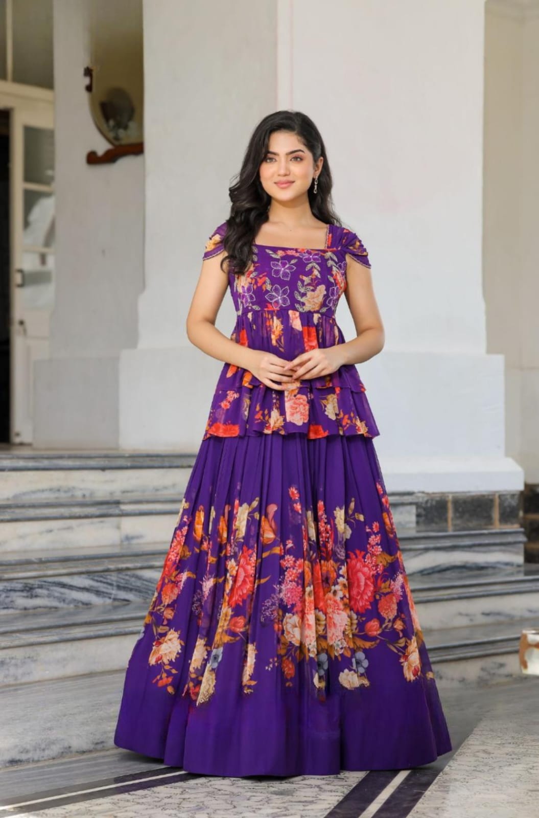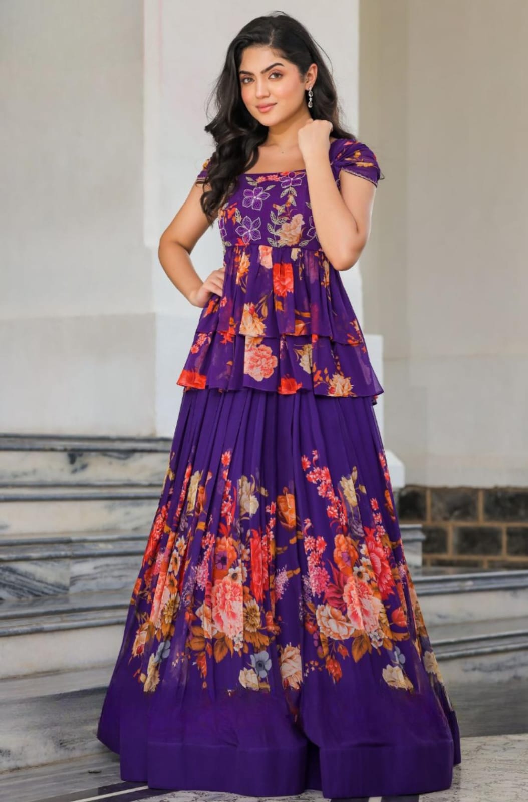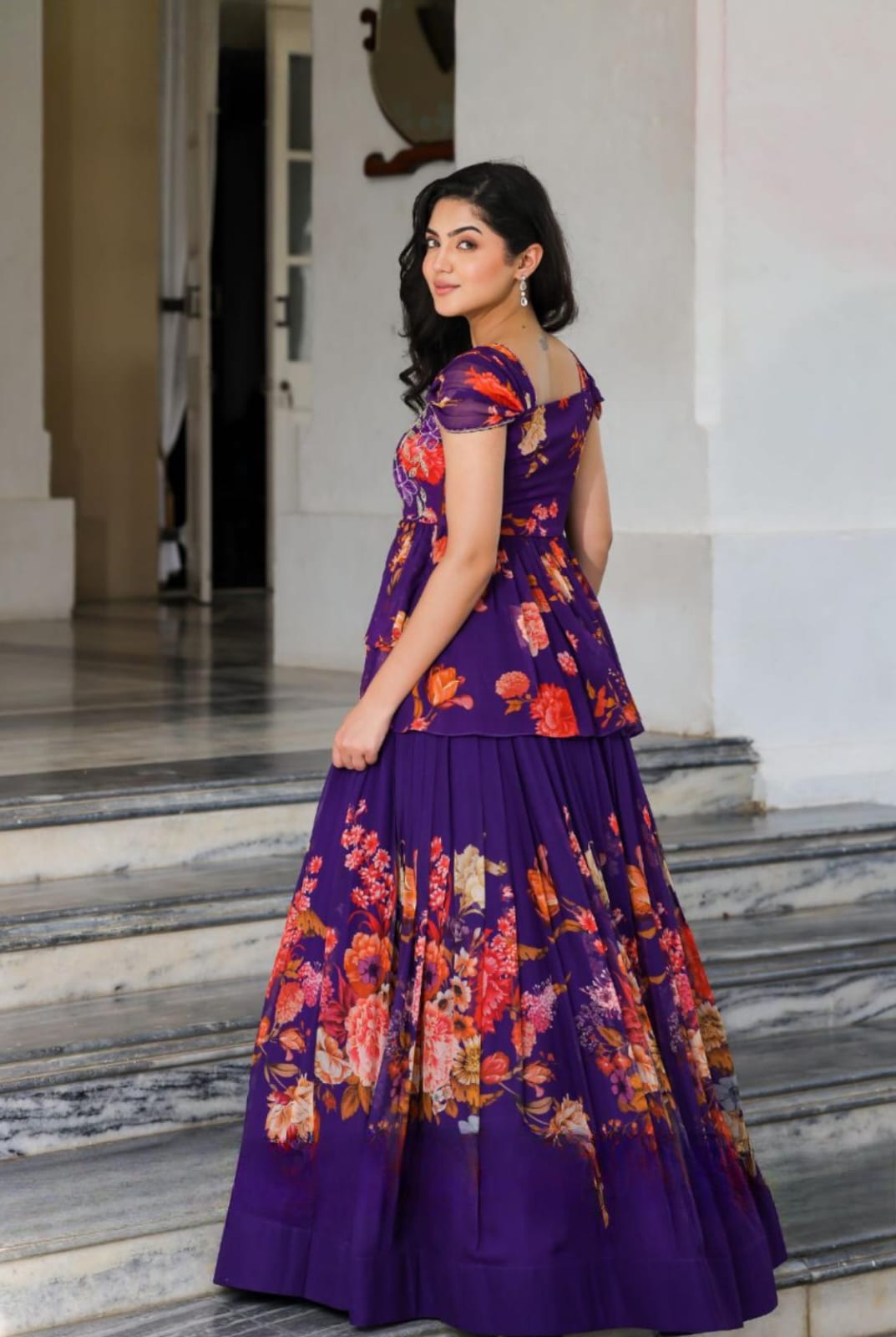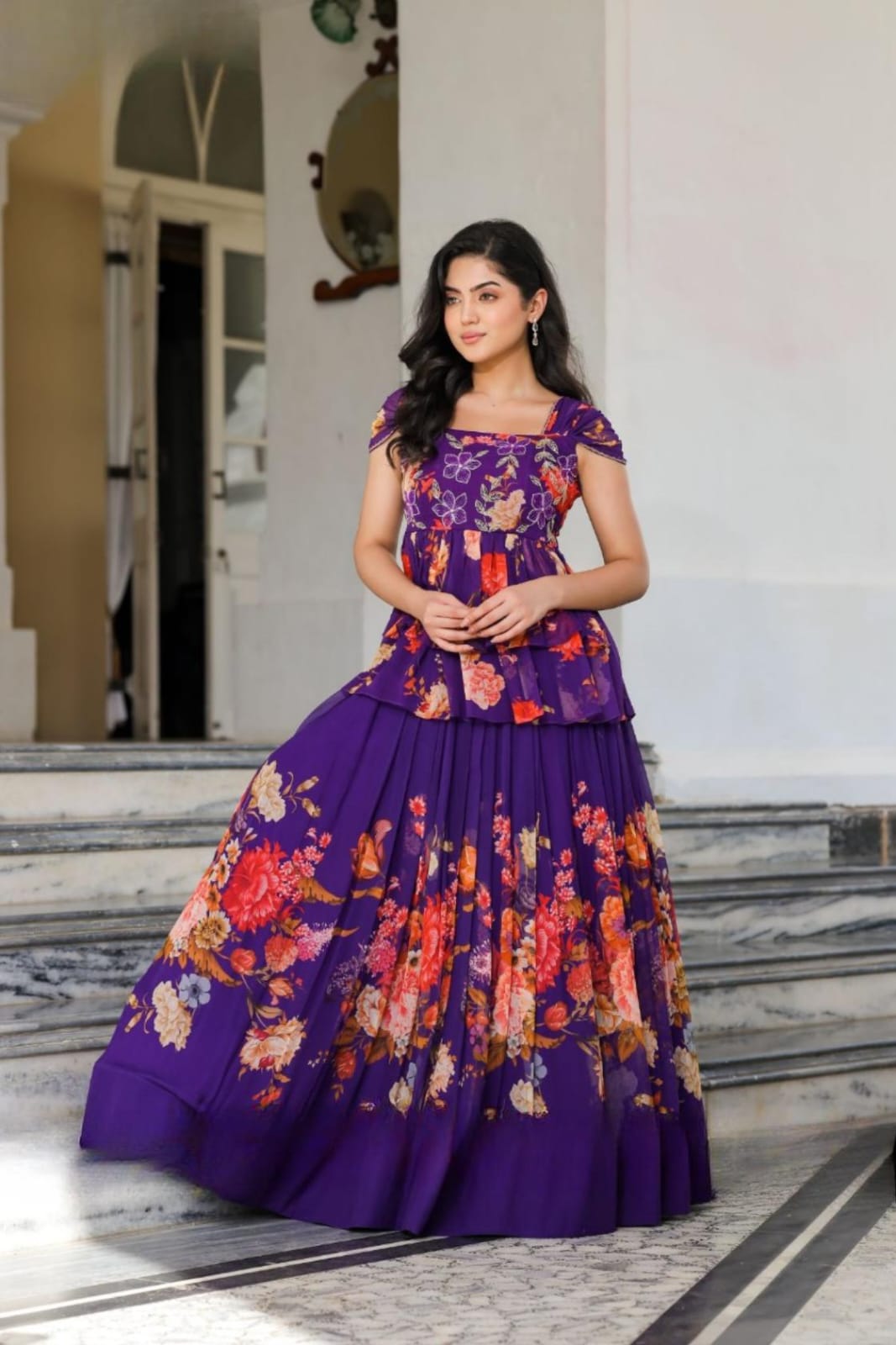 Discover your style in Purple in this Indo-Western outfit, designed with eye-catching floral patterns in red and peach. The bodice is crafted with floral hand embroidery and features a trendy top design with stylish sleeves, adding a modern touch. The layered peplum-style top introduces a contemporary twist to the traditional silhouette. Pair it with the flowing skirt embellished with large floral prints to create a dramatic and elegant look. I recommend you wear an accessory with pearl-crafted jewelry to complement the grace and charm of the outfit.