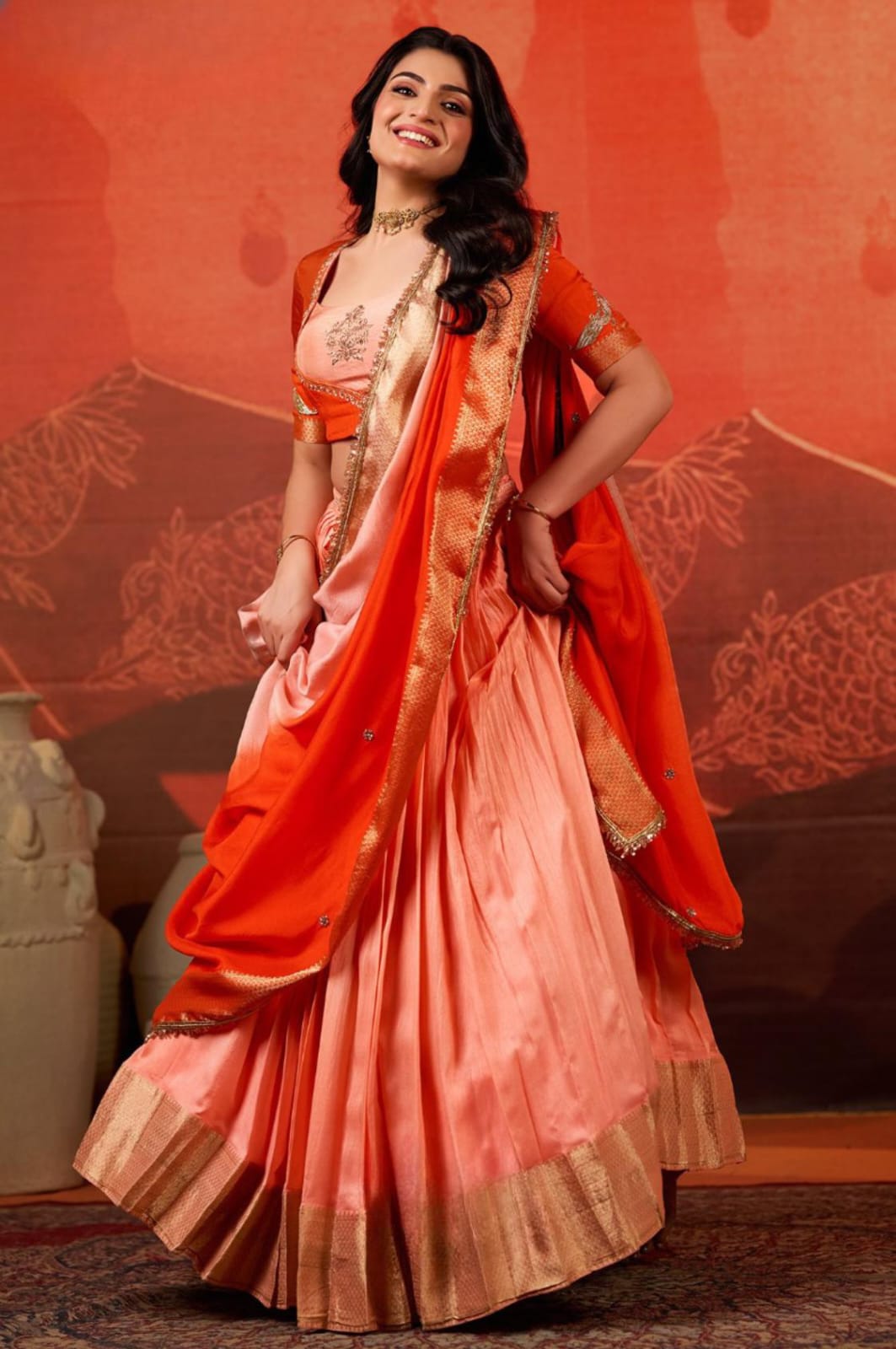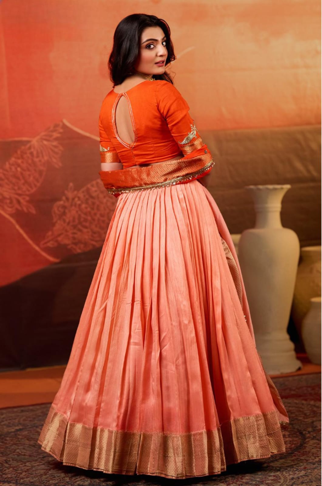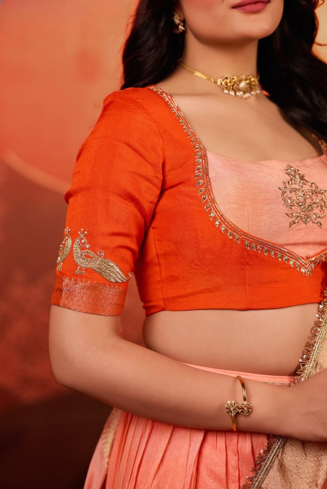 Where bold meets beautiful — this dual-tone Kaavya lehenga set brings charm with the richness of orange and soft peach. Designed for modern fashionista women, the blouse has a beautiful pitawork with peacock work on the sleeves and an open oval on the back. The skirt is peach in color with a golden zari border on it. The ombre shade lightweight dupatta with embroidery butti work, this is the best piece who love tradition and a stylish look in one. Made to turn ordinary moments into timeless memories.