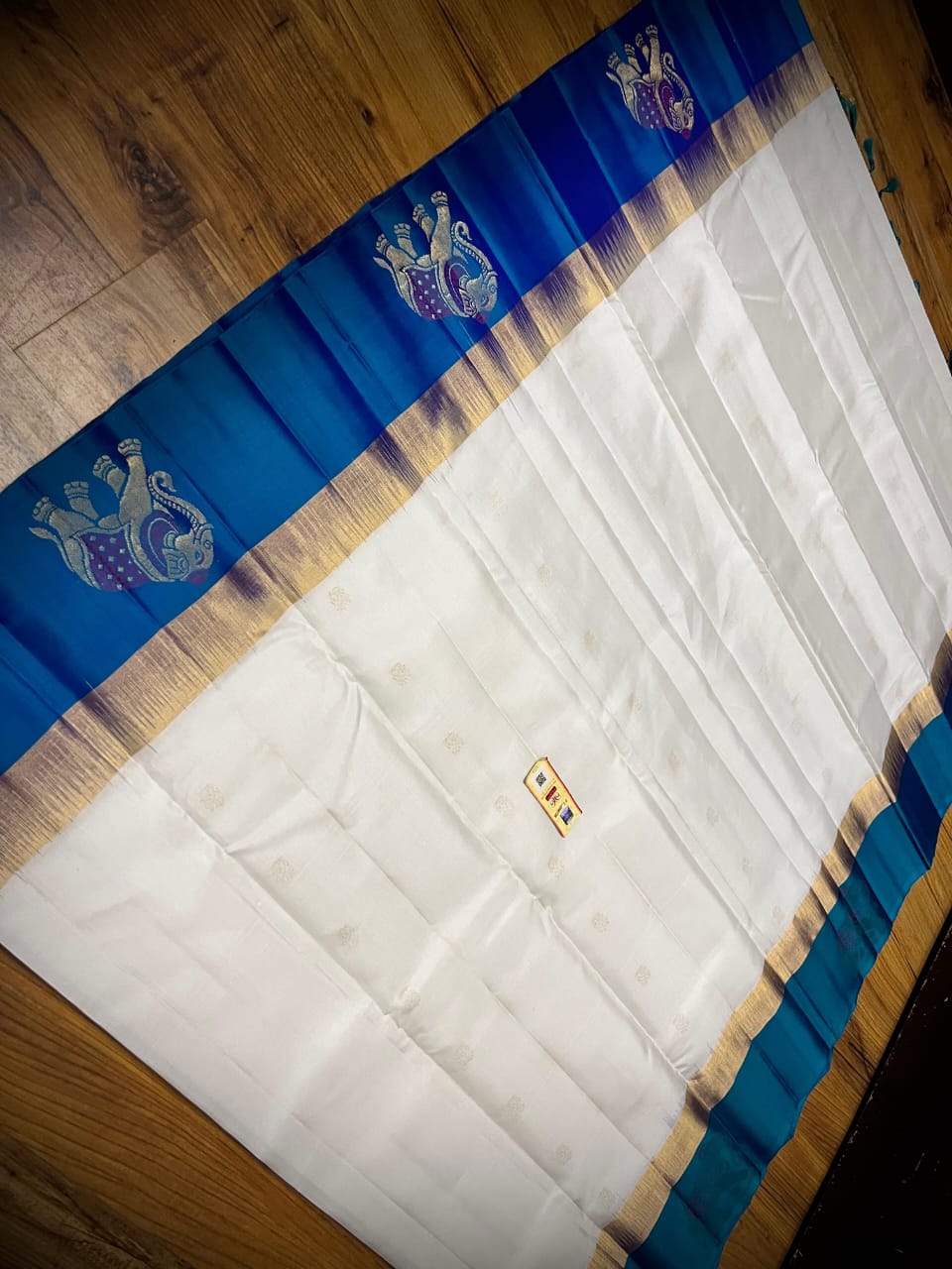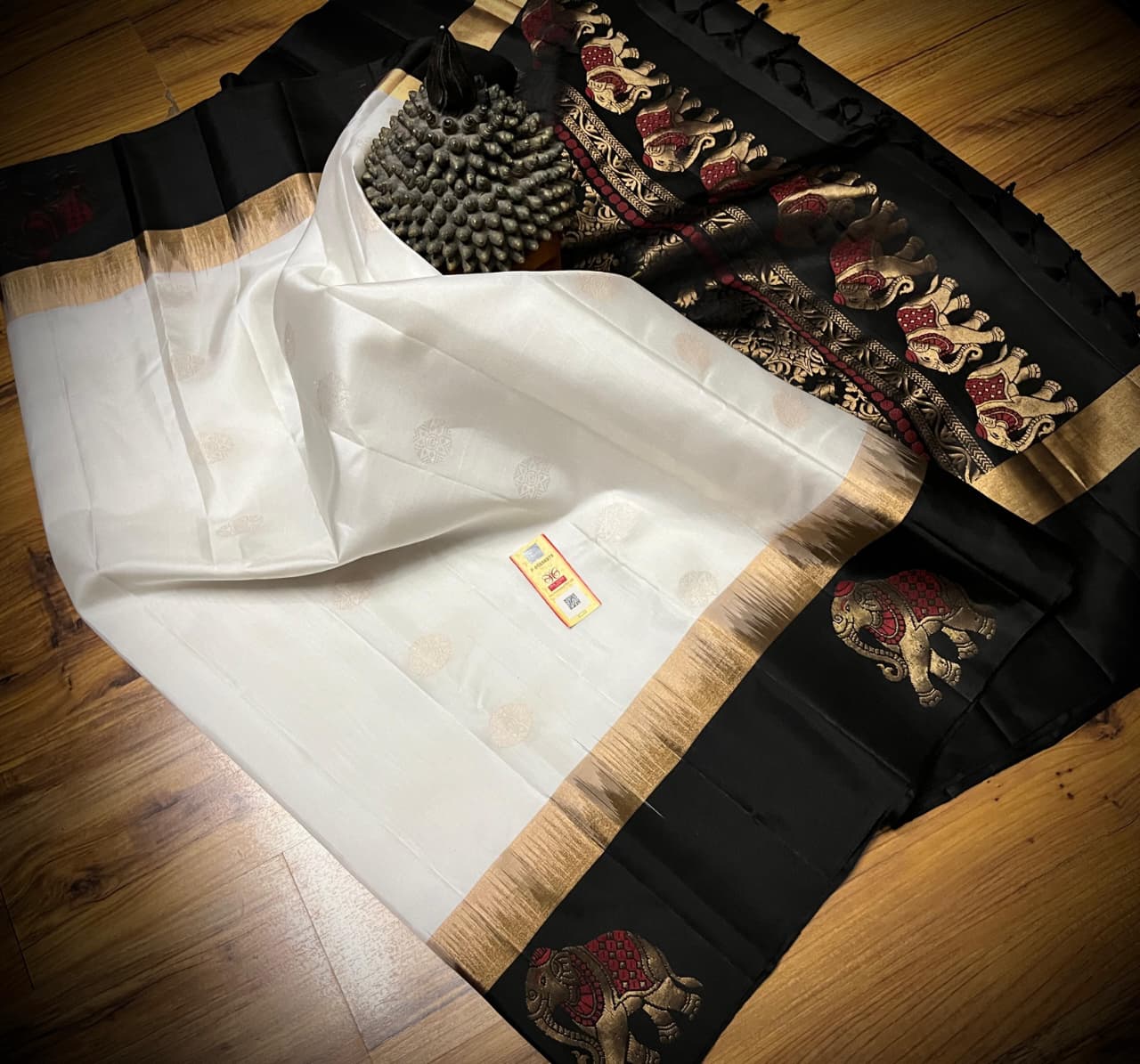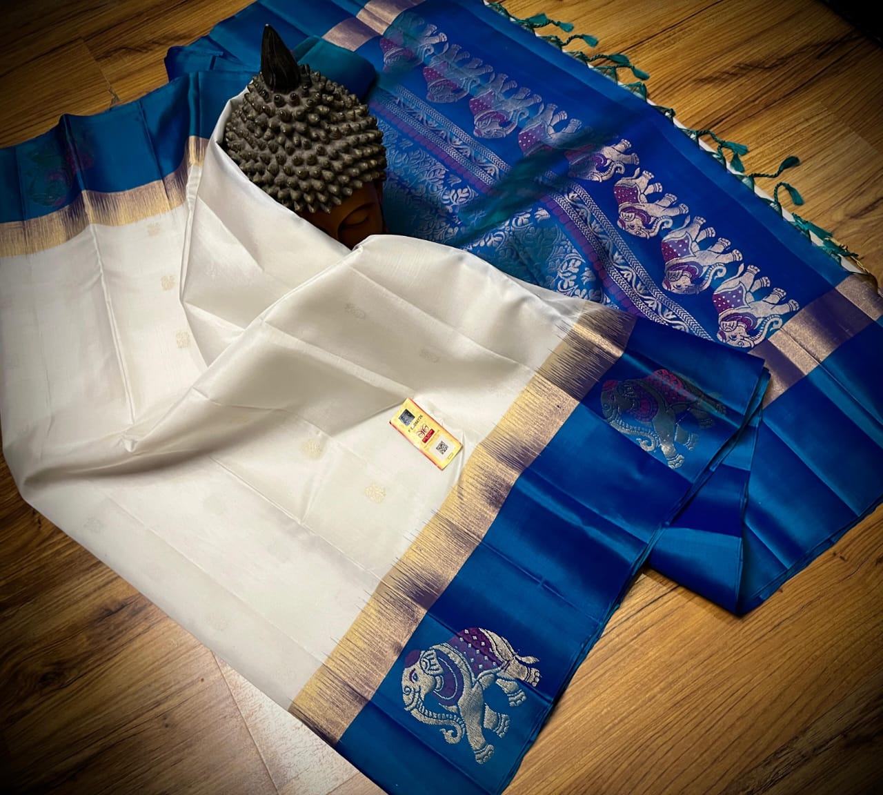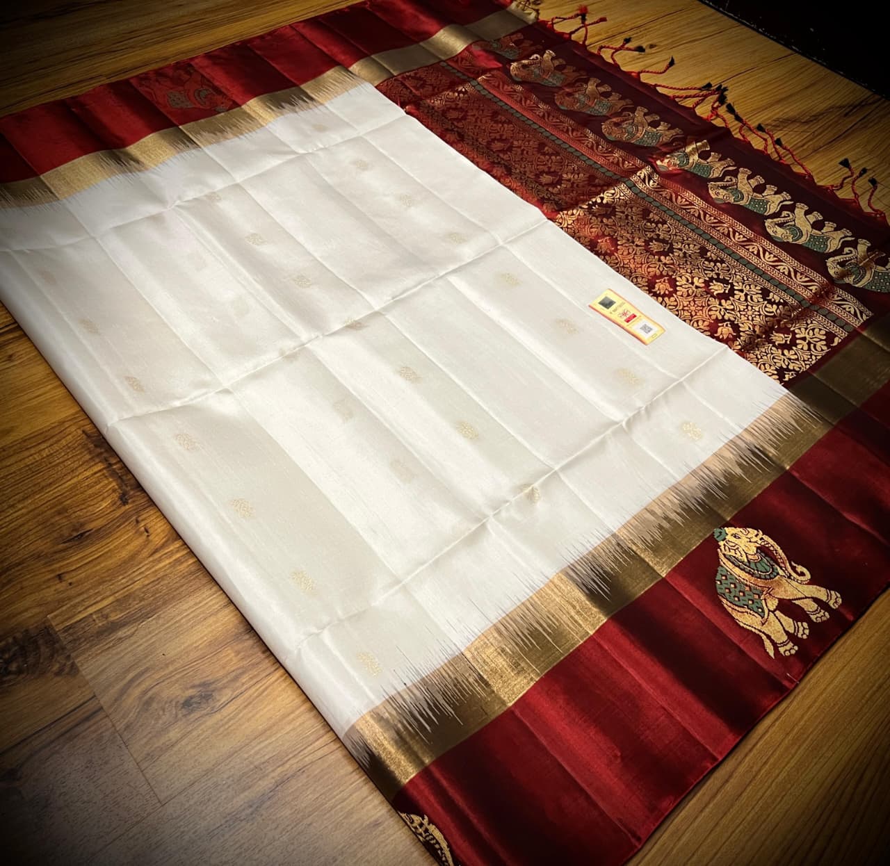 Kanchipuram pure soft silk sarees *Kanchipuram pure silk* Handloom weaving Lightweight pure silk 100% Handloom 100% pure pattu *Beautiful, unique colour combo crafted in pure silk* Side Butta concept Jarie weaving Butta on body and the border Both borders have side Butta weaving Contrast the rich pallu and blouse