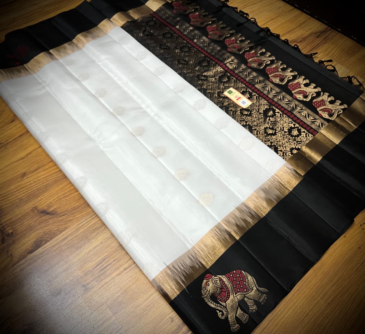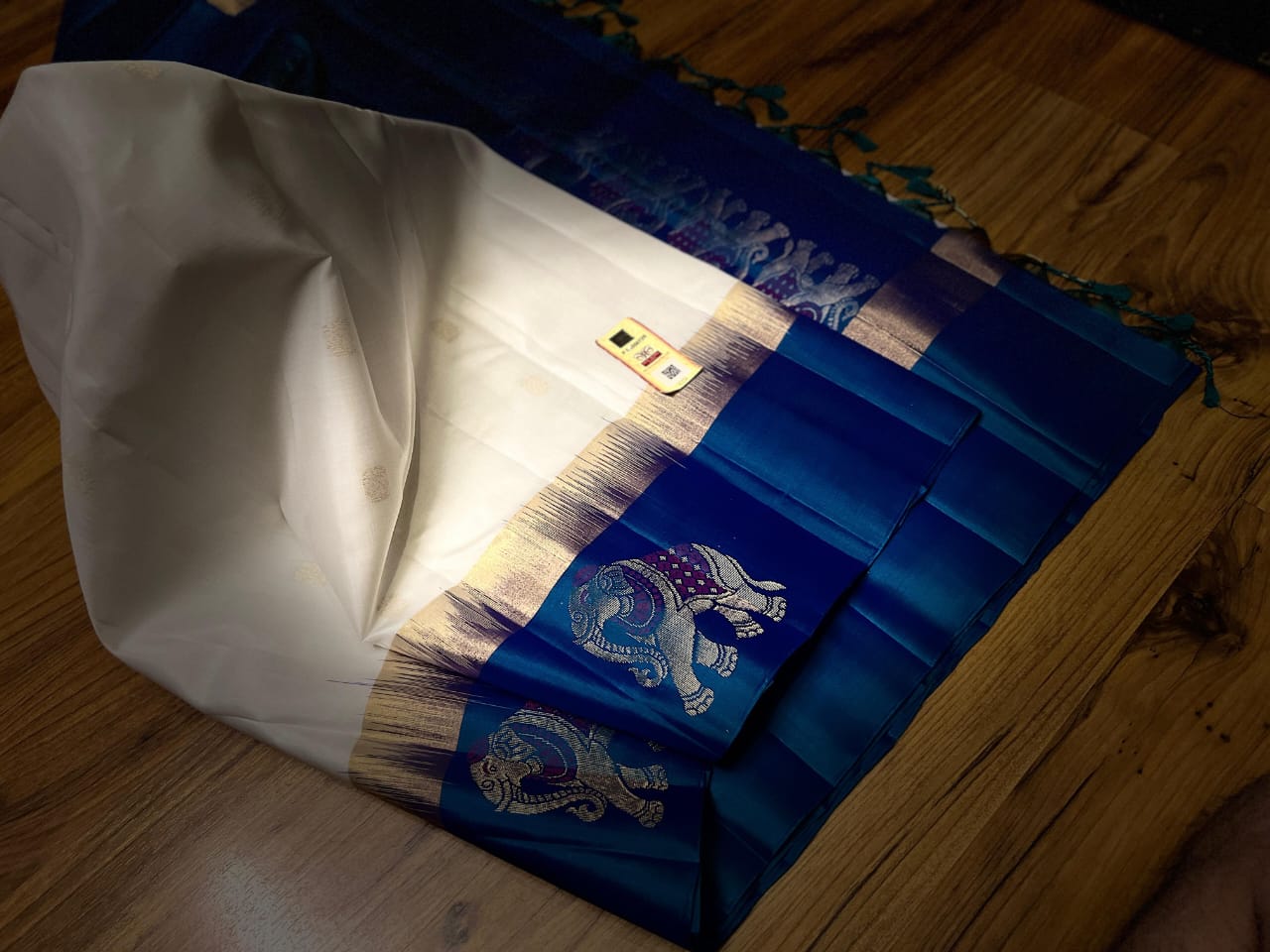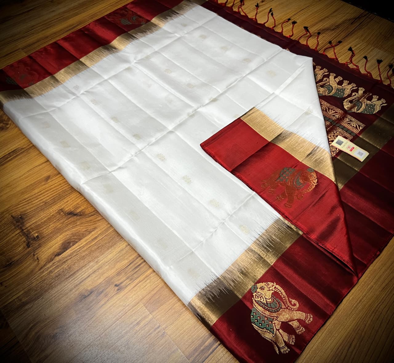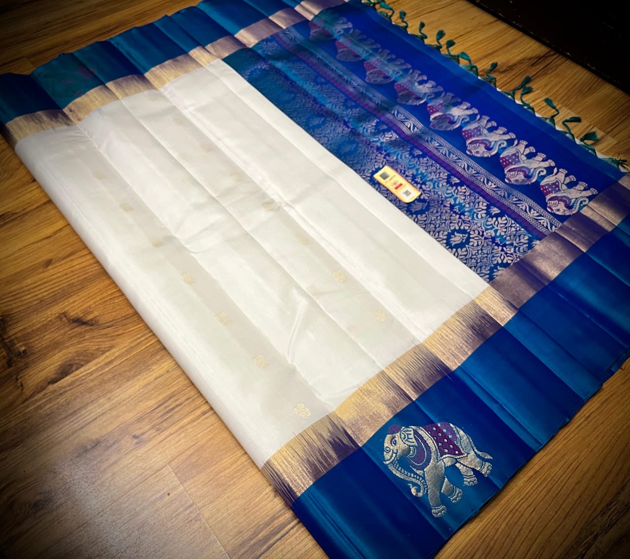 Kanchipuram pure soft silk sarees *Kanchipuram pure silk* Handloom weaving Lightweight pure silk 100% Handloom 100% pure pattu *Beautiful, unique colour combo crafted in pure silk* Side Butta concept Jarie weaving Butta on body and the border Both borders have side Butta weaving Contrast the rich pallu and blouse