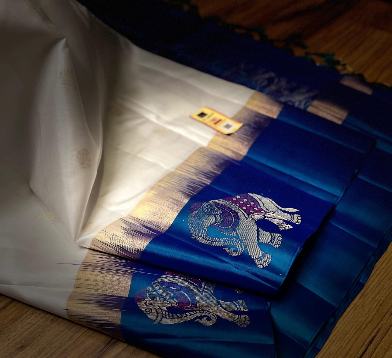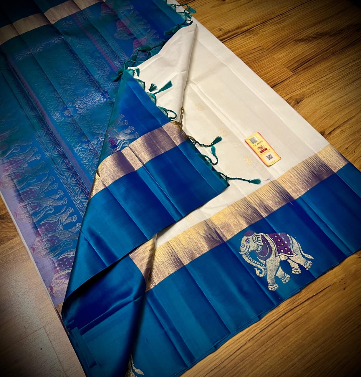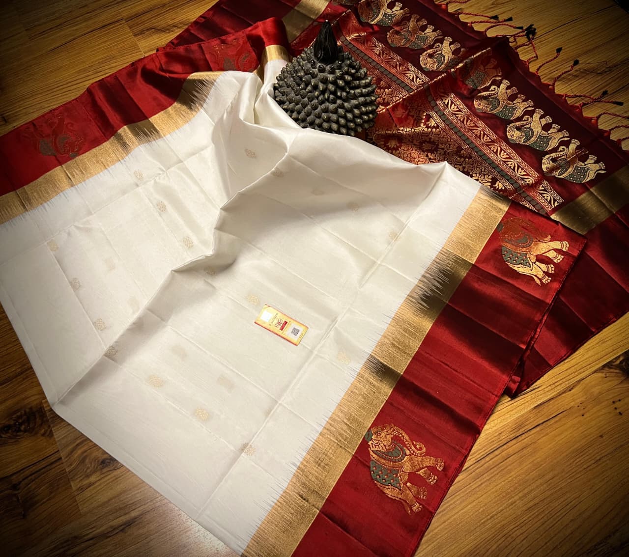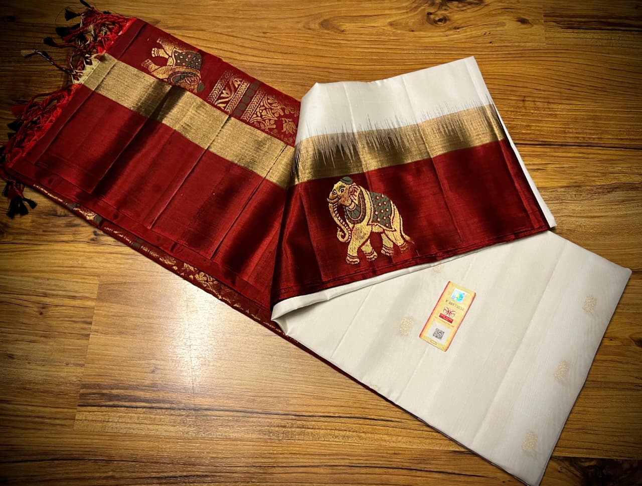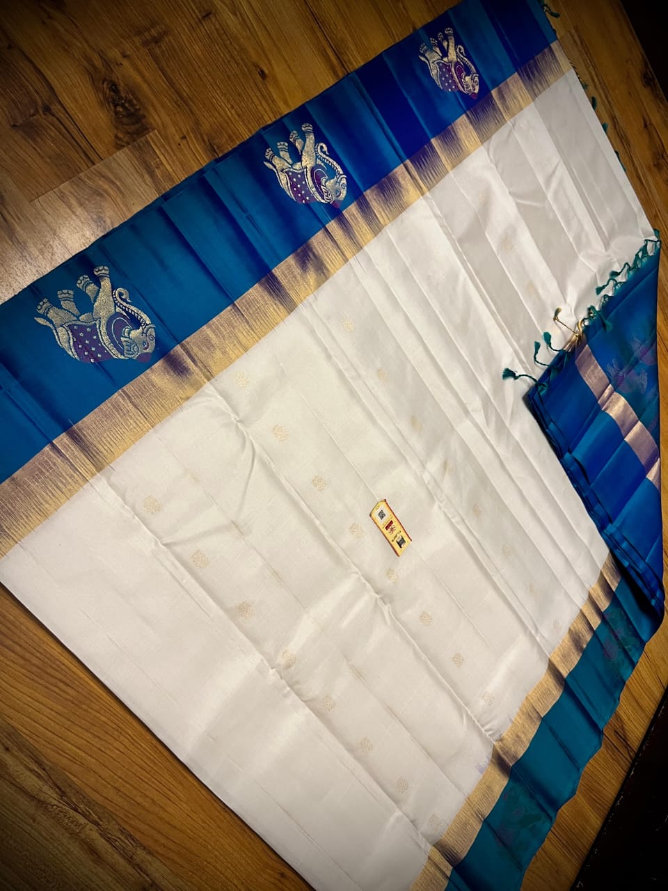 Kanchipuram pure soft silk sarees *Kanchipuram pure silk* Handloom weaving Lightweight pure silk 100% Handloom 100% pure pattu *Beautiful, unique colour combo crafted in pure silk* Side Butta concept Jarie weaving Butta on body and the border Both borders have side Butta weaving Contrast the rich pallu and blouse