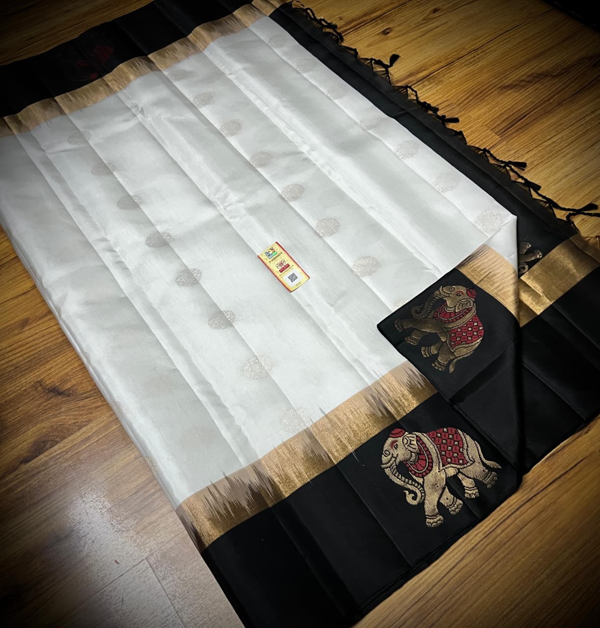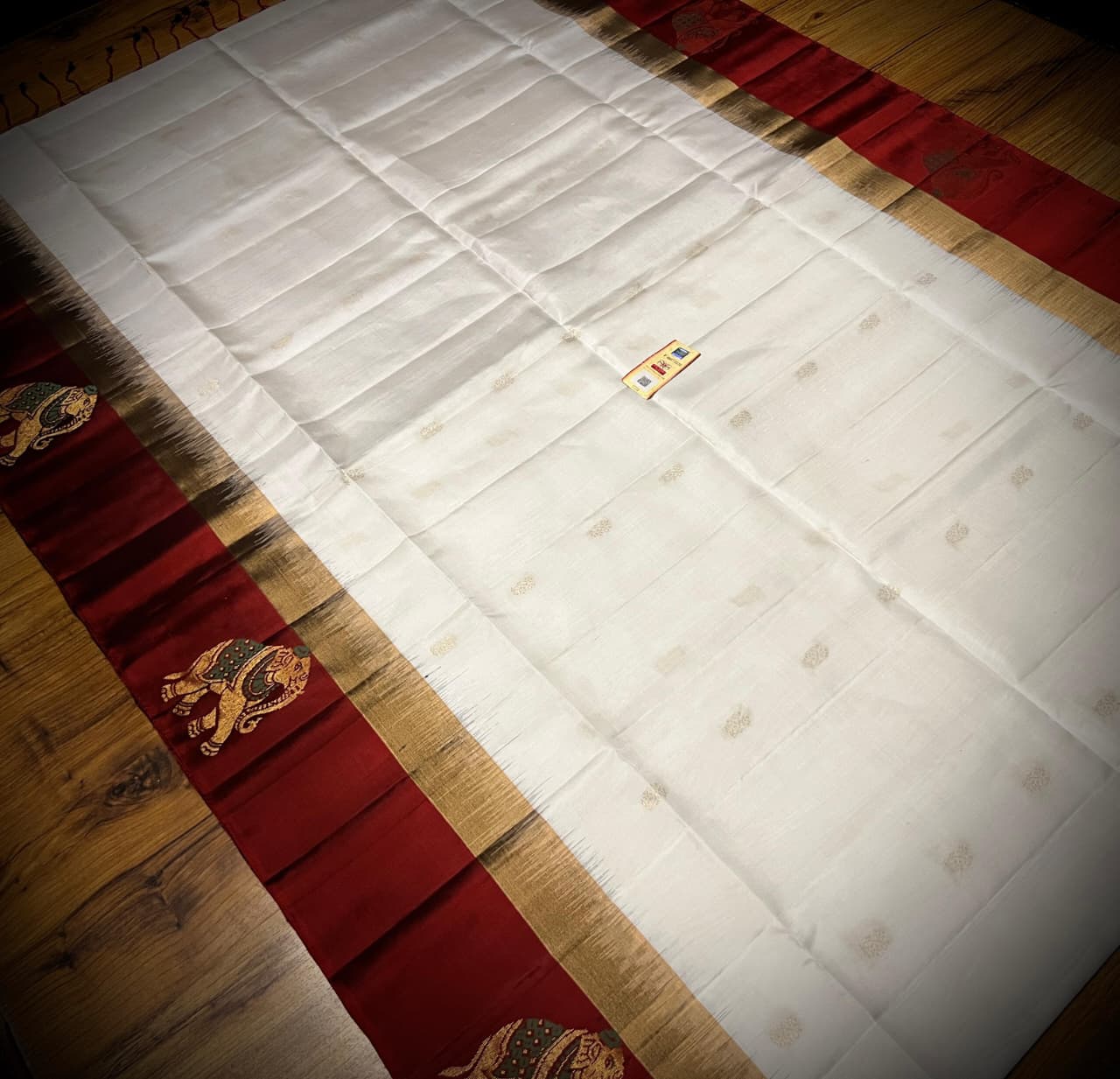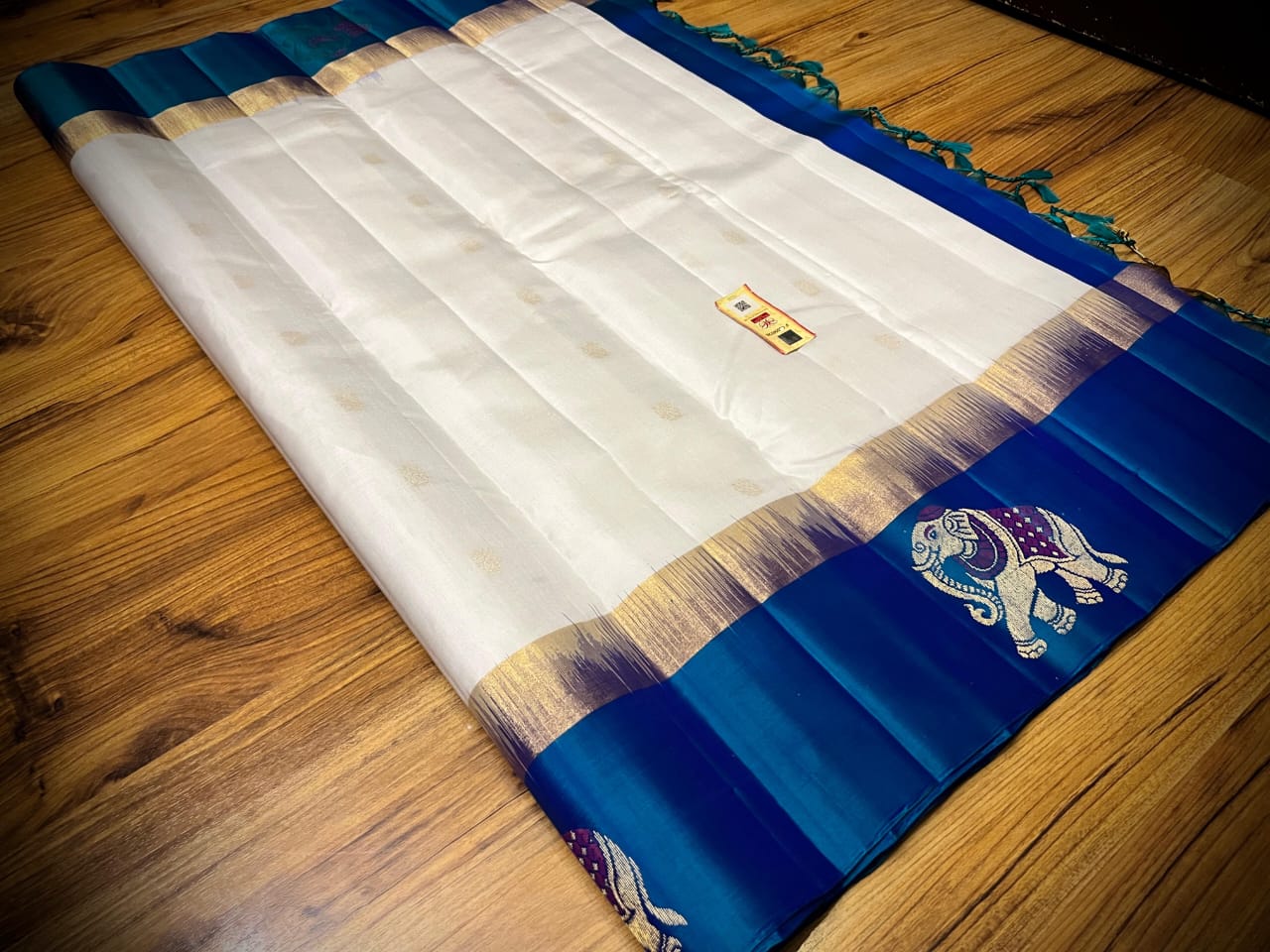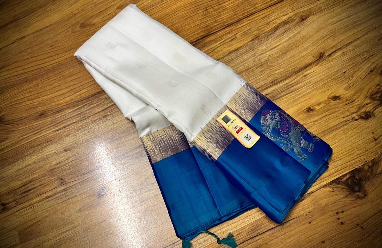 Kanchipuram pure soft silk sarees *Kanchipuram pure silk* Handloom weaving Lightweight pure silk 100% Handloom 100% pure pattu *Beautiful, unique colour combo crafted in pure silk* Side Butta concept Jarie weaving Butta on body and the border Both borders have side Butta weaving Contrast the rich pallu and blouse
