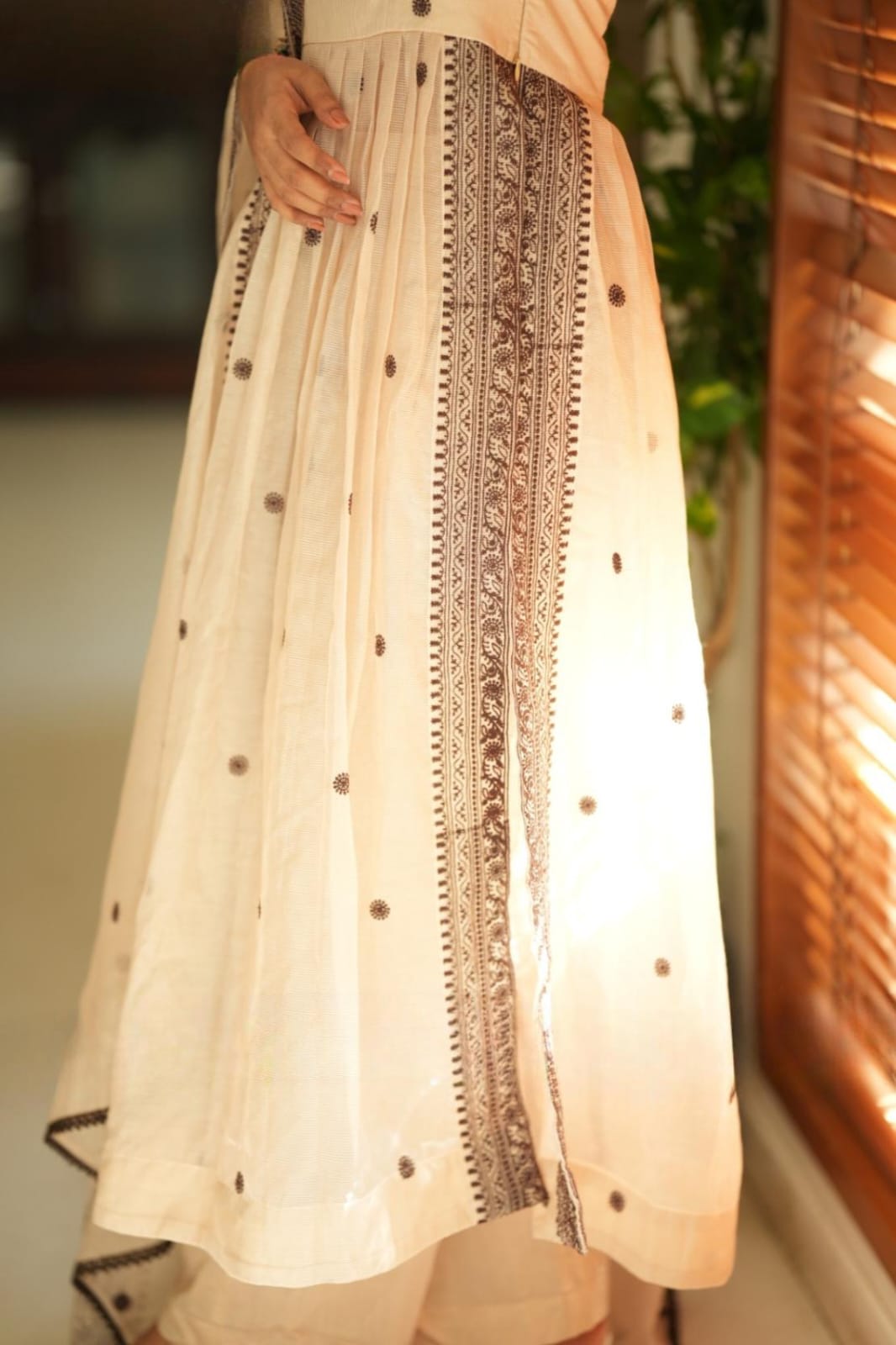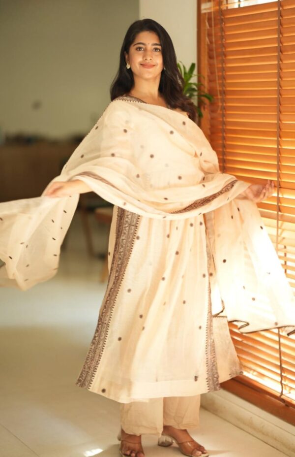 Step into timeless elegance with this Vanilla Kota Doria Naira Cut Kurta Set, a perfect blend of ethnic charm and contemporary flair. Made from airy Kota Doria fabric, this set ensures all-day comfort without compromising on sophistication. Designed in a flattering Naira cut silhouette, the kurta features intricate machine embroidery work—delicate motifs gracefully scattered across the body, and bold embroidered panels enhancing the sides and dupatta. The soft vanilla shade radiates subtle charm, making it a versatile pick for festive mornings, casual gatherings, or traditional celebrations. Embrace quality craftsmanship in a silhouette that’s both traditional and on-trend.