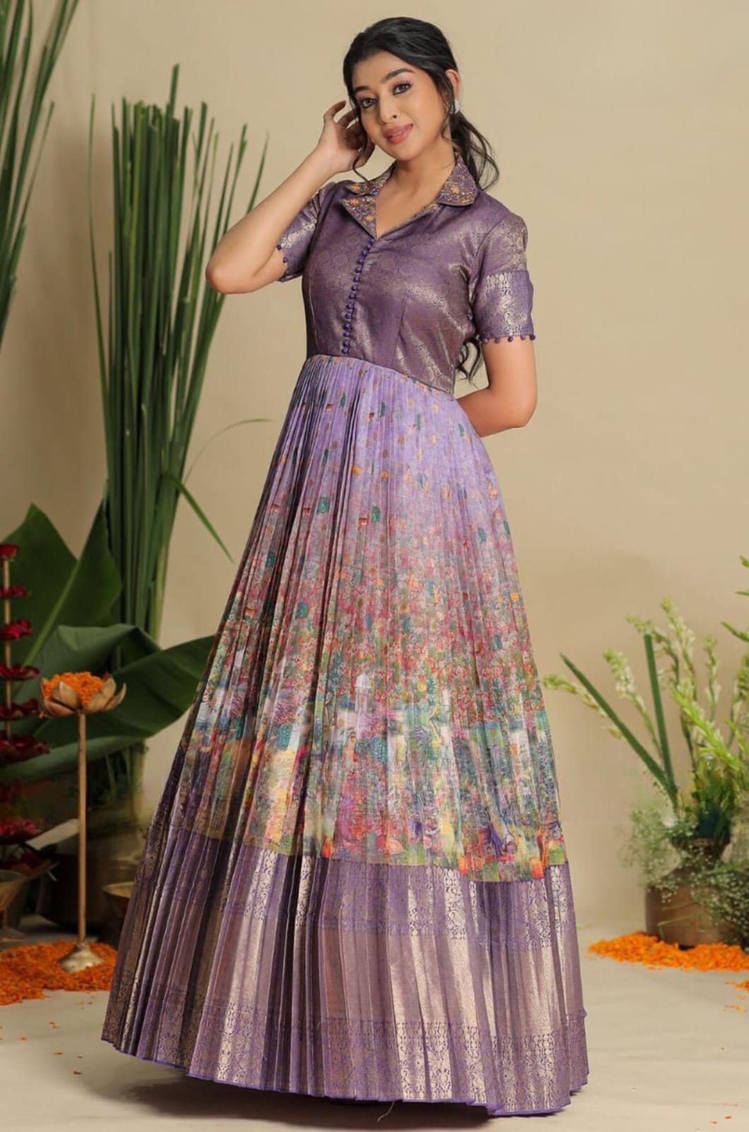 Luxury is at its best with this contemporary Kota Zari Pattu dress in lavender. It showcases elegant potli details on the yoke and one sleeve. The modern collar neckline features intricate hand embroidery, giving the entire dress a royal look. The broad Pattu border on the flair is adorned with a pleated floral print, adding a touch of elegance to this exquisite piece.